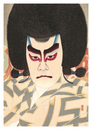 This poster features "Ichikawa Sadanji in the role of Narukami," a 1926 woodblock print by Natori Shunsen. The traditional Yakusha-E style presents a bold portrayal with striking red and blue makeup on a stern face. The actor's elaborate kimono showcases intricate patterns, while the black coiffure adds dramatic impact, capturing the essence of Japanese theatrical artistry.