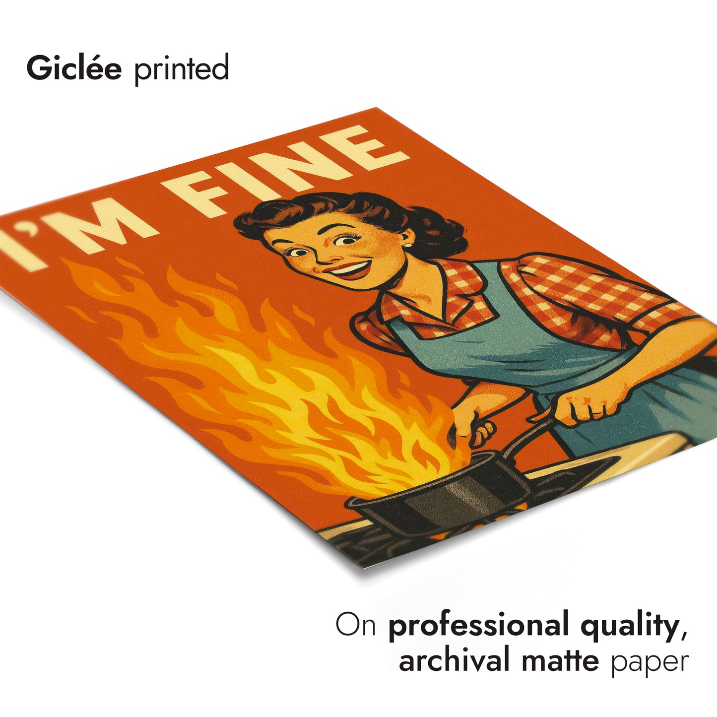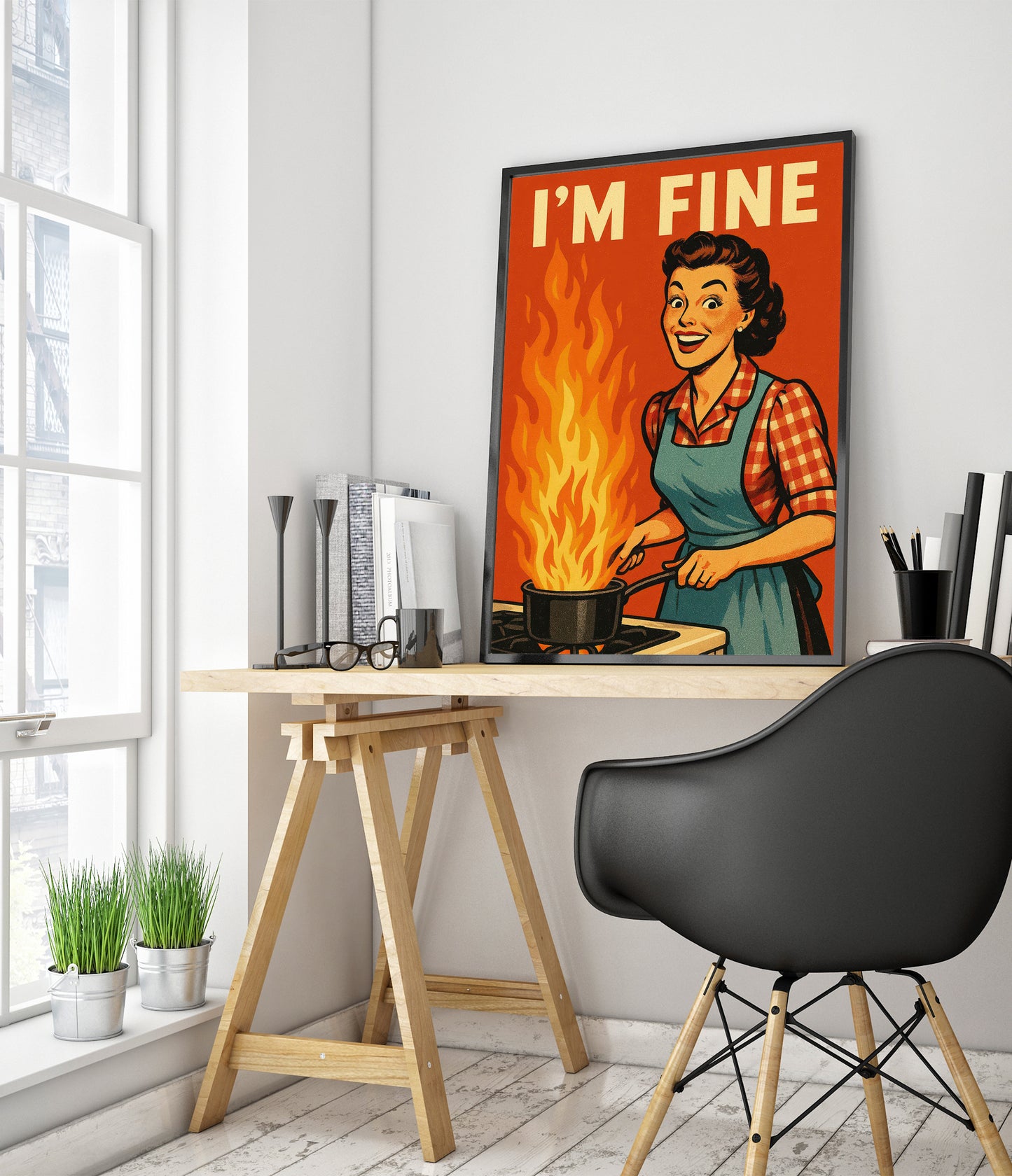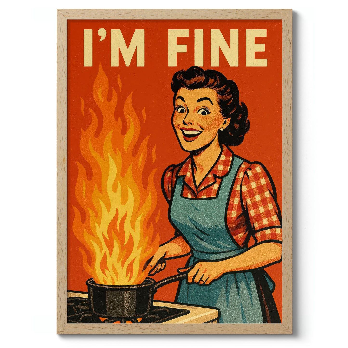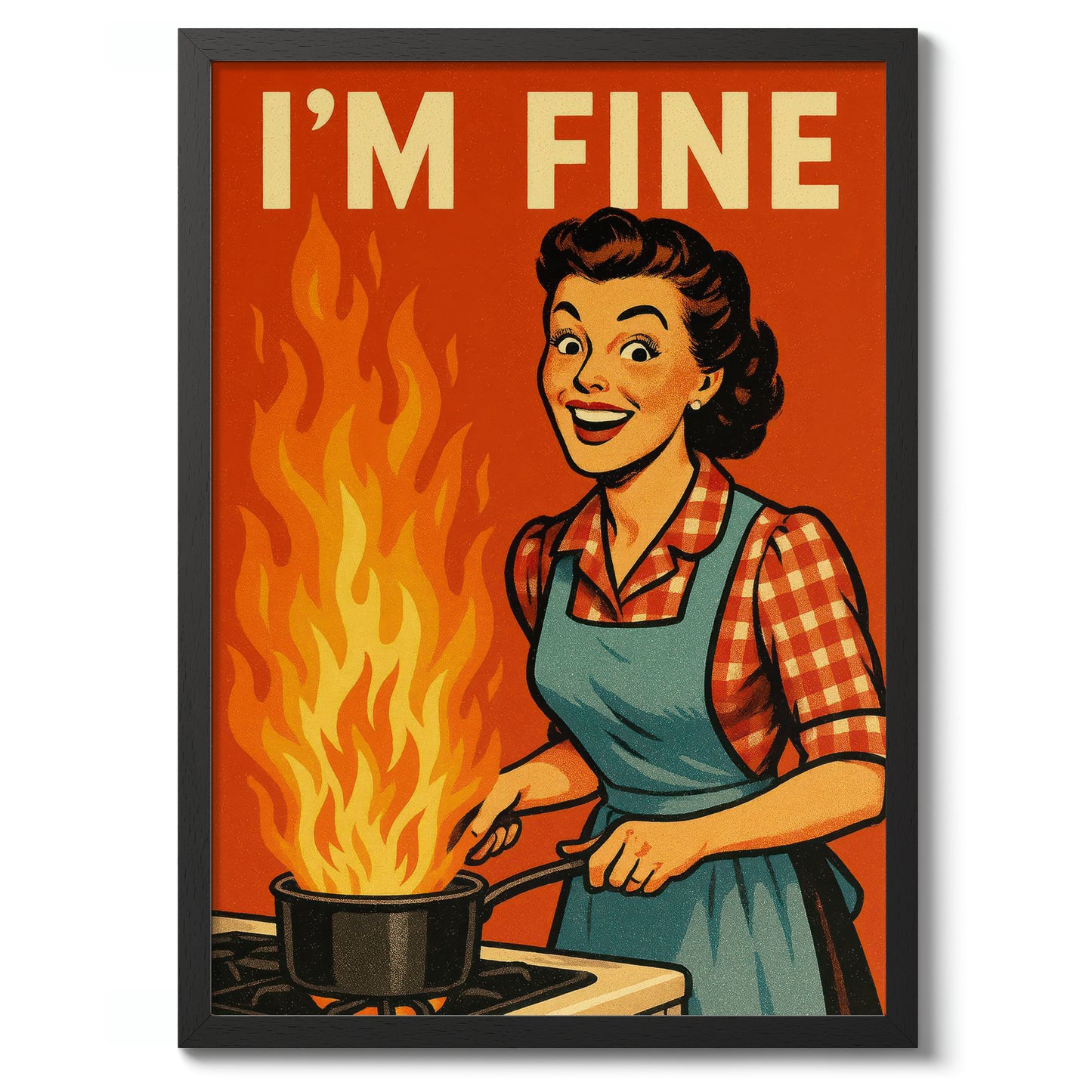 This vintage-style poster humorously depicts a cheerful woman in a checkered shirt and blue apron, standing in a kitchen with a pot engulfed in flames. The bold text reads, "I'M FINE," adding a comedic twist to the retro scene. The vibrant orange background enhances the graphic and typographic design, making it a perfect choice for lovers of funny, retro-themed art.