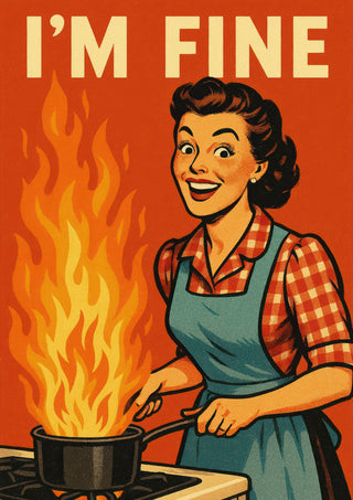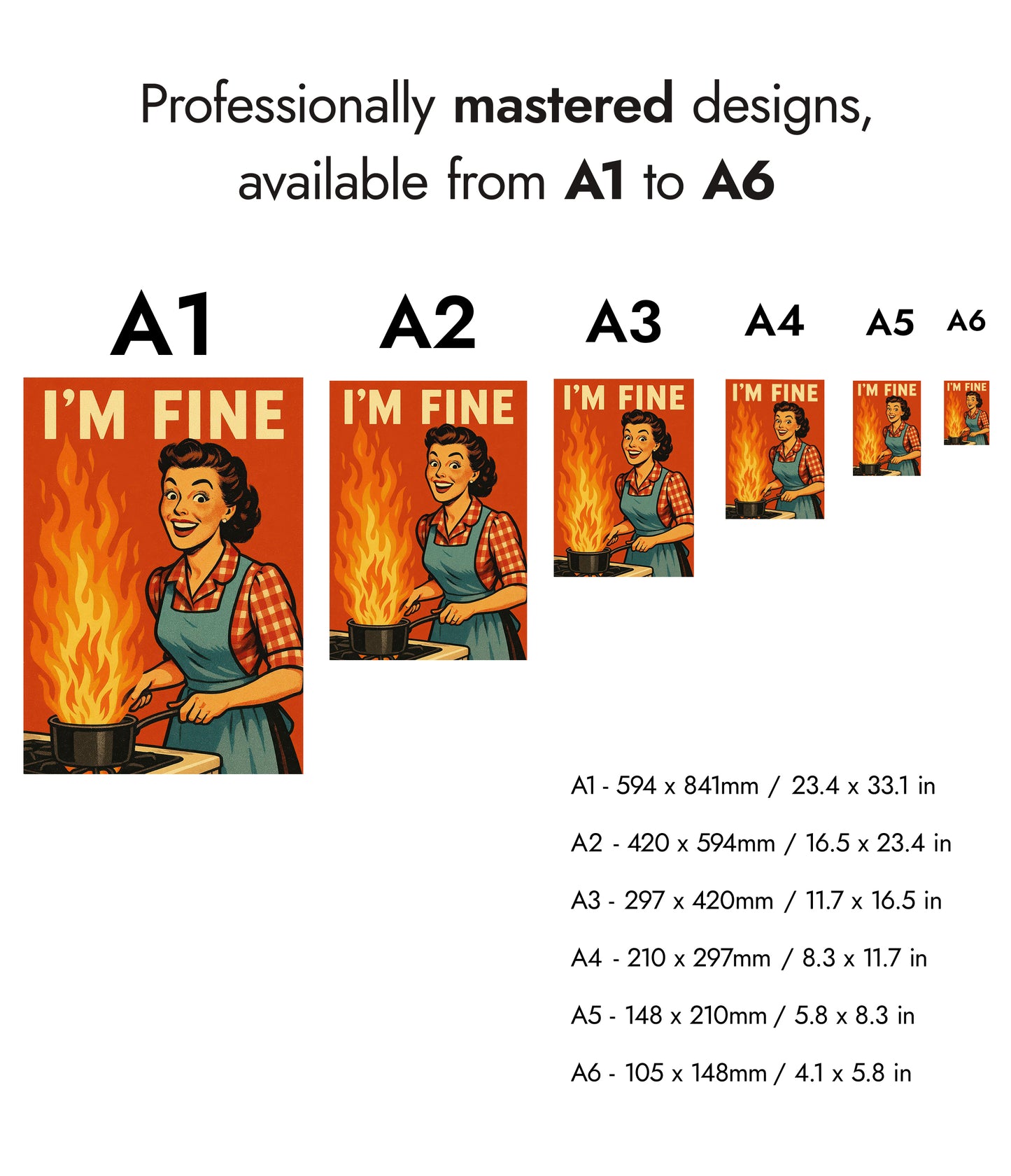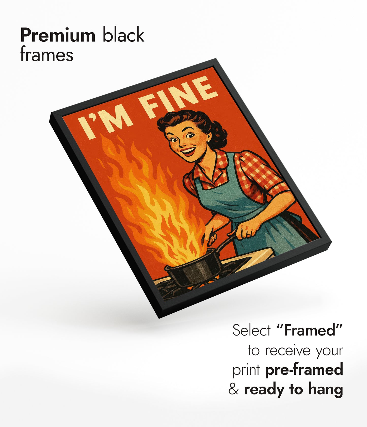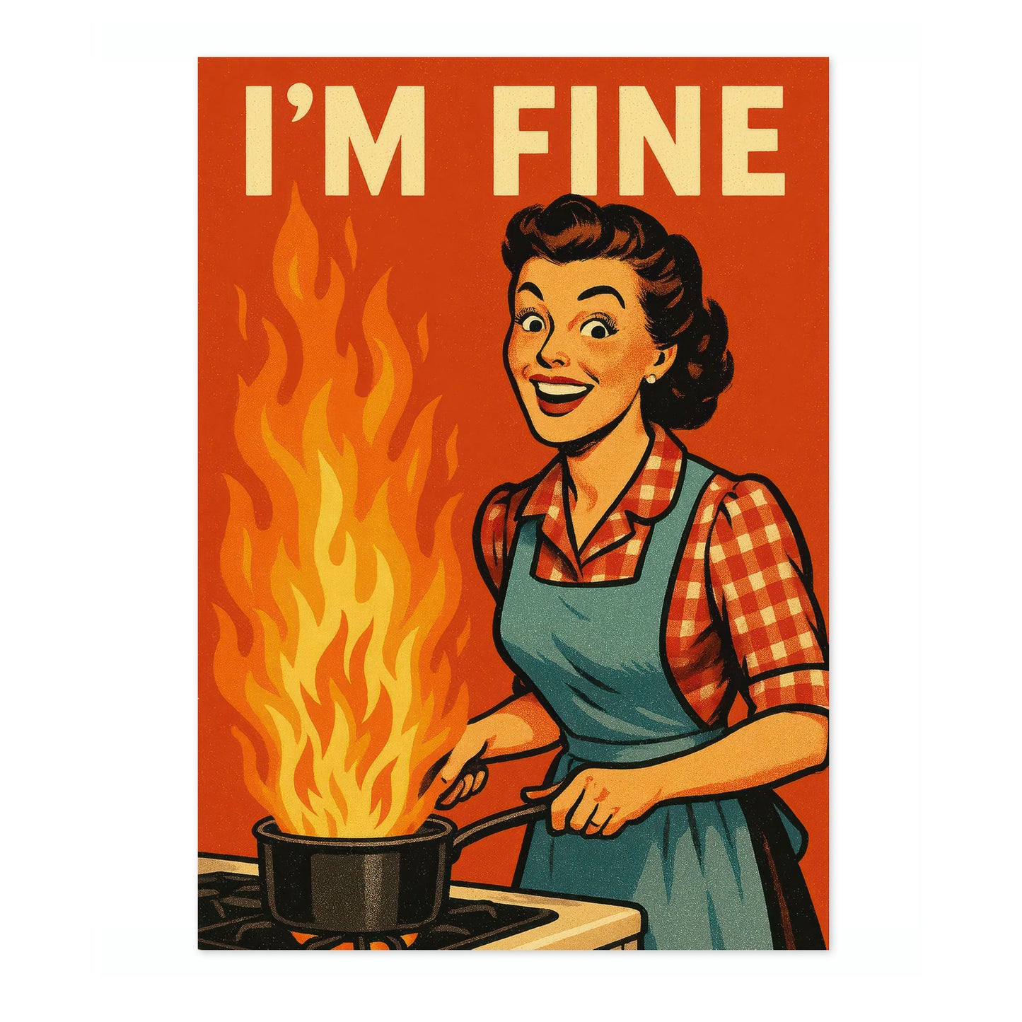 This vintage-style poster humorously depicts a cheerful woman in a checkered shirt and blue apron, standing in a kitchen with a pot engulfed in flames. The bold text reads, "I'M FINE," adding a comedic twist to the retro scene. The vibrant orange background enhances the graphic and typographic design, making it a perfect choice for lovers of funny, retro-themed art.