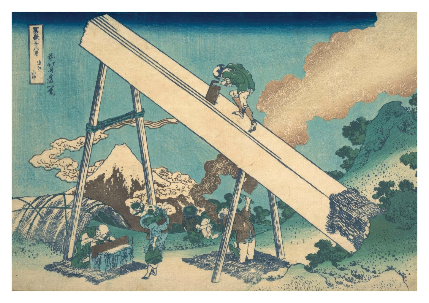 "In the Mountains of Totomi Province" is a captivating woodblock poster by Katsushika Hokusai. Highlighting traditional Japanese ukiyo-e style, the artwork portrays dynamic scenes of labor against a backdrop of misty mountains, dense forests, and drifting smoke. This detailed landscape illustration adds an exquisite touch of cultural elegance to any space. Ideal for lovers of classic Japanese art.