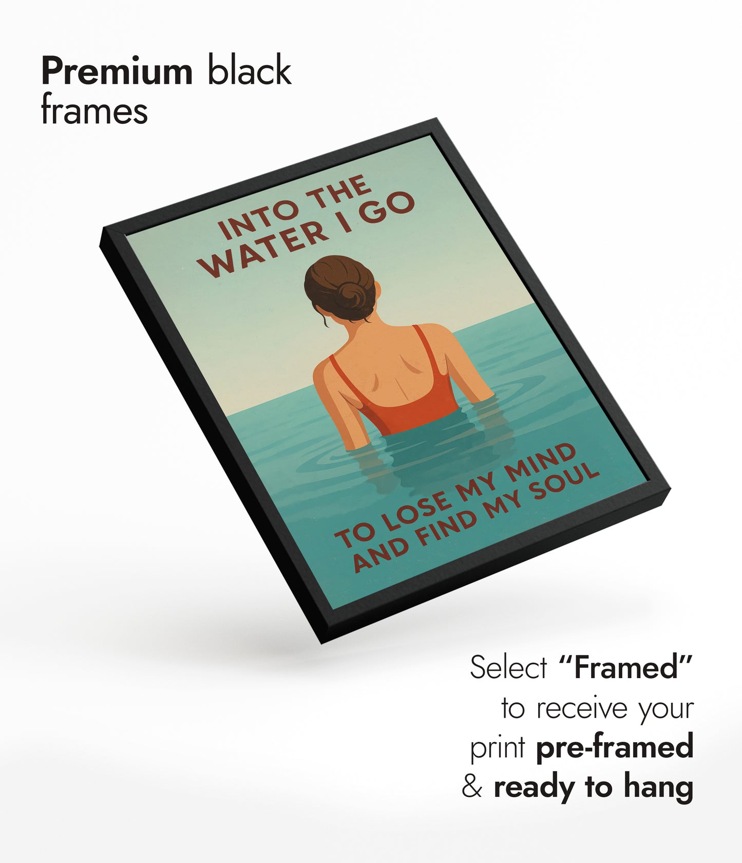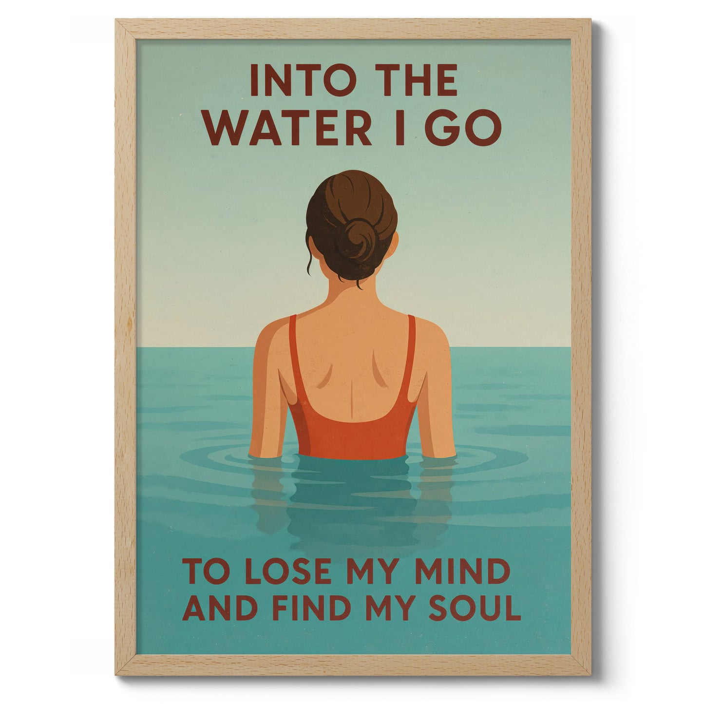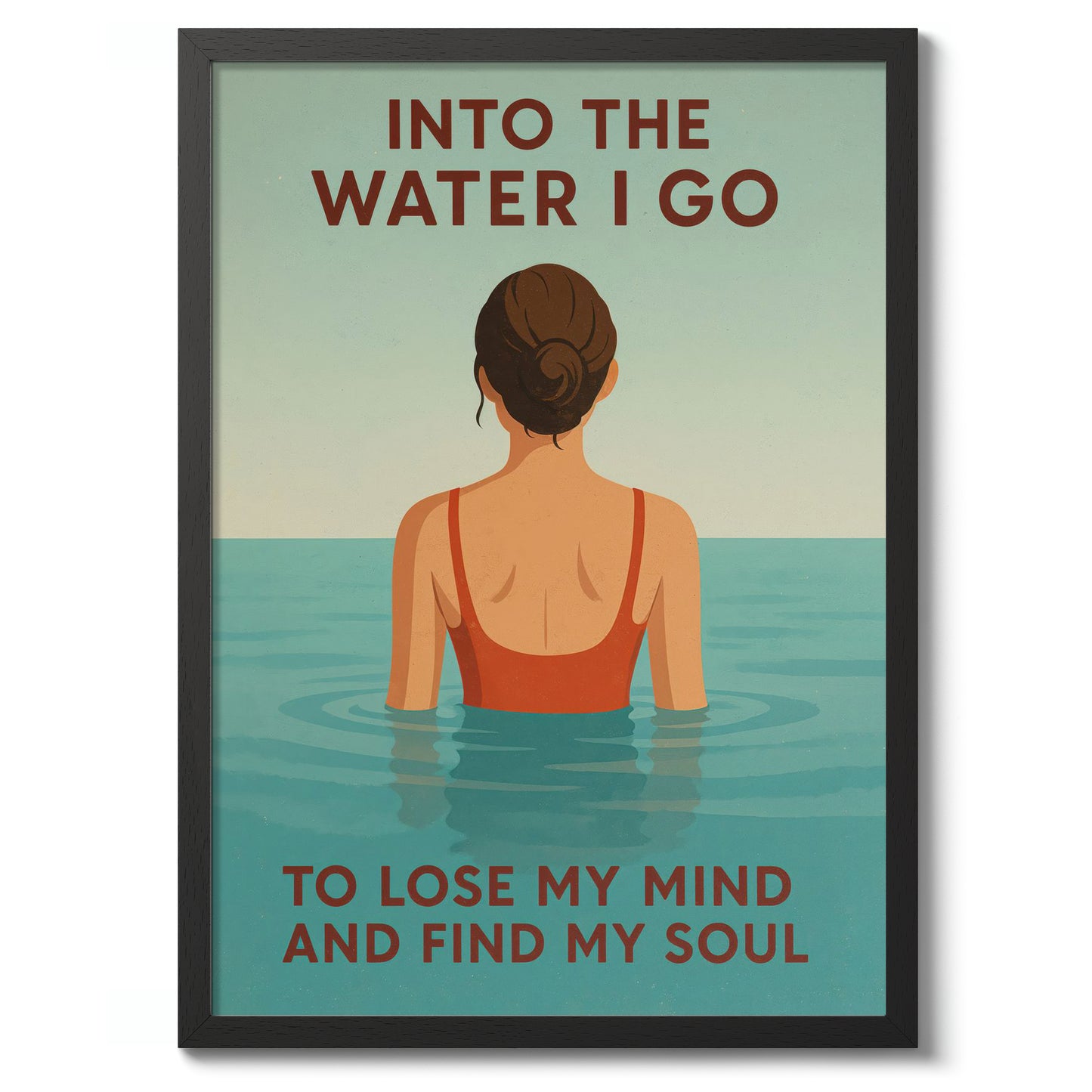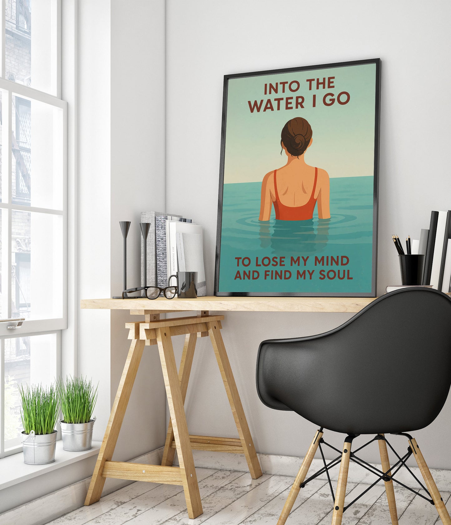 This art print poster titled "Into the Water I Go" features a serene illustration of a woman in a red swimsuit, submerged in calm blue waters. The accompanying motivational quote emphasizes a journey toward self-discovery and relaxation. The combination of typography and tranquil imagery creates an inspiring and visually appealing piece perfect for those who appreciate swim and inspirational themes.