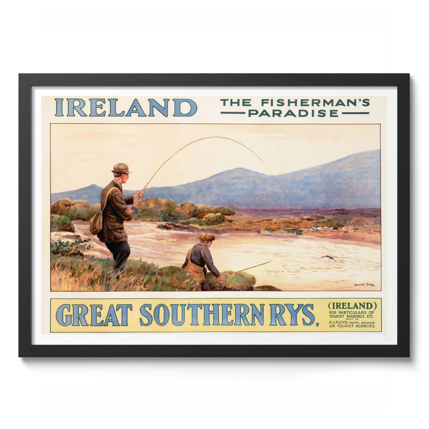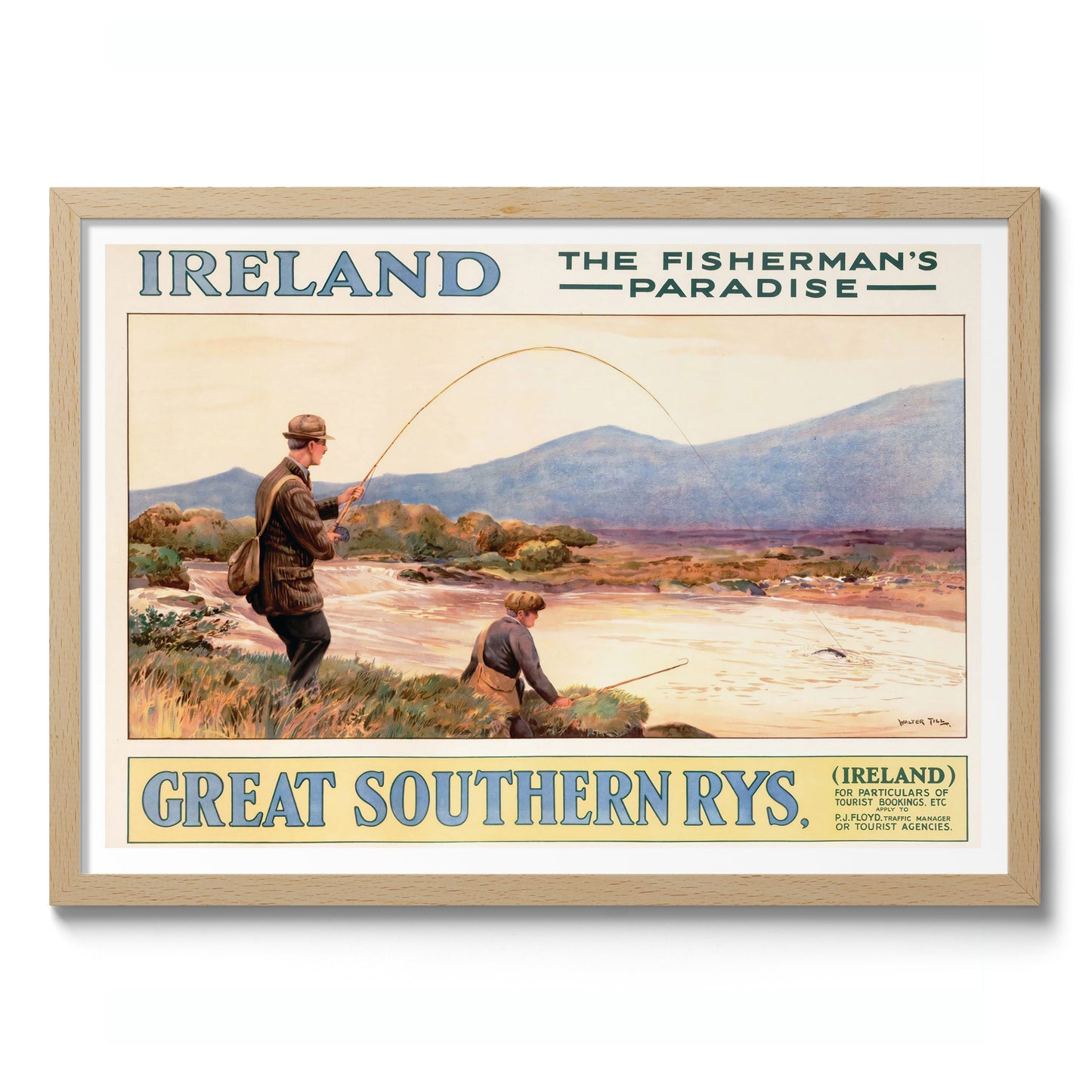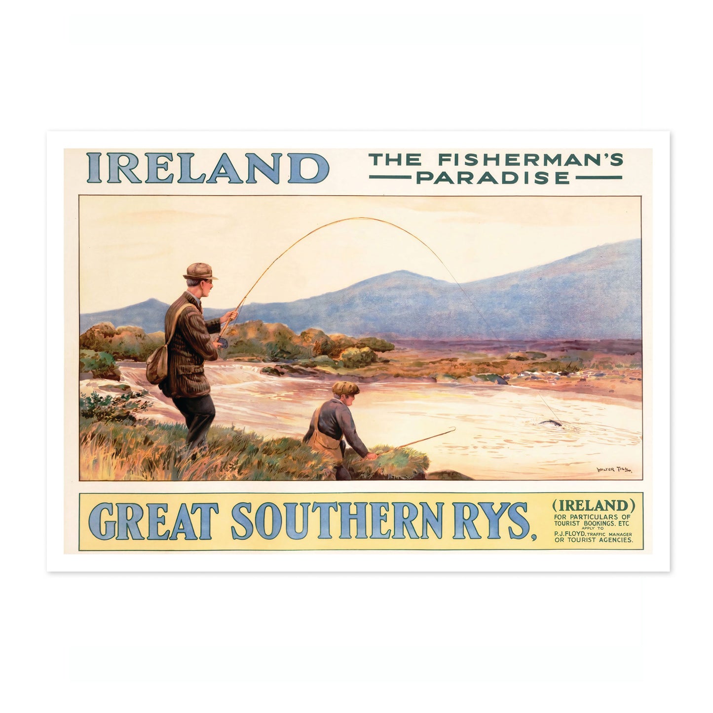 This vintage travel poster, titled "Ireland, The Fisherman's Paradise," vividly captures a serene fishing scene along a picturesque Irish river. Featuring two figures keenly engaged in angling, the artwork is set against a backdrop of gently rolling hills and a tranquil waterway. The beige-toned illustration highlights Ireland's pristine countryside, ideal for fishing enthusiasts. Perfect for vintage or travel-themed decor.