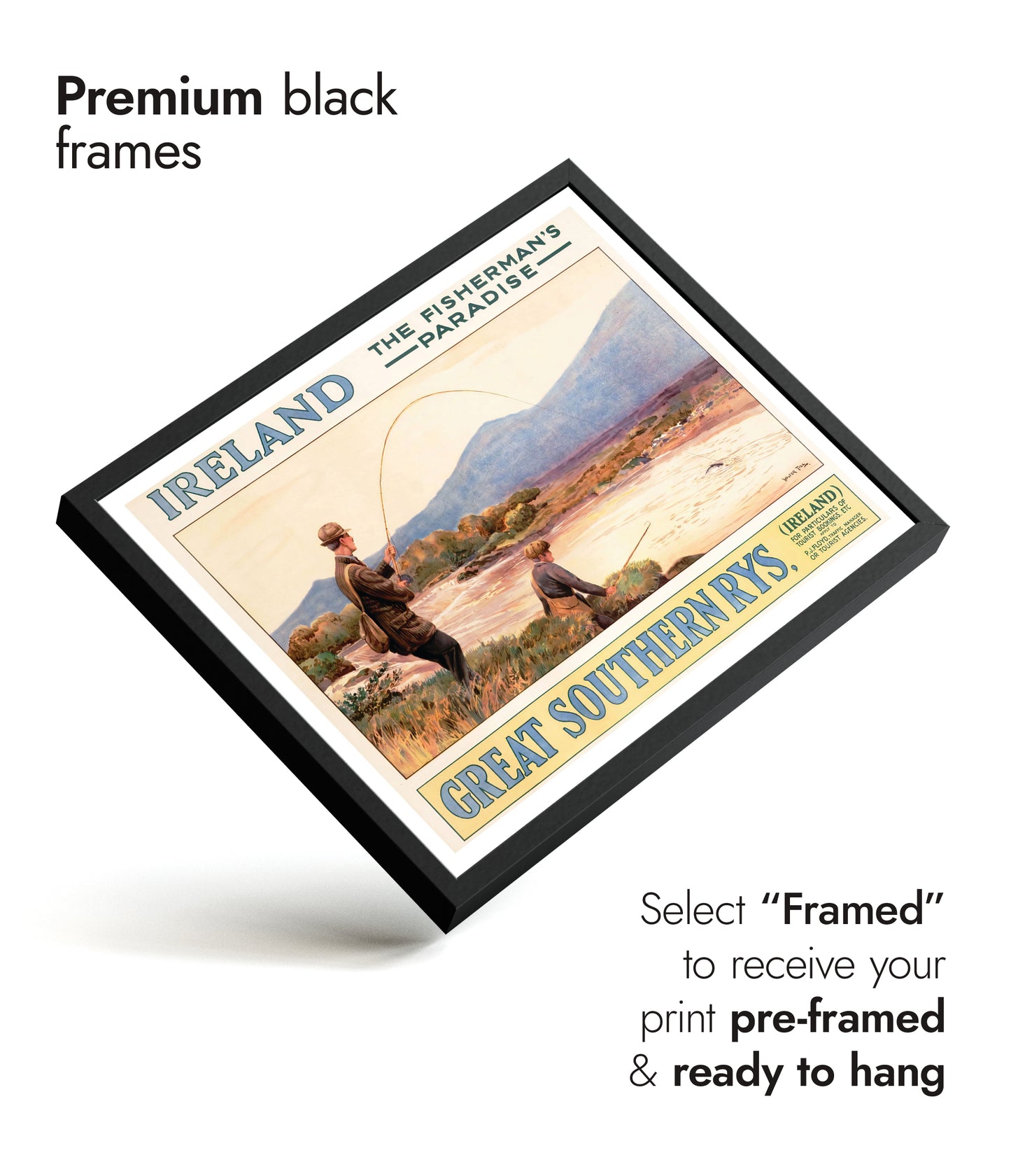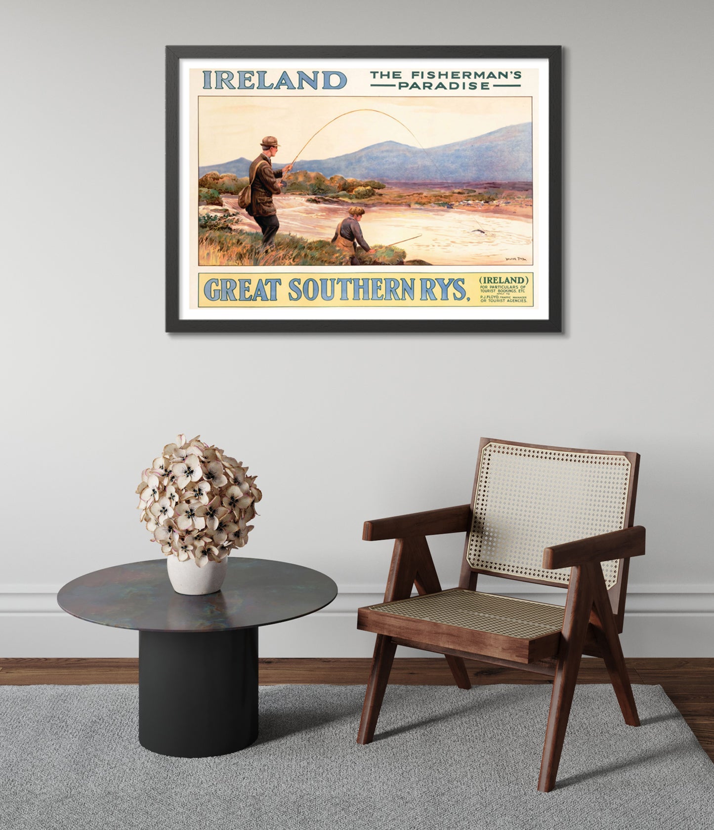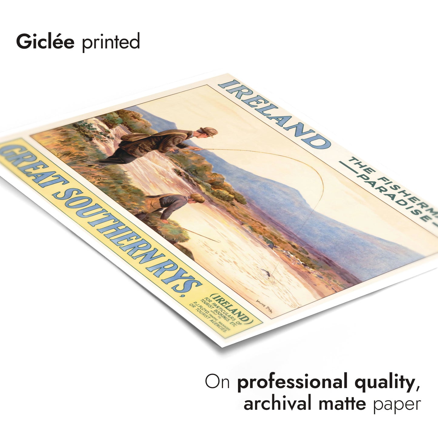 This vintage travel poster, titled "Ireland, The Fisherman's Paradise," vividly captures a serene fishing scene along a picturesque Irish river. Featuring two figures keenly engaged in angling, the artwork is set against a backdrop of gently rolling hills and a tranquil waterway. The beige-toned illustration highlights Ireland's pristine countryside, ideal for fishing enthusiasts. Perfect for vintage or travel-themed decor.