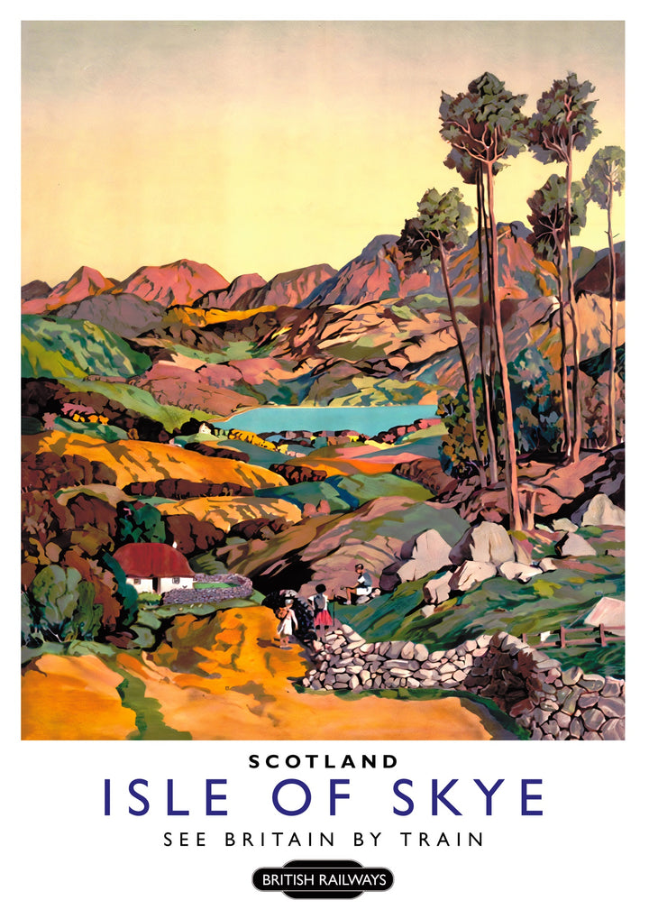 This vintage-style "Isle of Skye" travel poster captures the tranquil beauty of Scotland's Highlands. Featuring a vibrant illustration of a sunset over a serene loch, it showcases lush valleys, tall trees, and cozy cottages. This scenic poster invites viewers to experience Scotland's natural splendor, making it a perfect addition for enthusiasts of travel and nature-themed art.