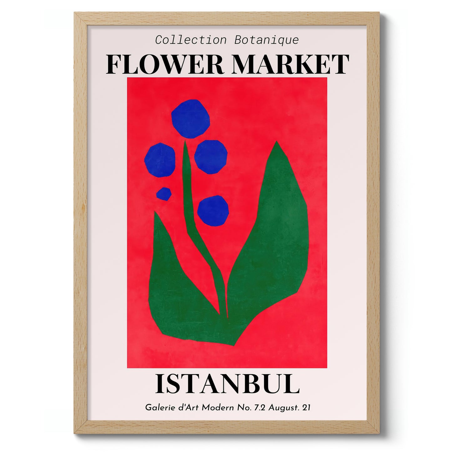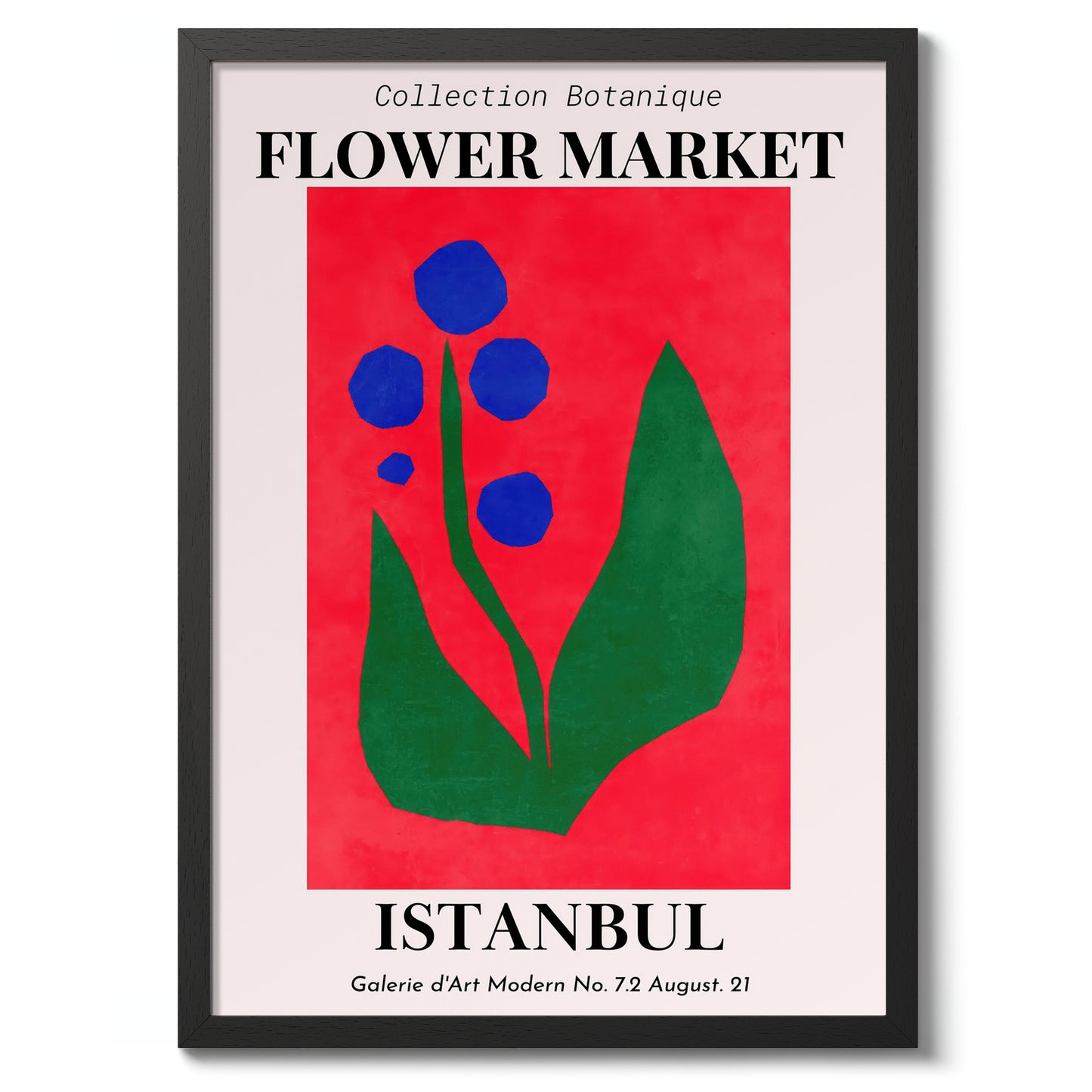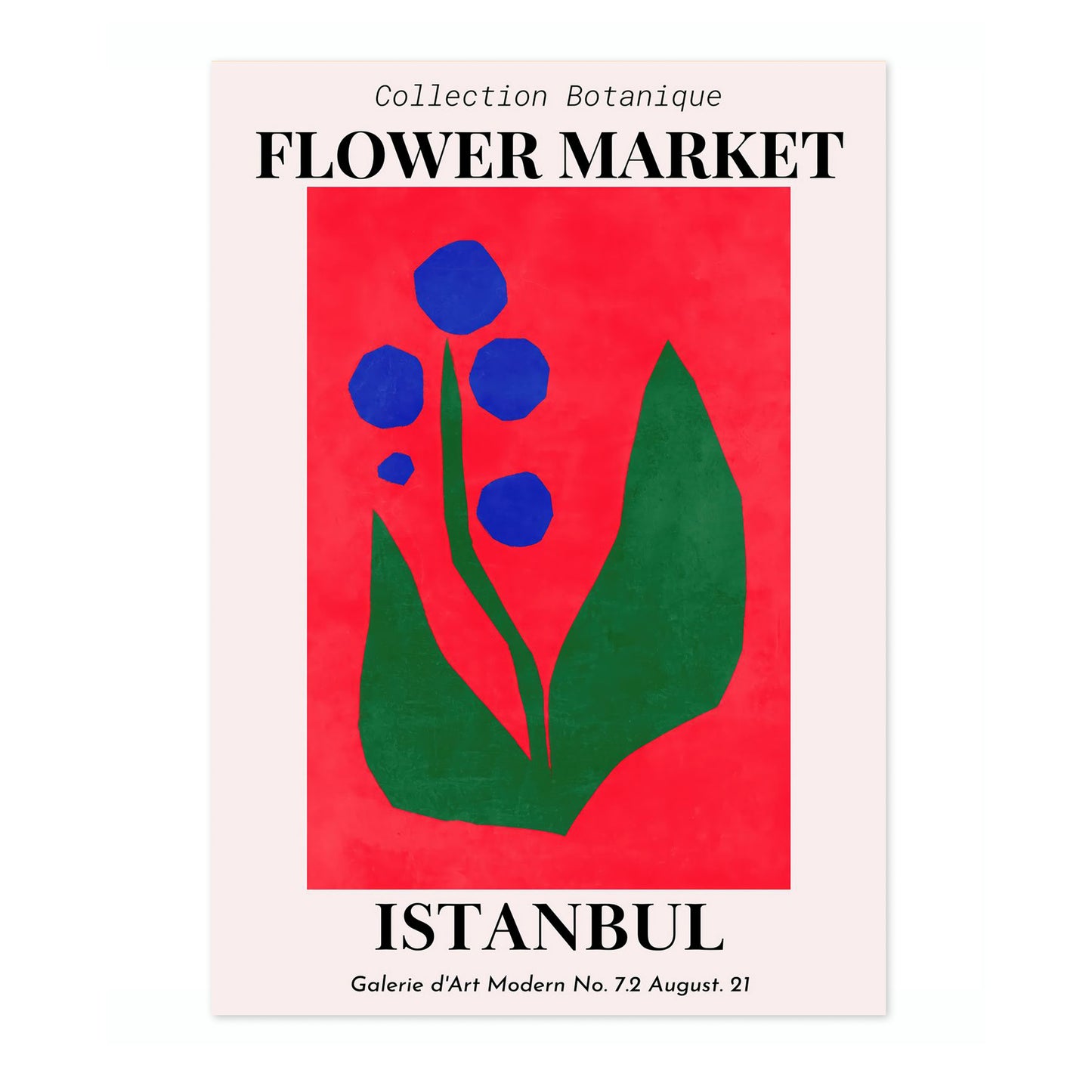 The "Istanbul Flower Market" poster features a bold graphic illustration with vibrant red and green hues. Depicting oversized blue flowers on a striking red background, it captures a vintage essence reminiscent of botanical collections. The artwork embodies the vibrant spirit of Istanbul, focusing on floral themes, and is ideal for enhancing any space with a touch of vintage charm.
