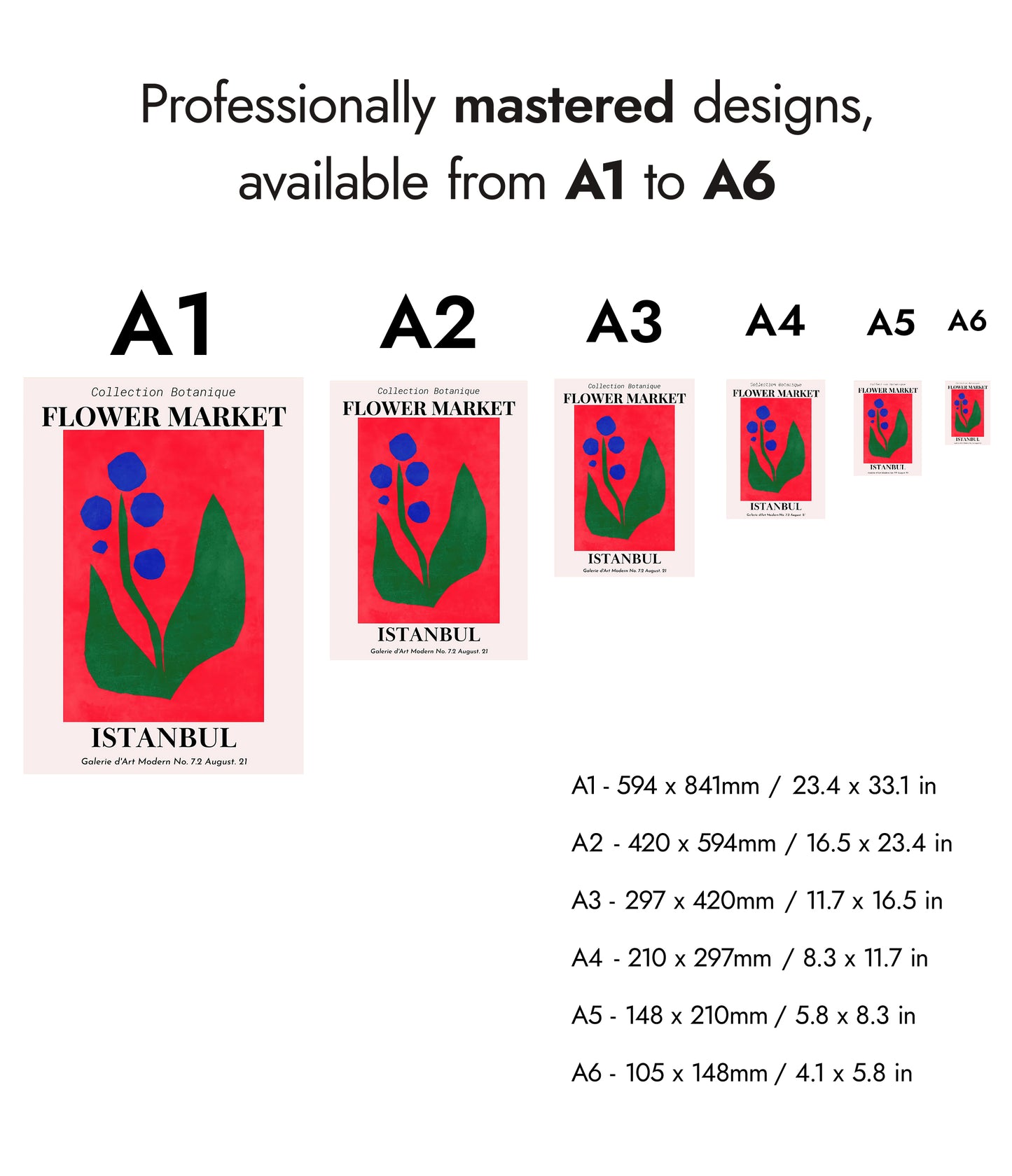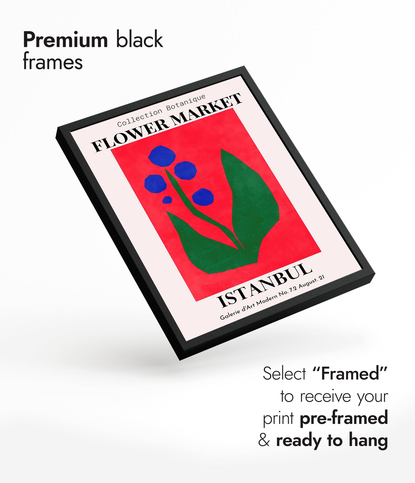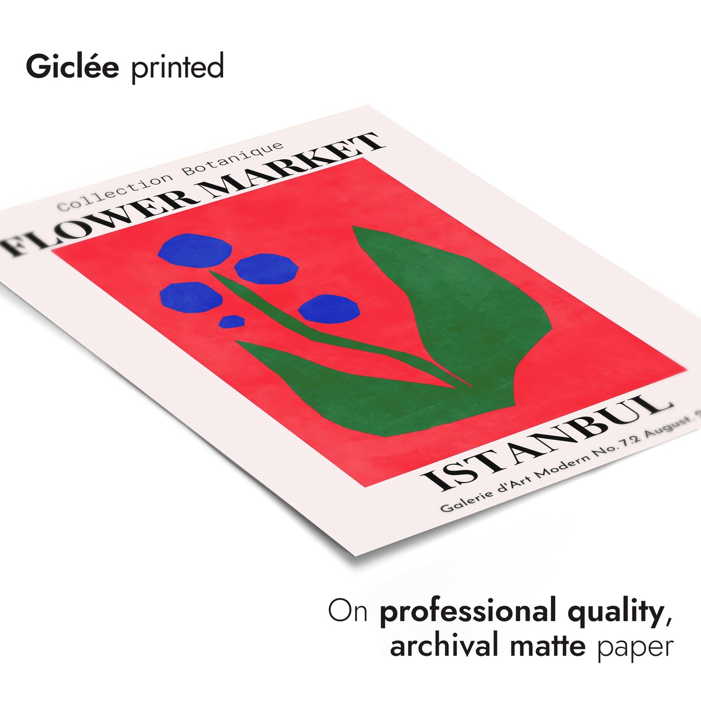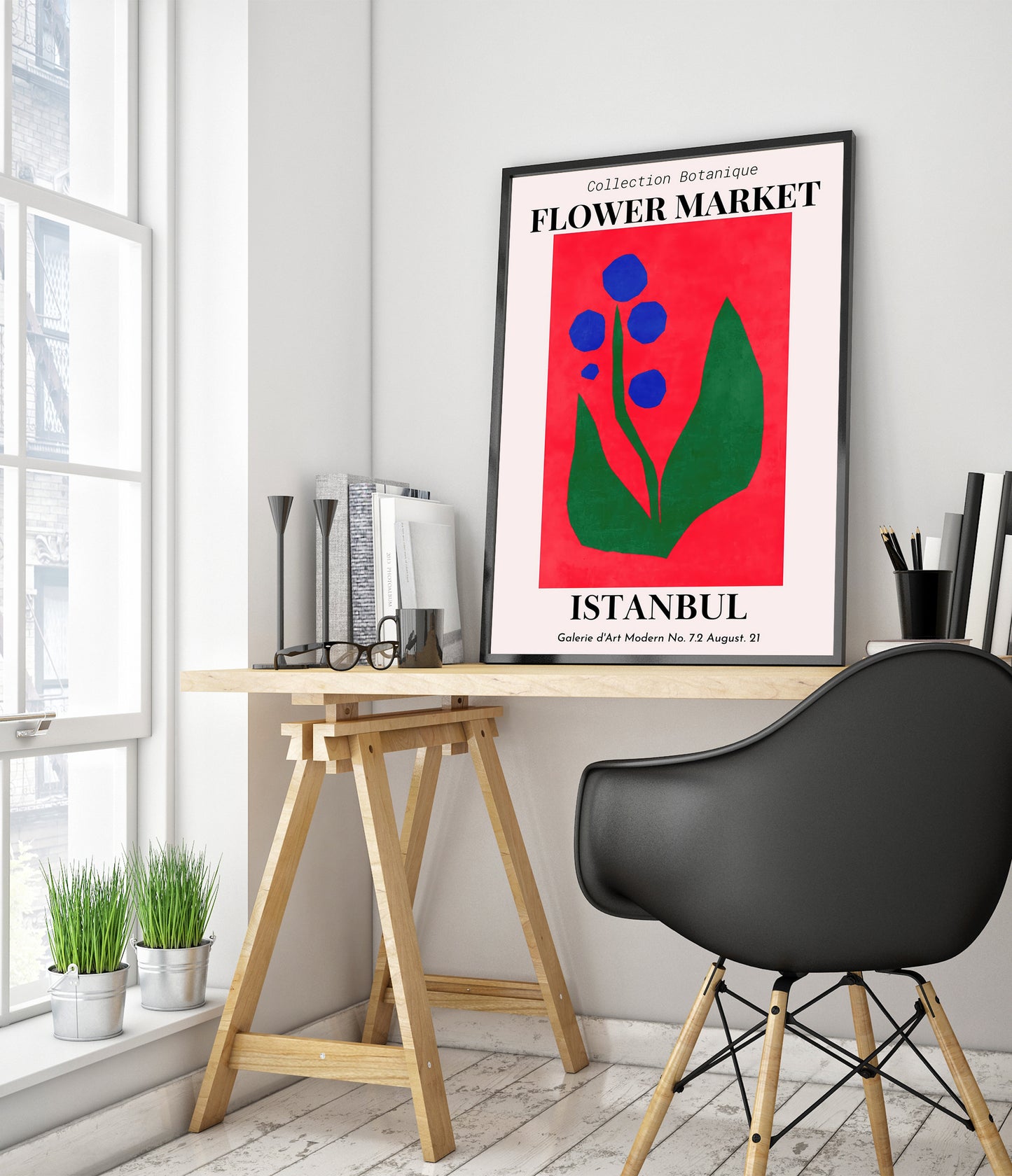The "Istanbul Flower Market" poster features a bold graphic illustration with vibrant red and green hues. Depicting oversized blue flowers on a striking red background, it captures a vintage essence reminiscent of botanical collections. The artwork embodies the vibrant spirit of Istanbul, focusing on floral themes, and is ideal for enhancing any space with a touch of vintage charm.
