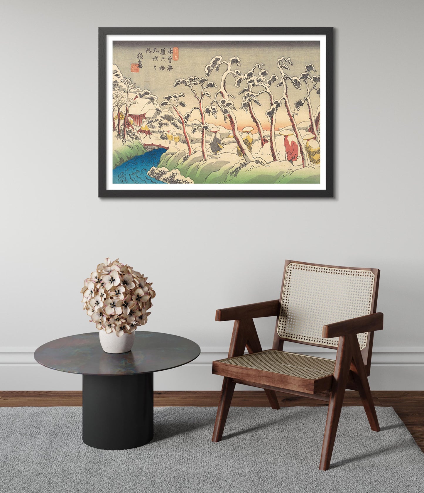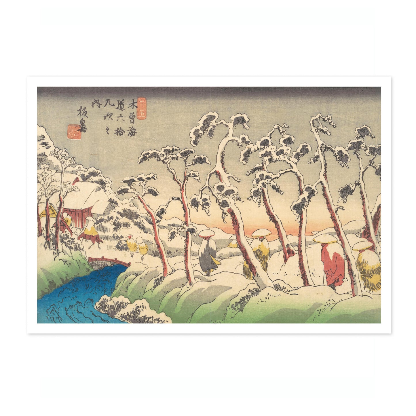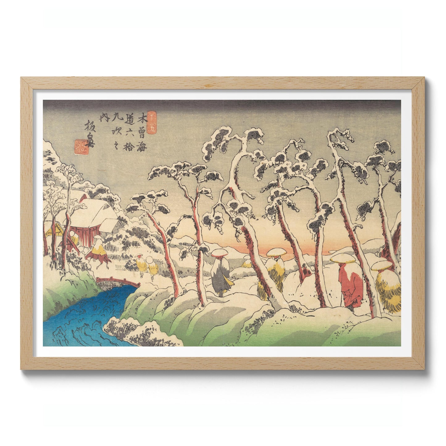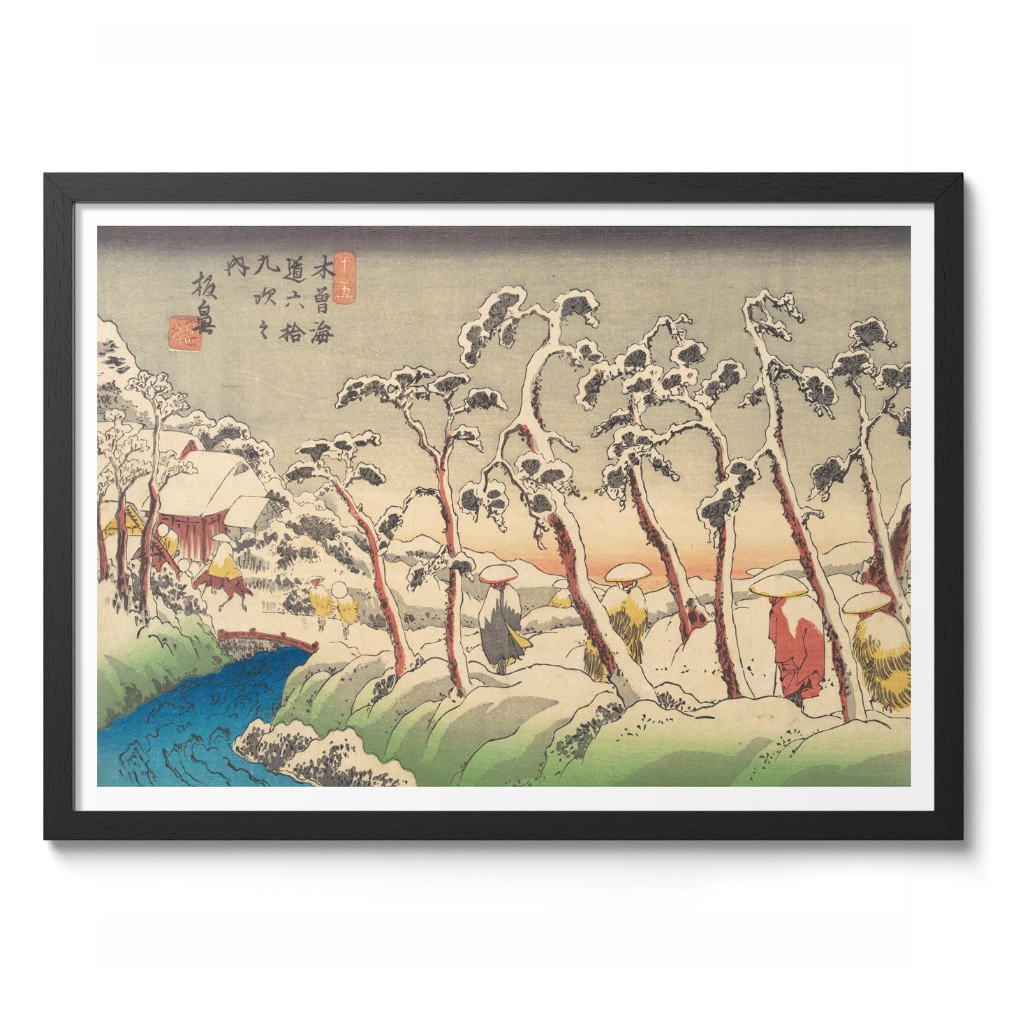 This traditional Japanese woodblock poster by Keisai Eisen, titled "Itabana," showcases a serene winter landscape where snow-laden trees line a peaceful river. Villagers in colourful attire traverse a quaint bridge, capturing the essence of rural life. The intricate detailing and harmonious blend of colours and elements reflect the classic Ukiyo-E style, perfect for adding a touch of tranquility to any space.