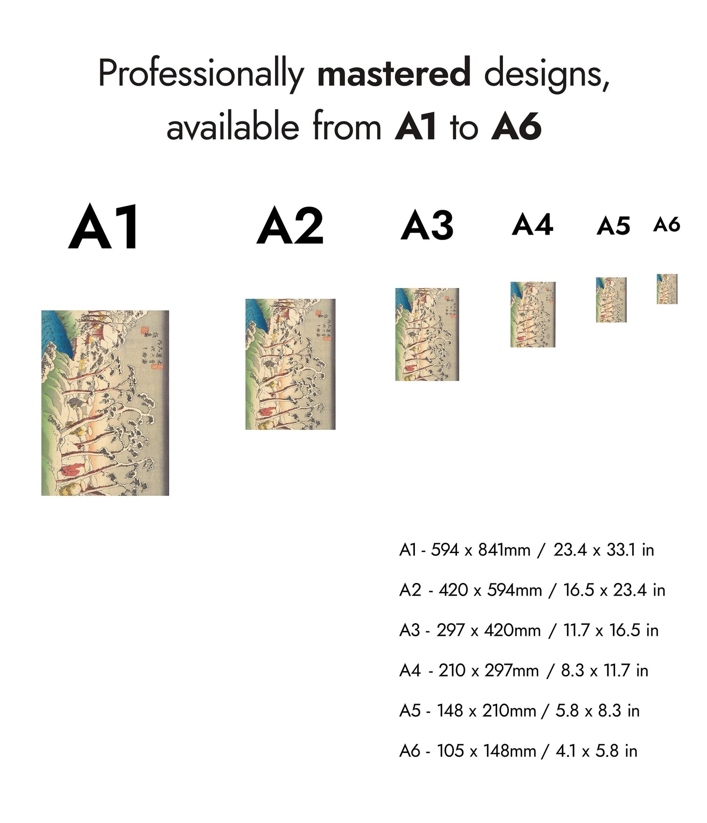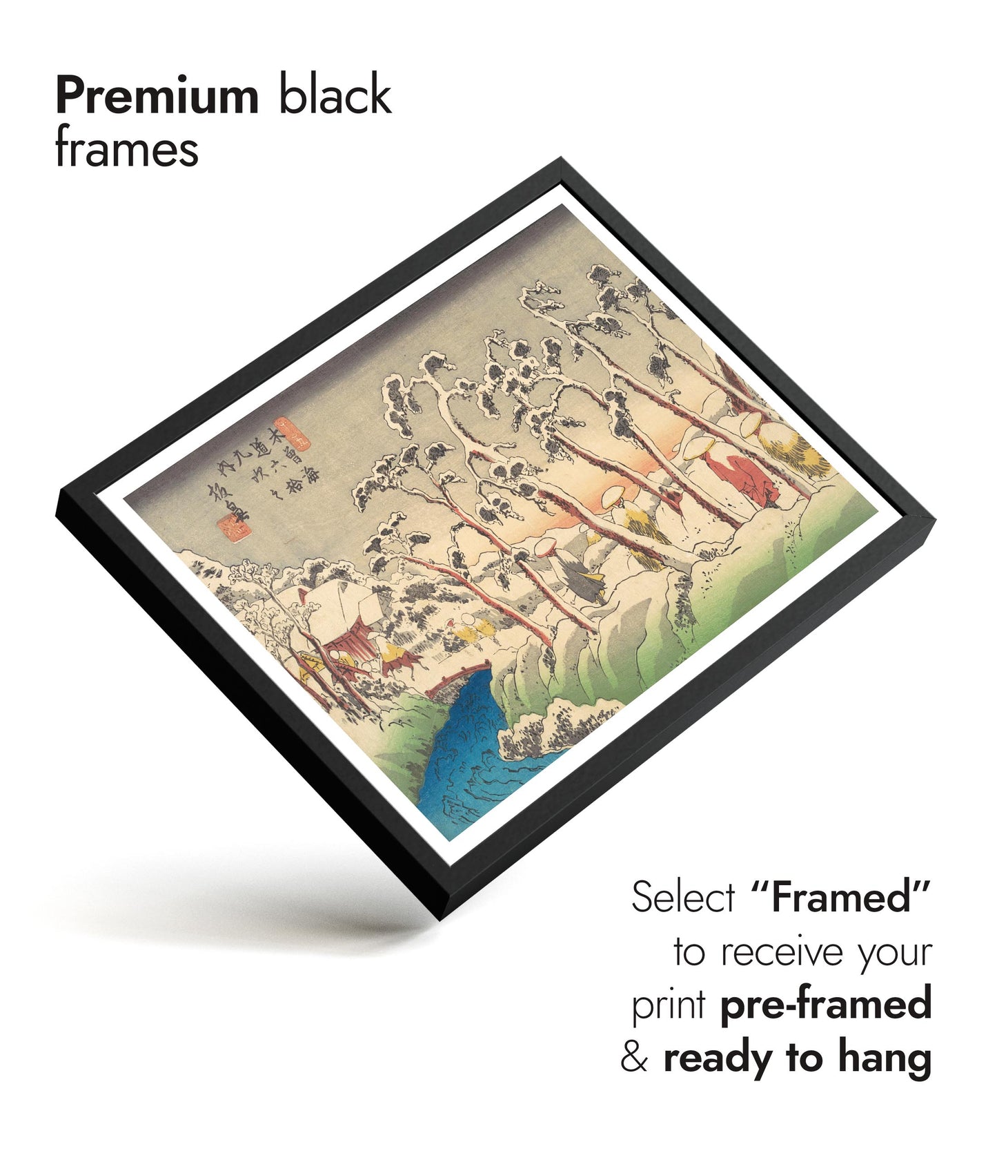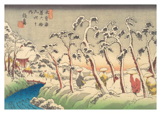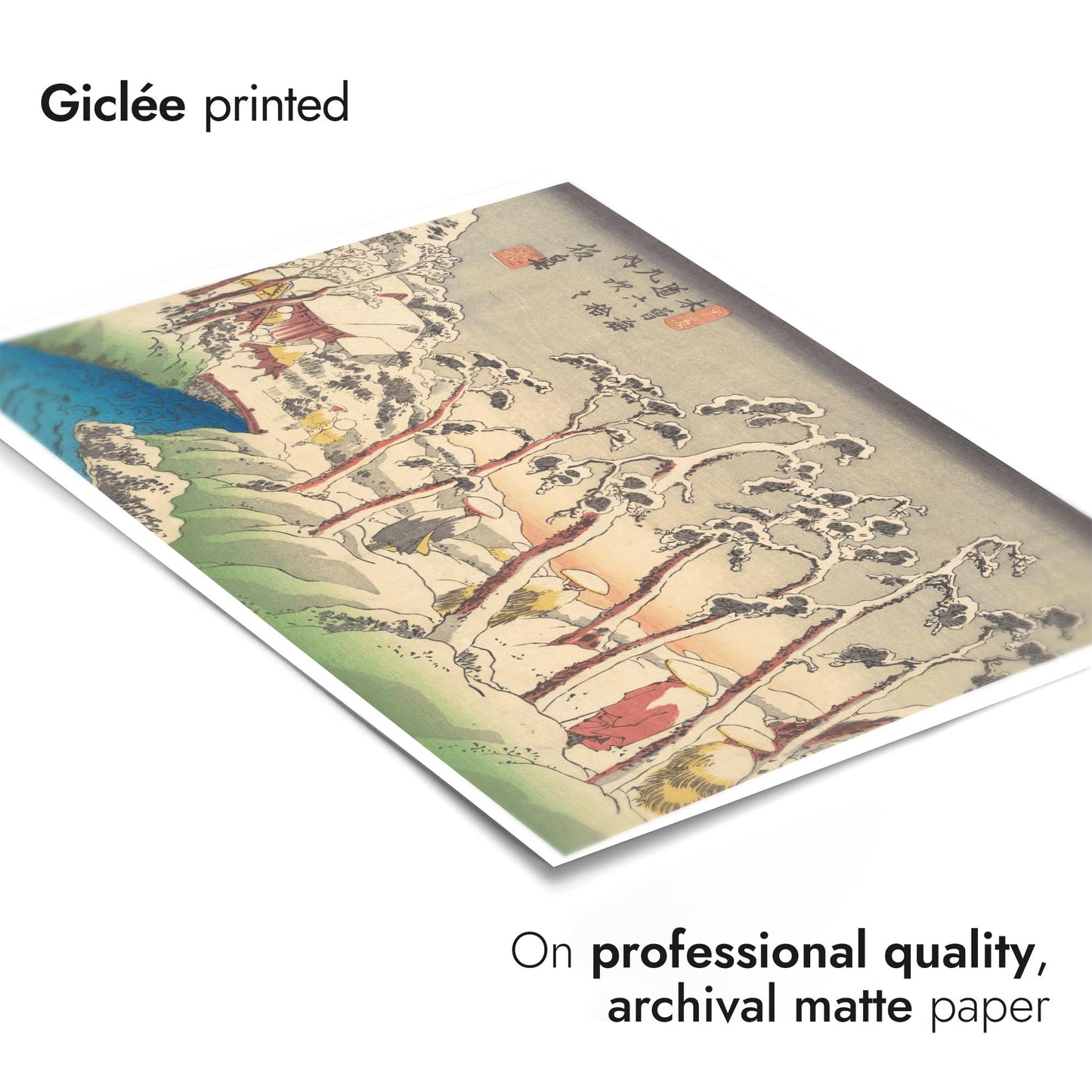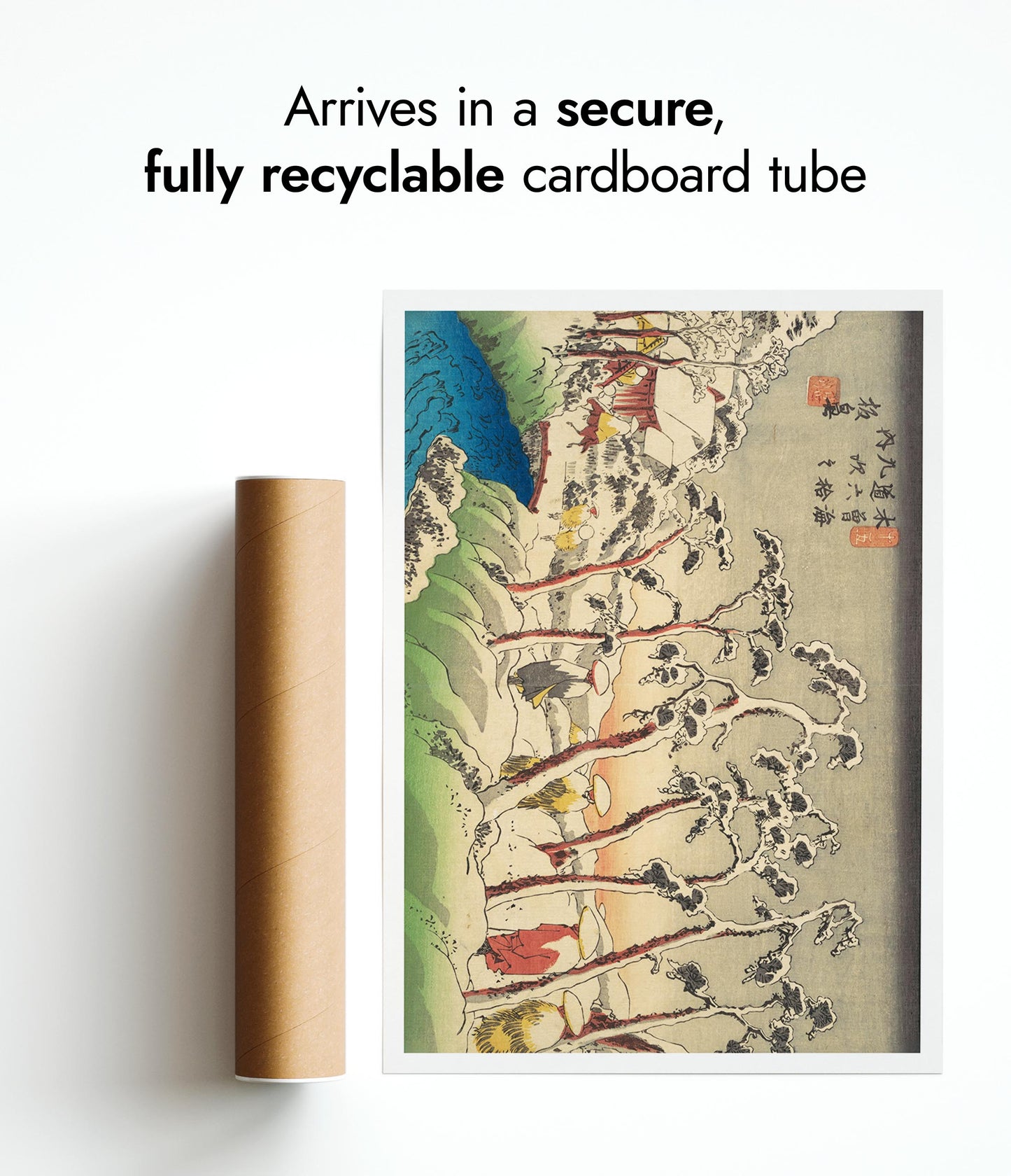 This traditional Japanese woodblock poster by Keisai Eisen, titled "Itabana," showcases a serene winter landscape where snow-laden trees line a peaceful river. Villagers in colourful attire traverse a quaint bridge, capturing the essence of rural life. The intricate detailing and harmonious blend of colours and elements reflect the classic Ukiyo-E style, perfect for adding a touch of tranquility to any space.