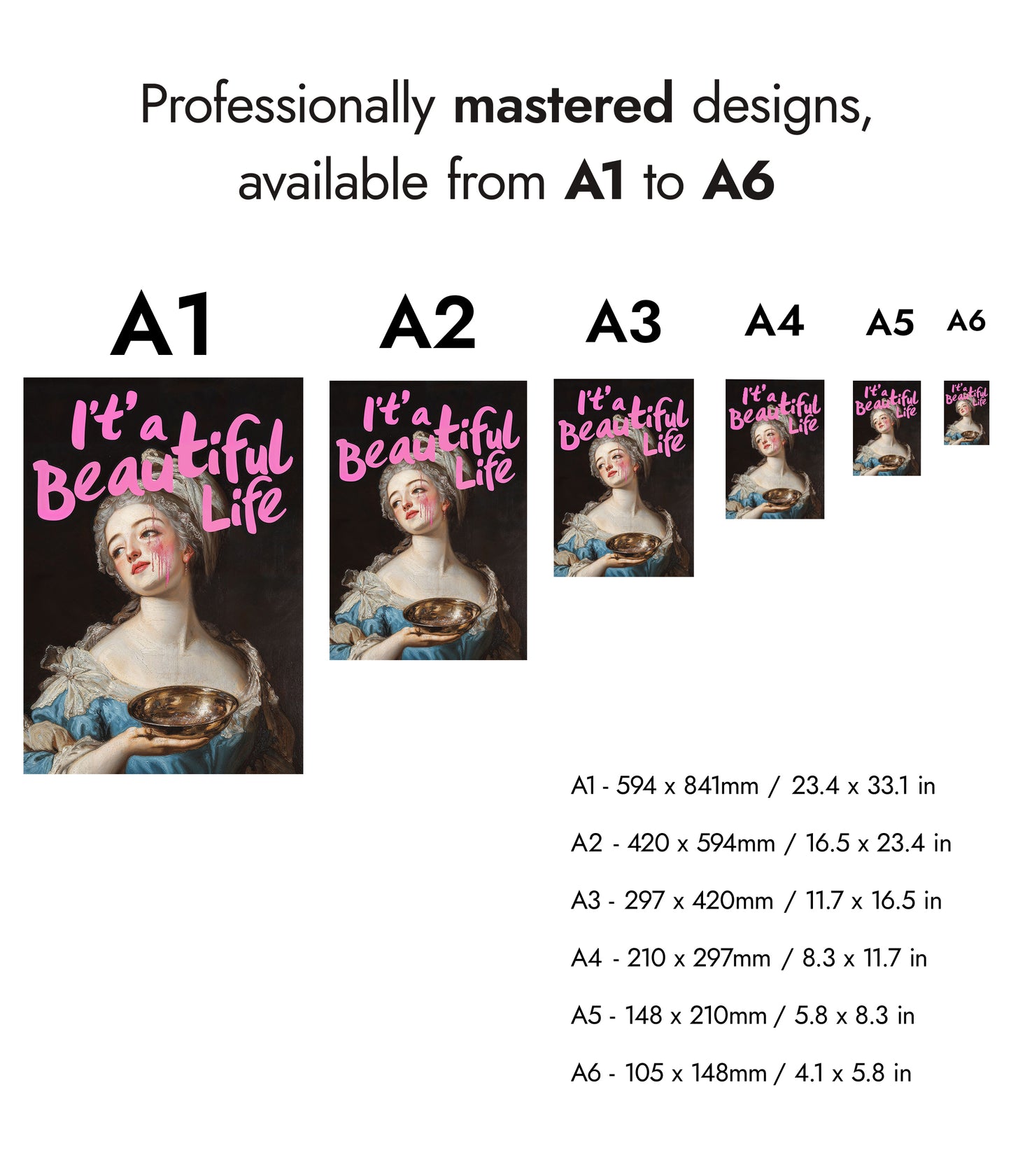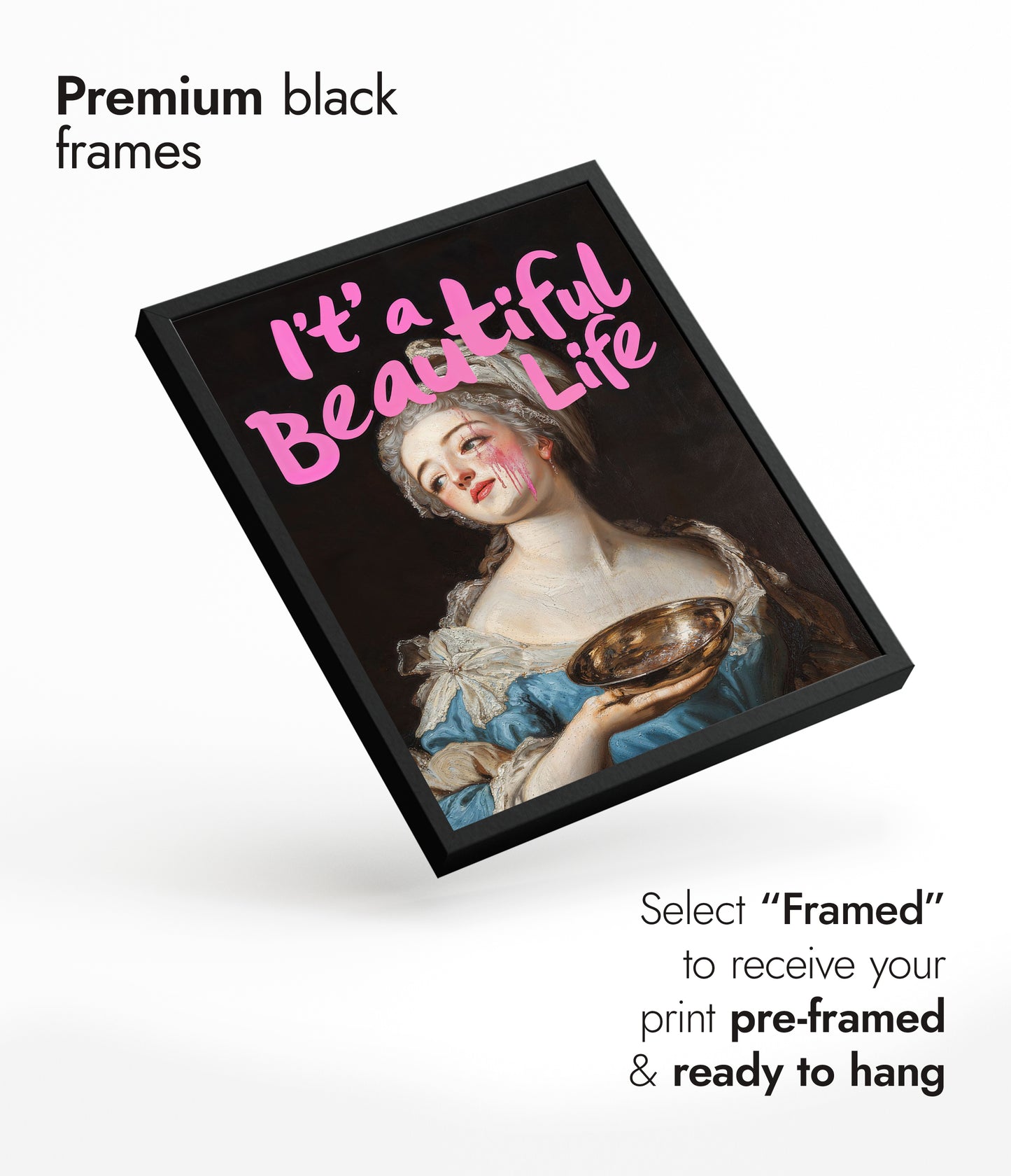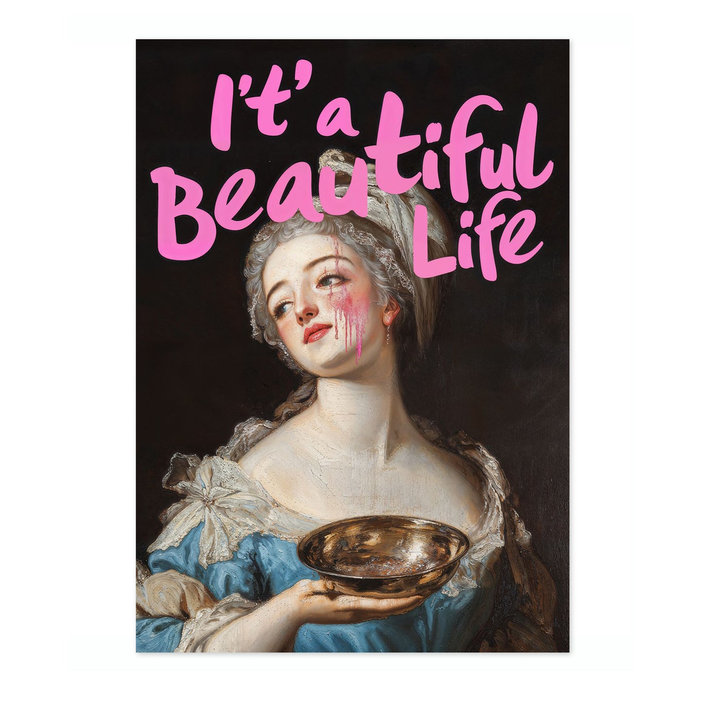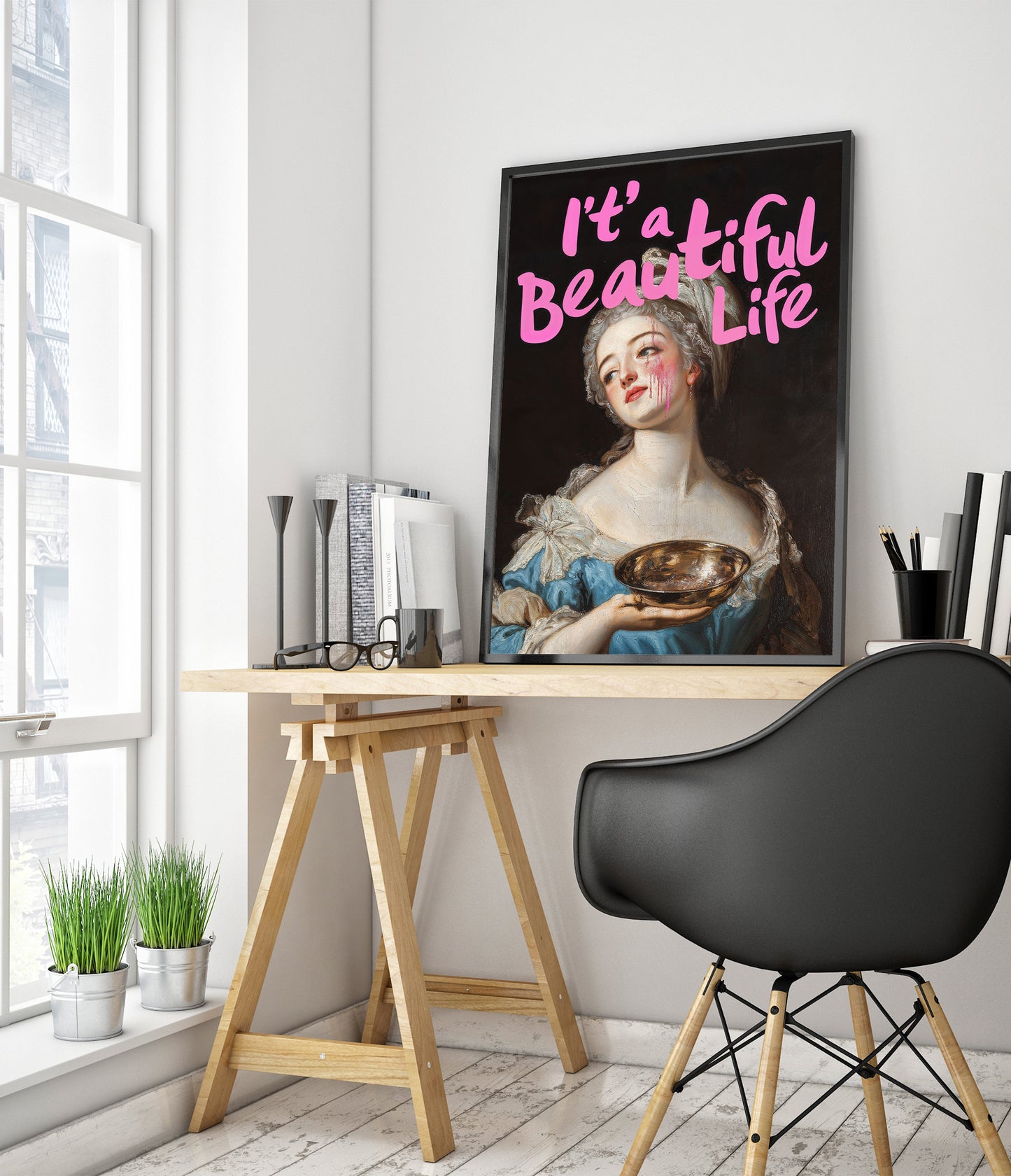 This striking poster combines classical portraiture with modern graffiti art, featuring a historic female figure holding a bowl, juxtaposed with bold pink typography declaring "It's a Beautiful Life." The artwork's fusion of vintage charm and contemporary graphic elements creates an engaging visual narrative, ideal for those drawn to inspirational themes and typographic art.