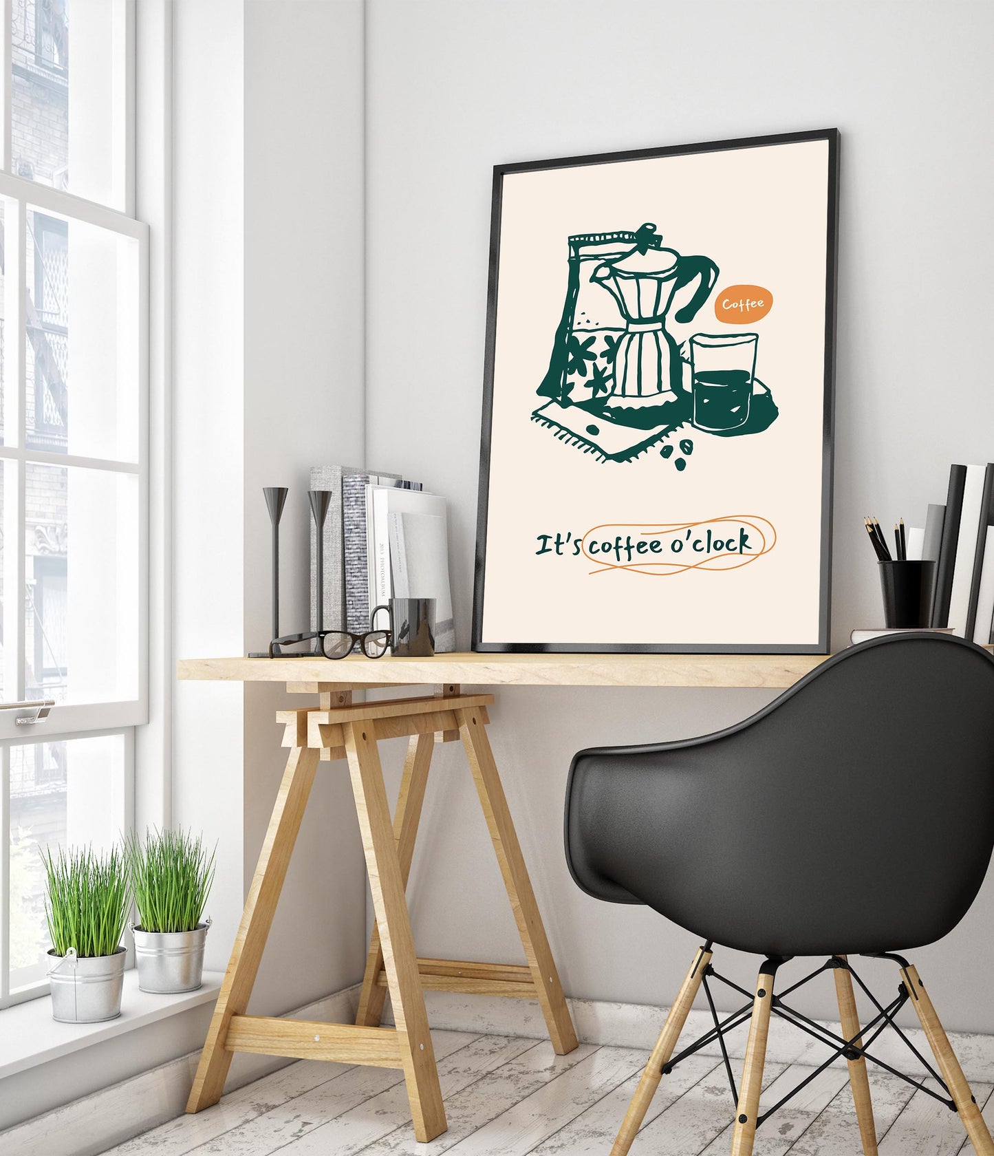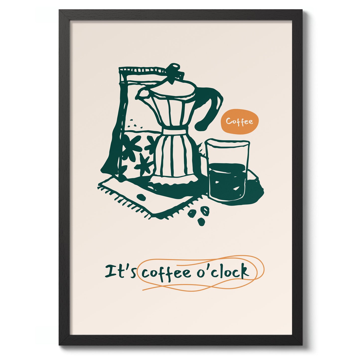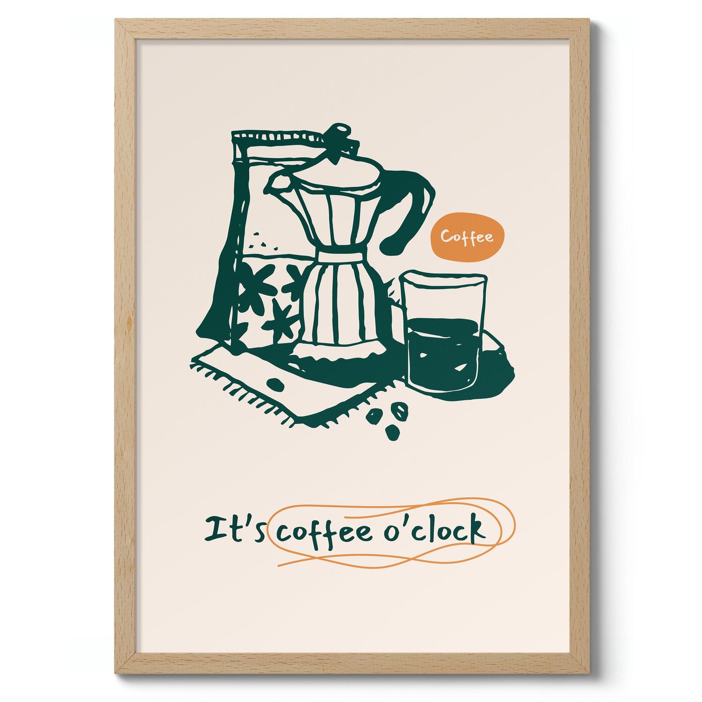 This modern graphic poster captures the essence of a coffee break. Titled "It's Coffee o'Clock", it features an illustrated moka pot, a glass of coffee, and playful typography. Perfect for kitchen decor, this portrait celebrates coffee culture with minimalistic design and bold outlines, making it a stylish addition to any coffee lover’s space.