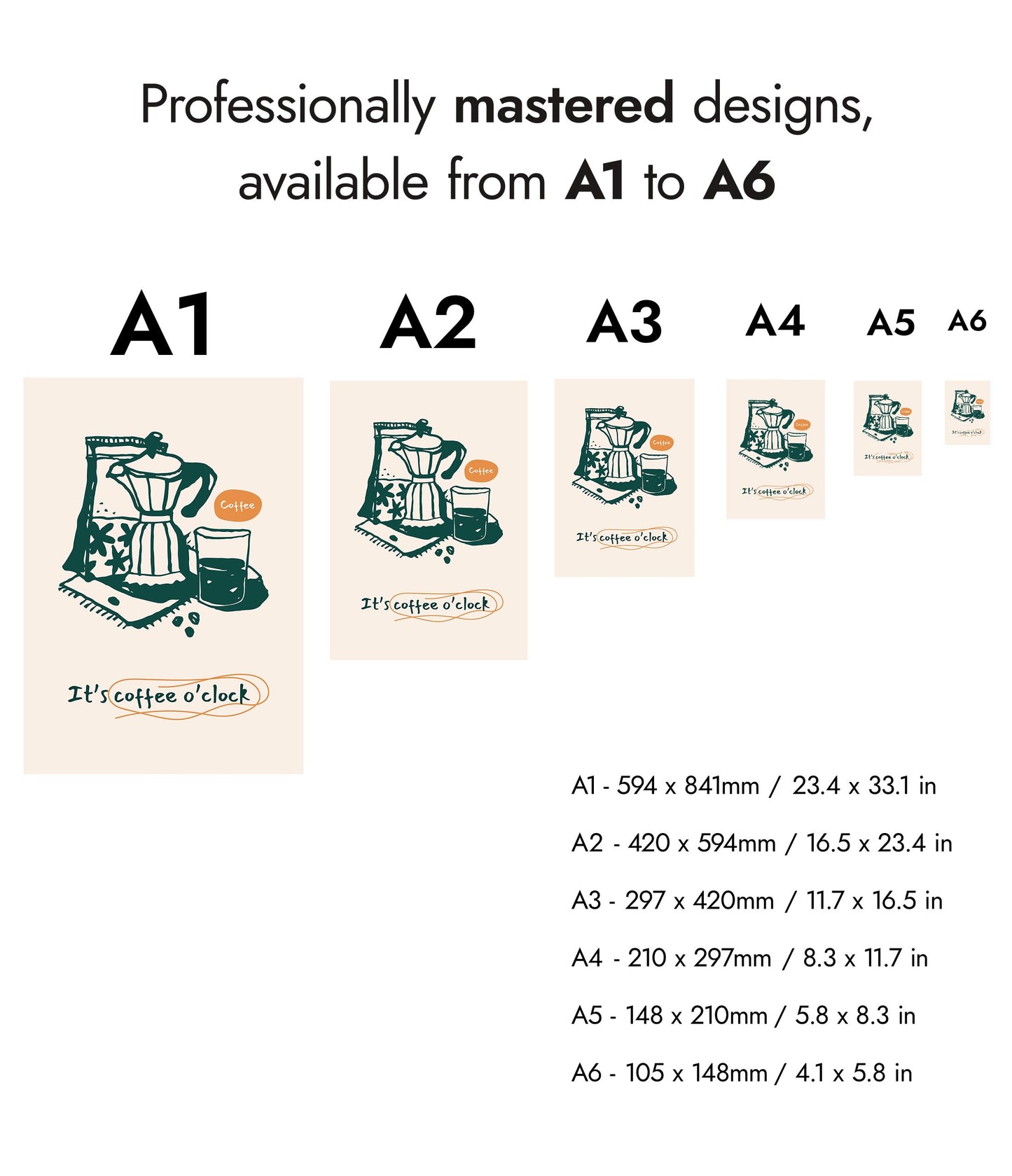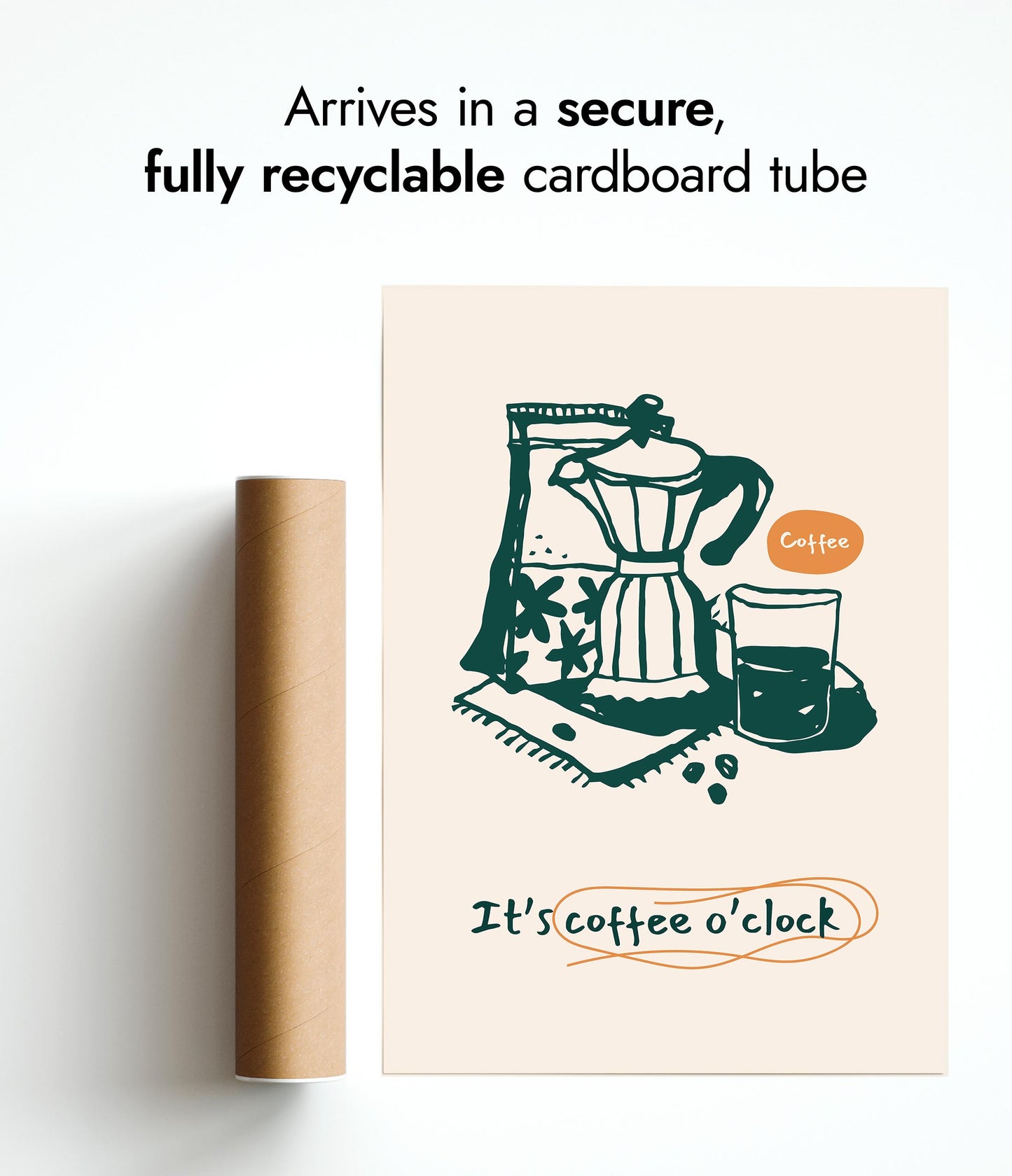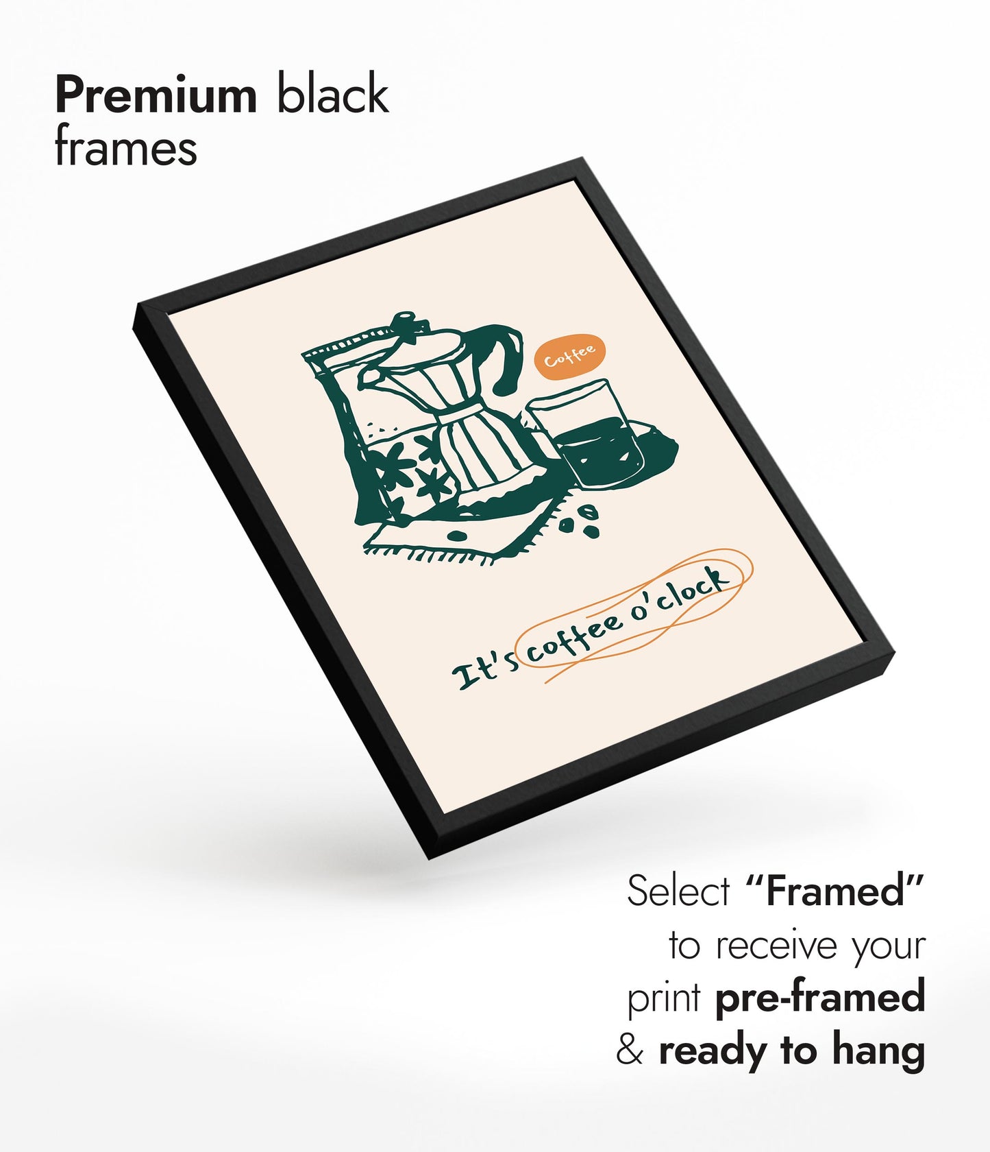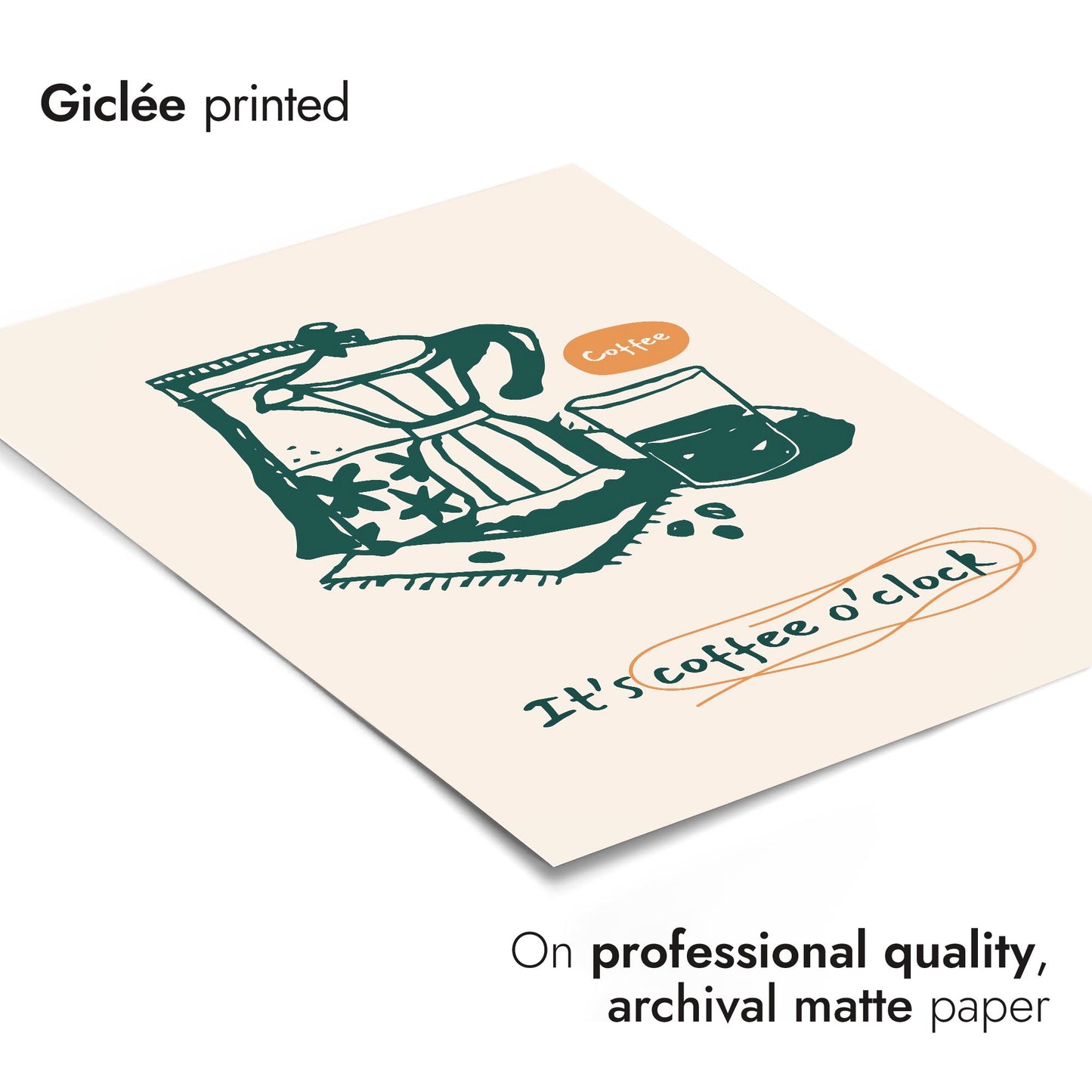 This modern graphic poster captures the essence of a coffee break. Titled "It's Coffee o'Clock", it features an illustrated moka pot, a glass of coffee, and playful typography. Perfect for kitchen decor, this portrait celebrates coffee culture with minimalistic design and bold outlines, making it a stylish addition to any coffee lover’s space.