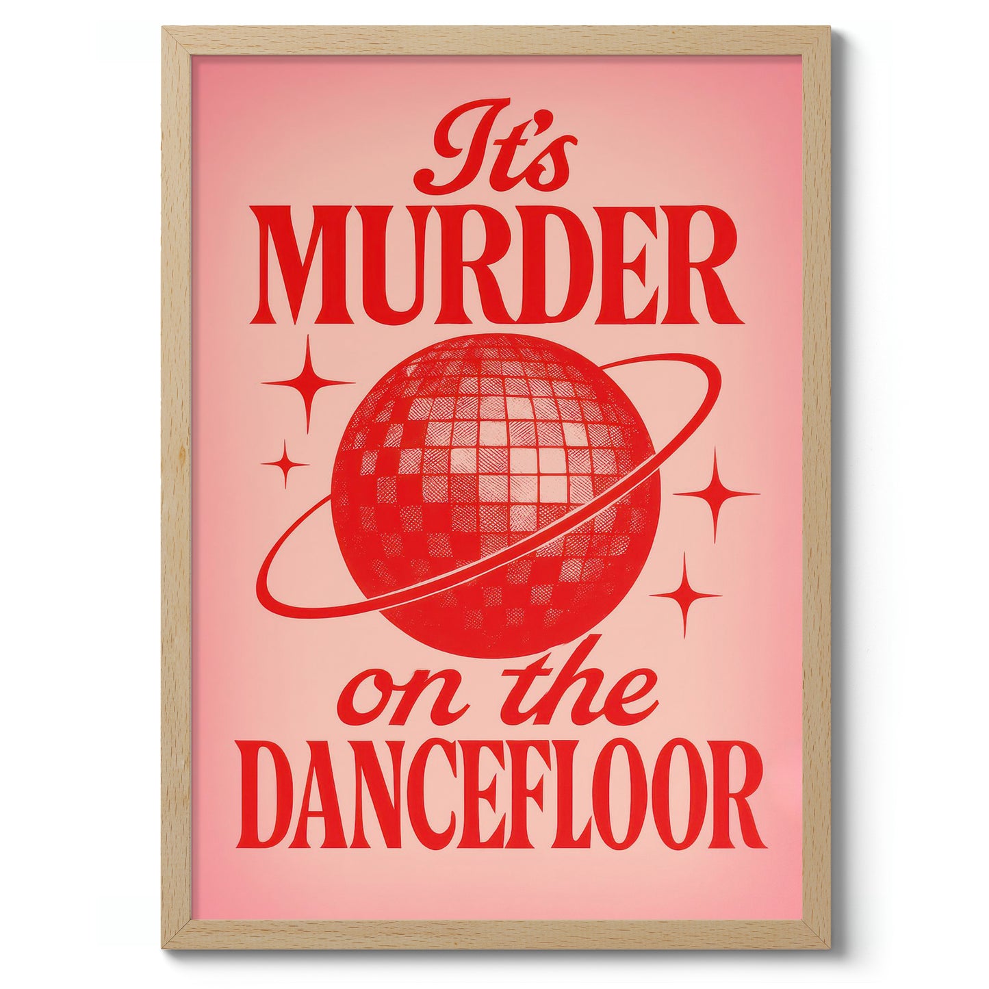 This vibrant pink typography poster features the playful disco-themed phrase "It's Murder on the Dancefloor." Designed with a bold red disco ball illustration surrounded by star-like accents, it captures a fun, pop music vibe. Ideal for music lovers and fans of graphic design, this artwork adds a lively touch to any space.