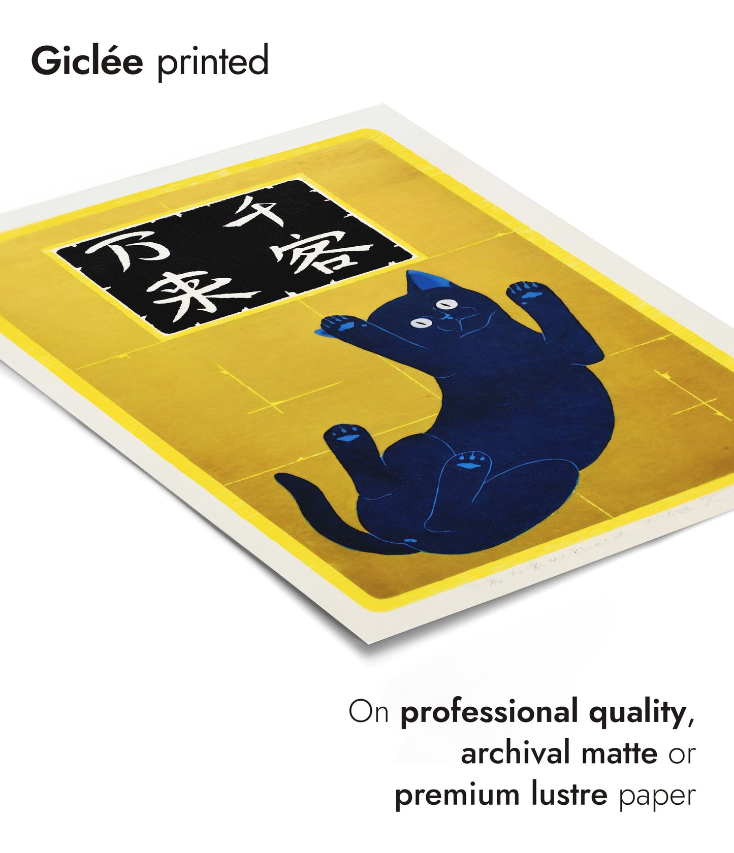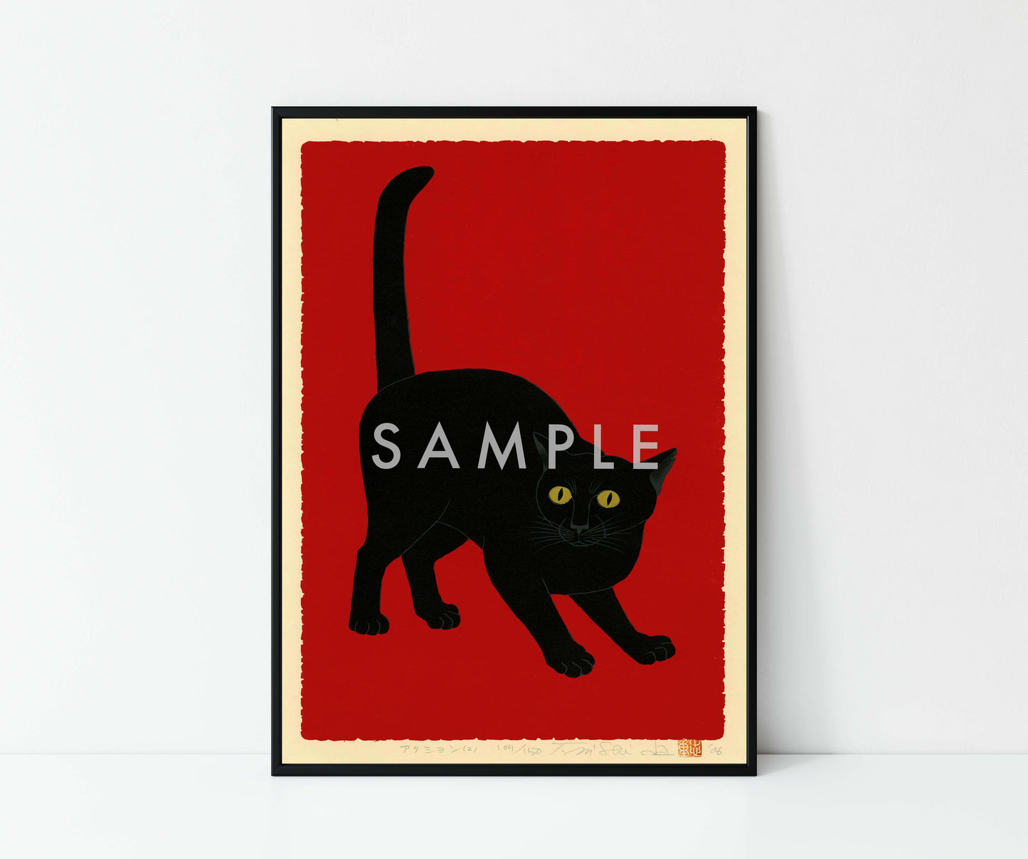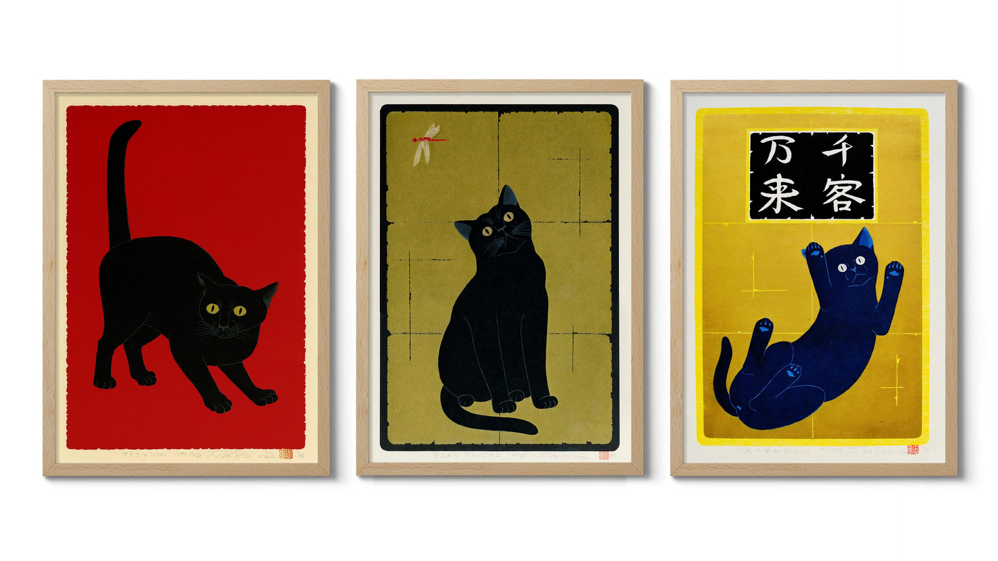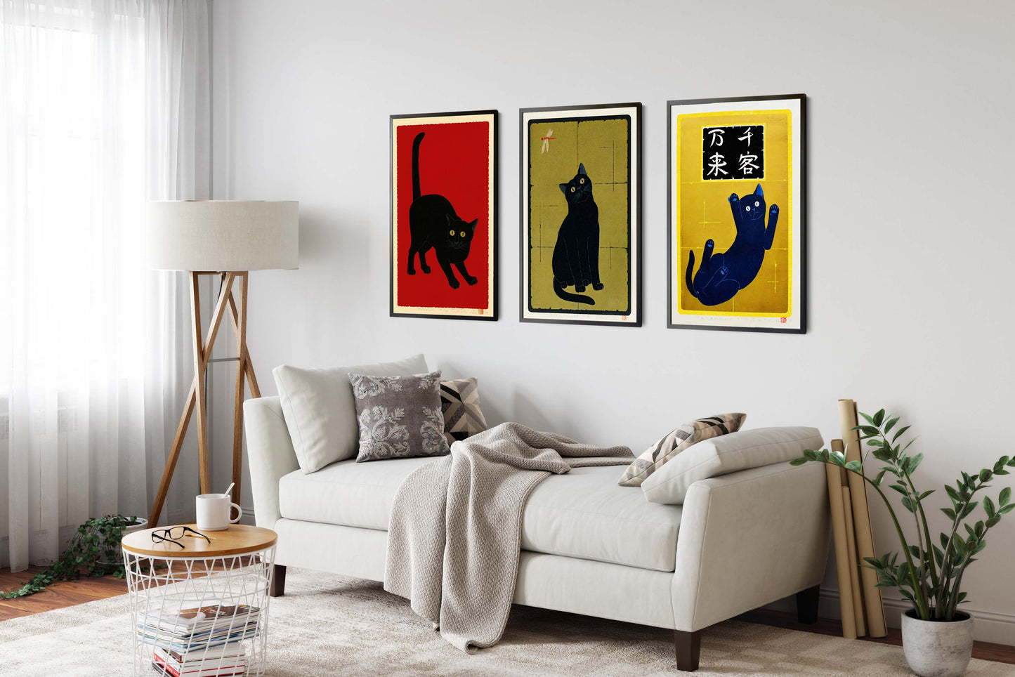 This set of 3 Japanese cat posters features minimalist, traditional woodblock prints that showcase black cats against vibrant backgrounds. Each print highlights unique cat poses—curious, sitting, and playful—on red, gold, and yellow backgrounds. The classic Japanese aesthetic and animal theme make this collection ideal for adding cultural and artistic charm to your space.