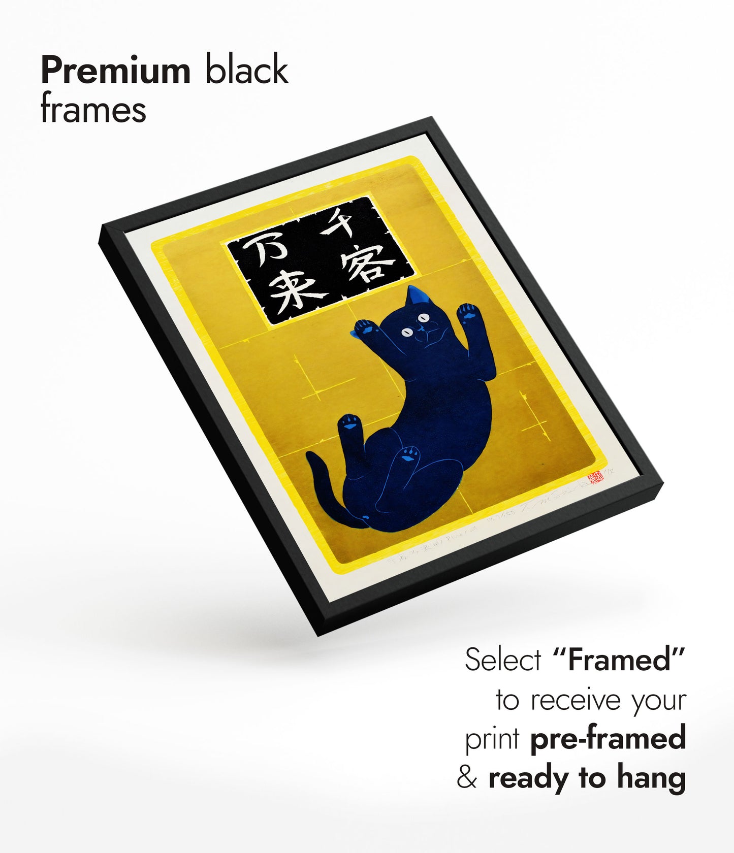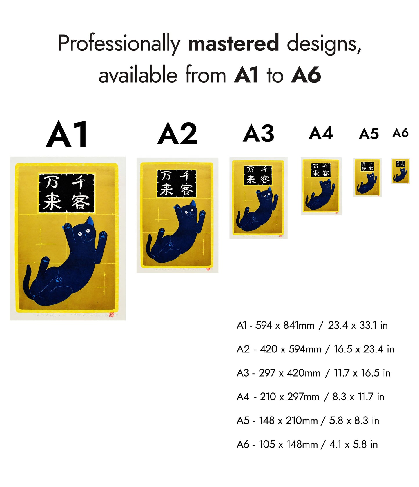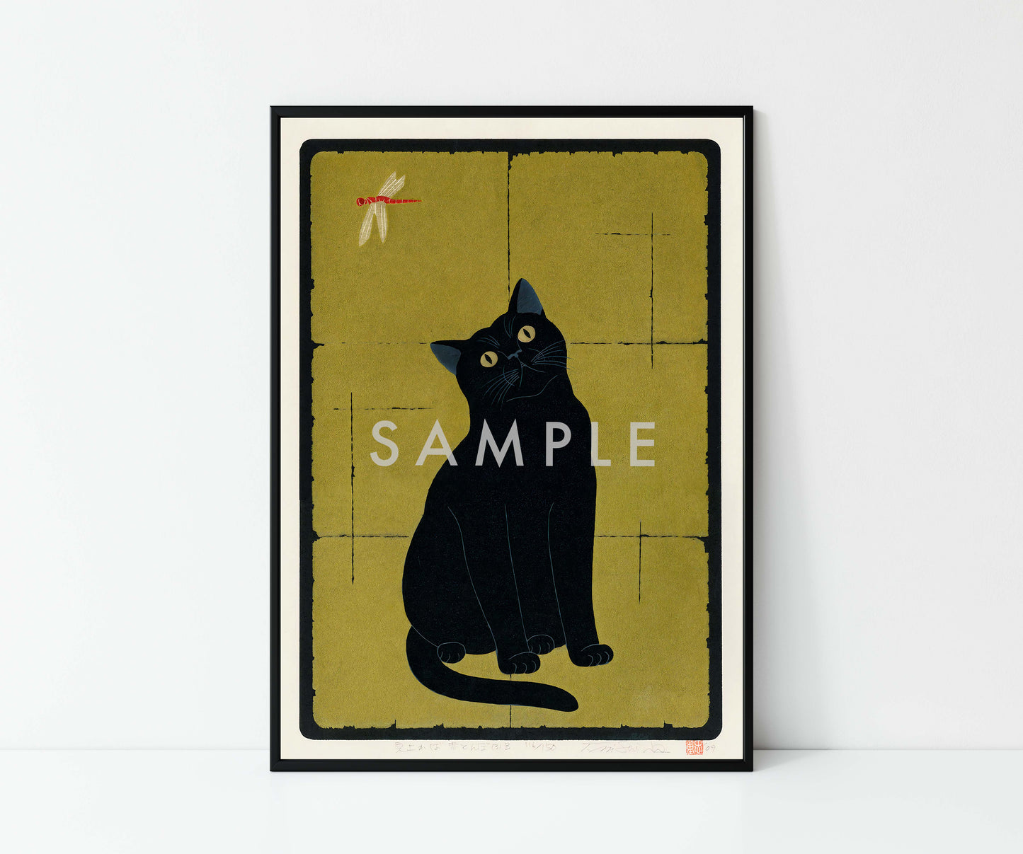 This set of 3 Japanese cat posters features minimalist, traditional woodblock prints that showcase black cats against vibrant backgrounds. Each print highlights unique cat poses—curious, sitting, and playful—on red, gold, and yellow backgrounds. The classic Japanese aesthetic and animal theme make this collection ideal for adding cultural and artistic charm to your space.