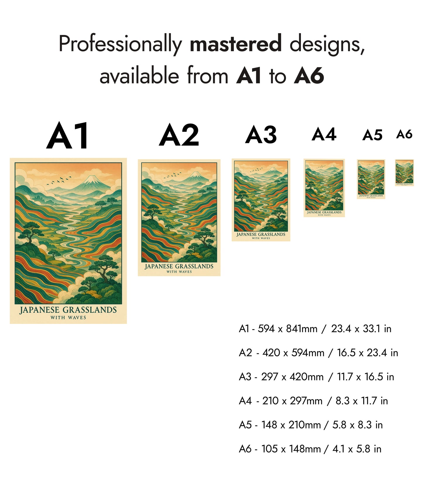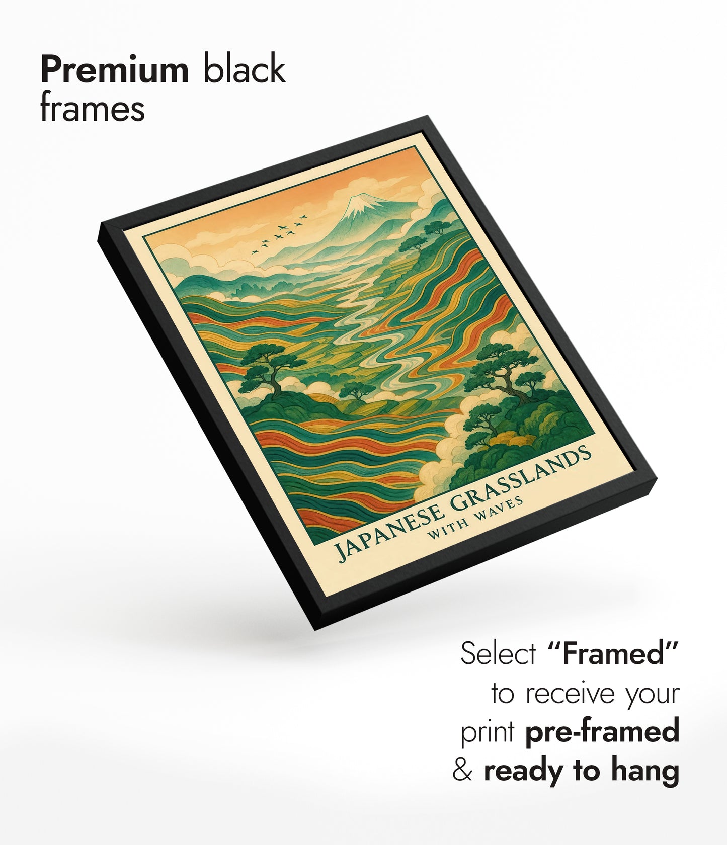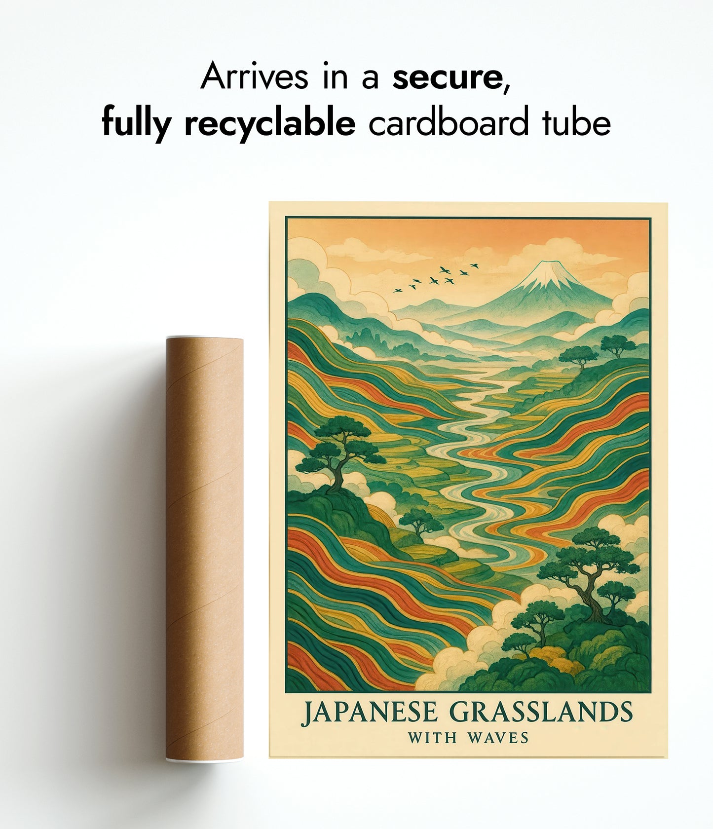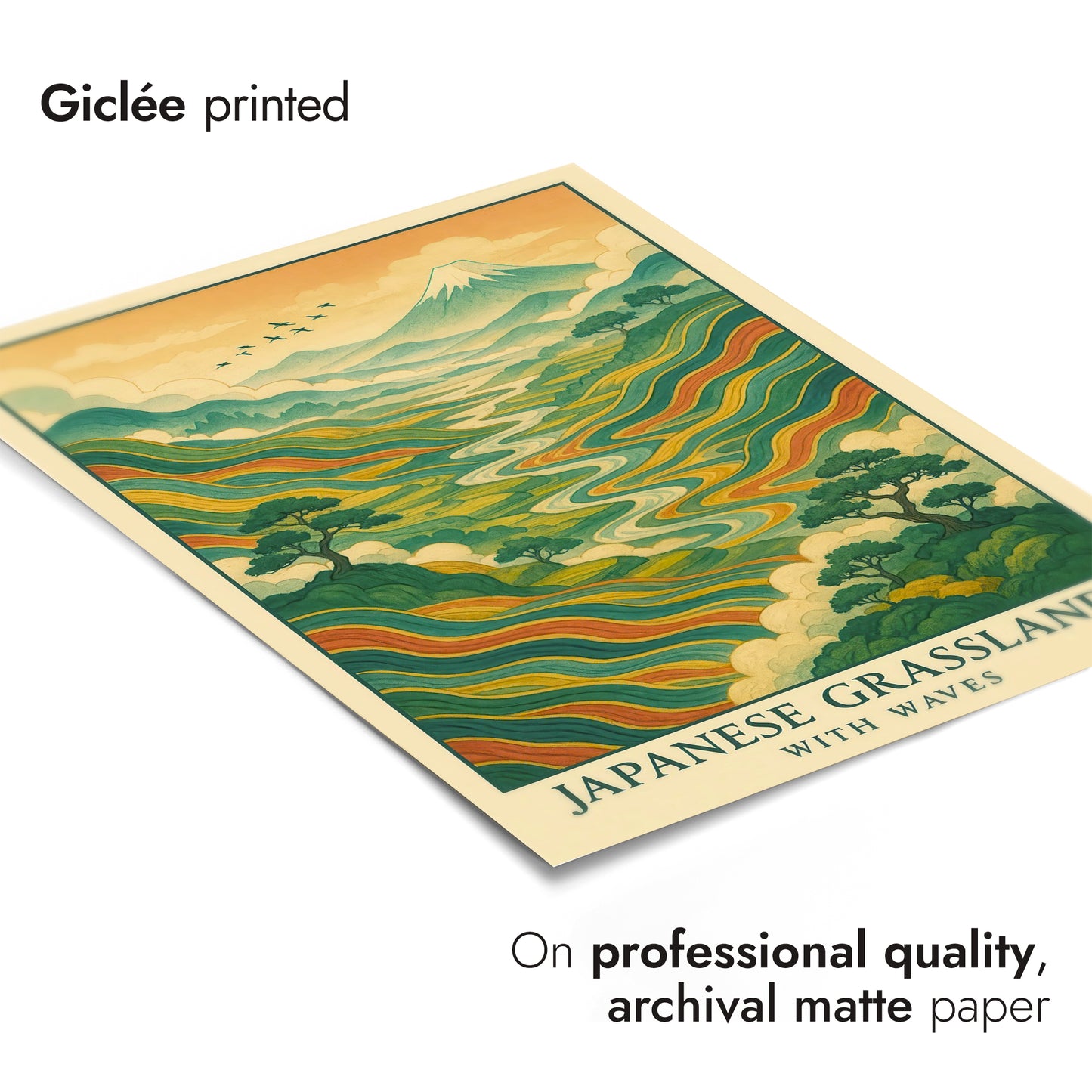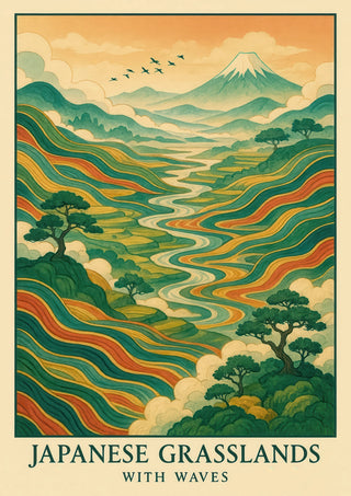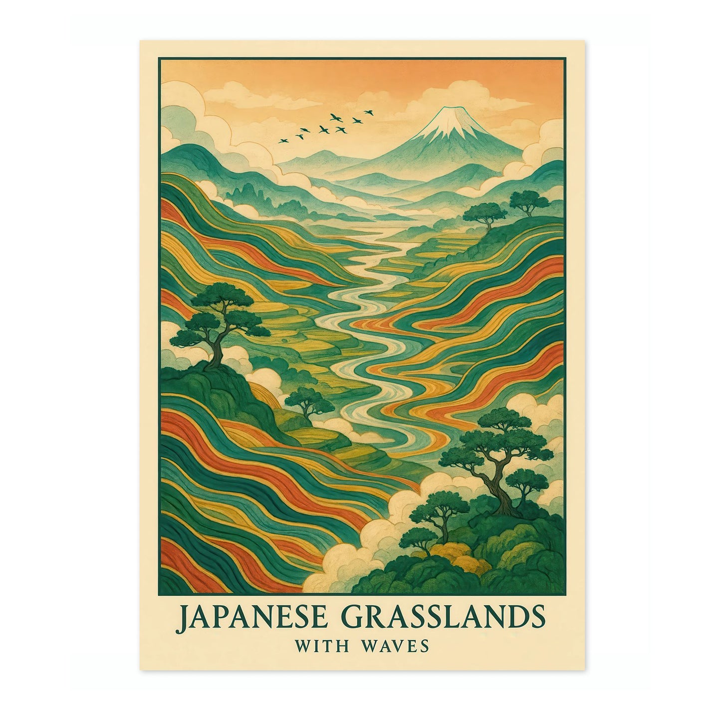 This poster captures the serene beauty of Japanese grasslands, featuring vibrant, wavy hills in shades of green and orange. A winding river leads the eye towards a majestic Mount Fuji under a softly clouded sky. Graceful trees accentuate the landscape, while birds soar overhead, all combining to create a harmonious and tranquil scene perfect for any space.
