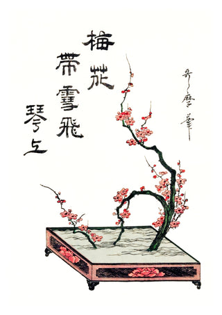 This poster features a traditional Japanese Ikebana plum branch arrangement by Kitagawa Utamaro. Delicately painted in Sumi-E style, it showcases blossoming plum flowers in an ornate, raised container. The intricate Japanese calligraphy adds cultural depth, making it a refined piece for any art enthusiast interested in traditional Japanese aesthetics and nature themes.