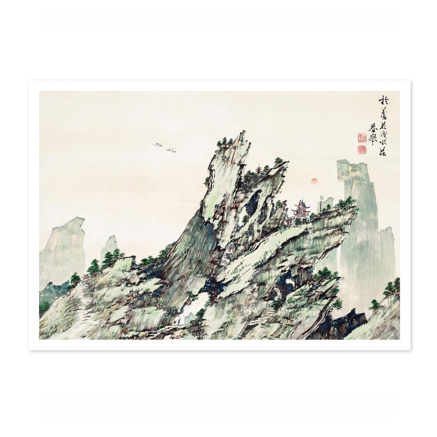 This traditional Japanese woodblock print, "Japanese Mount Hōrai" by Yamamoto Shunkyo (1871), captures the majestic cliffs and lush greenery of a mythical mountain. The dynamic composition features rugged rocks and delicate trees, with birds soaring above. The serene pastel tones of beige and green enhance its tranquil ambiance, making it a captivating addition to any art poster collection.