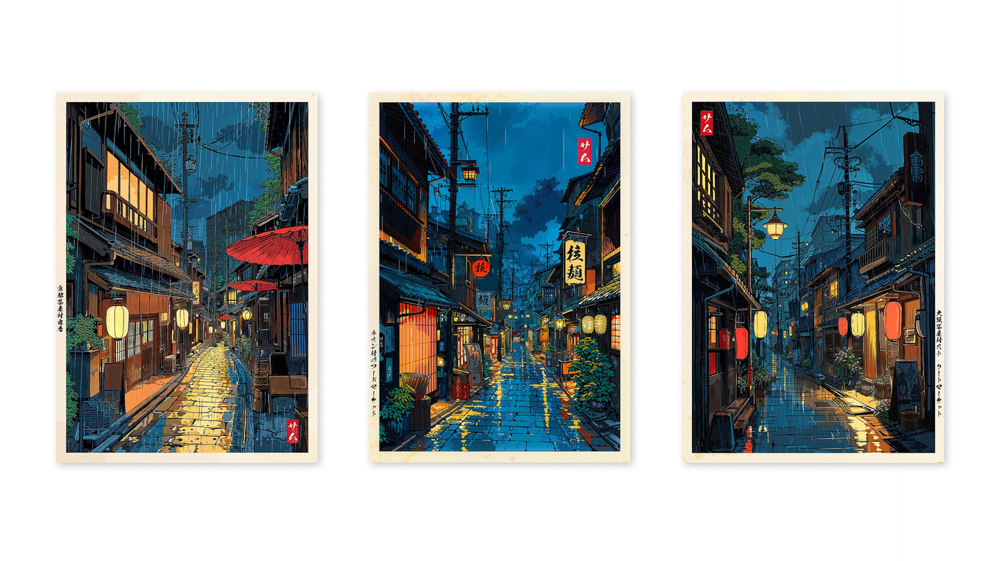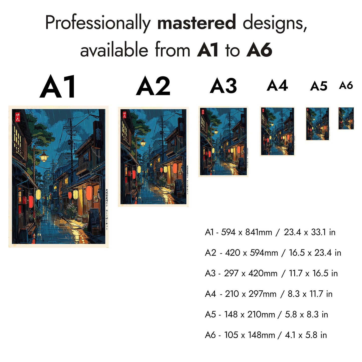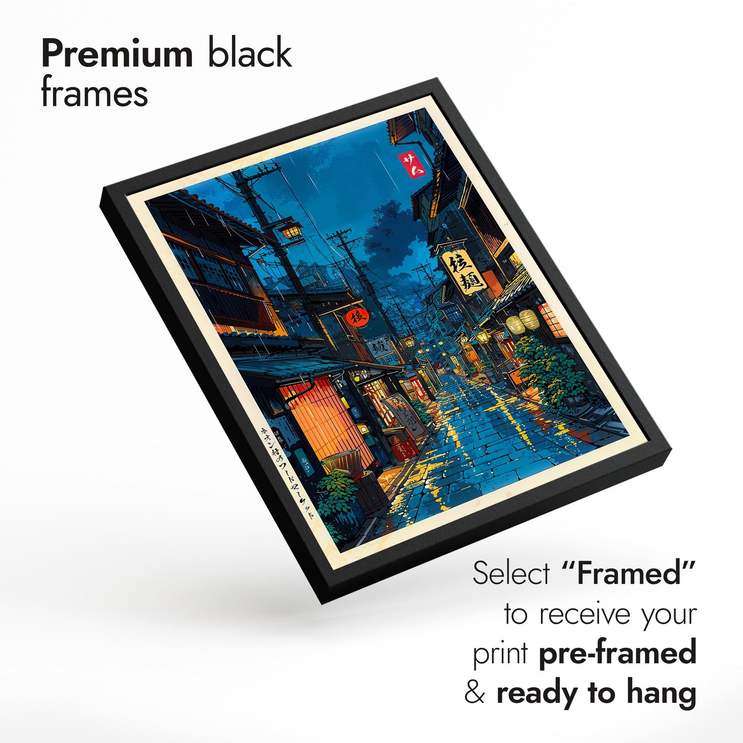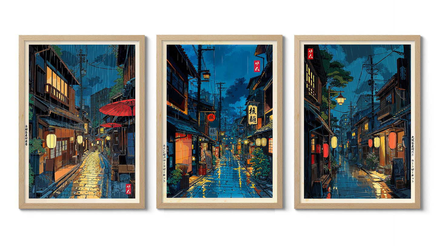 Capture the serene essence of a rainy night in Japan with this "Japanese Tea Houses" poster. Featuring traditional teahouses illuminated under a gentle glow, this blue-toned scene evokes the quiet charm of Osaka or Tokyo streets. With influences of woodblock and graphic illustration, it's a perfect addition for lovers of Japanese art and nightlife themes.