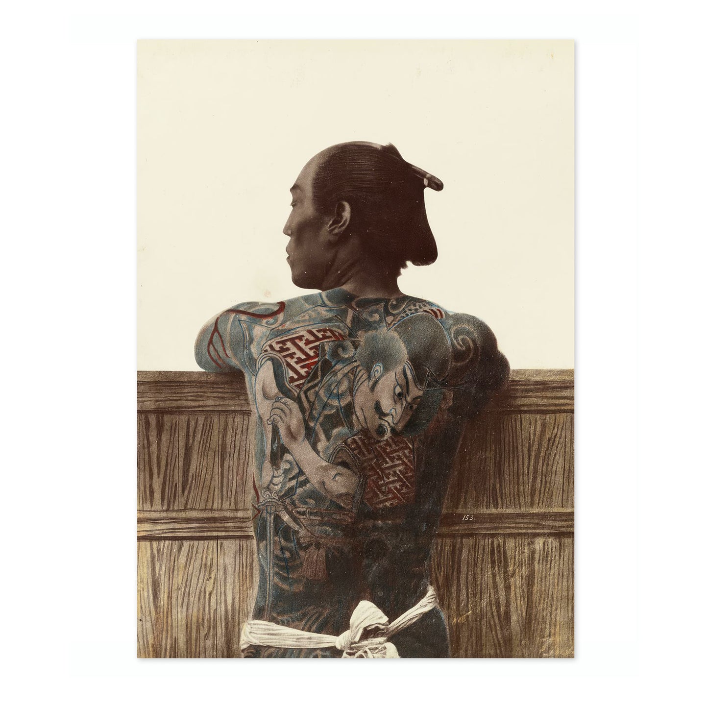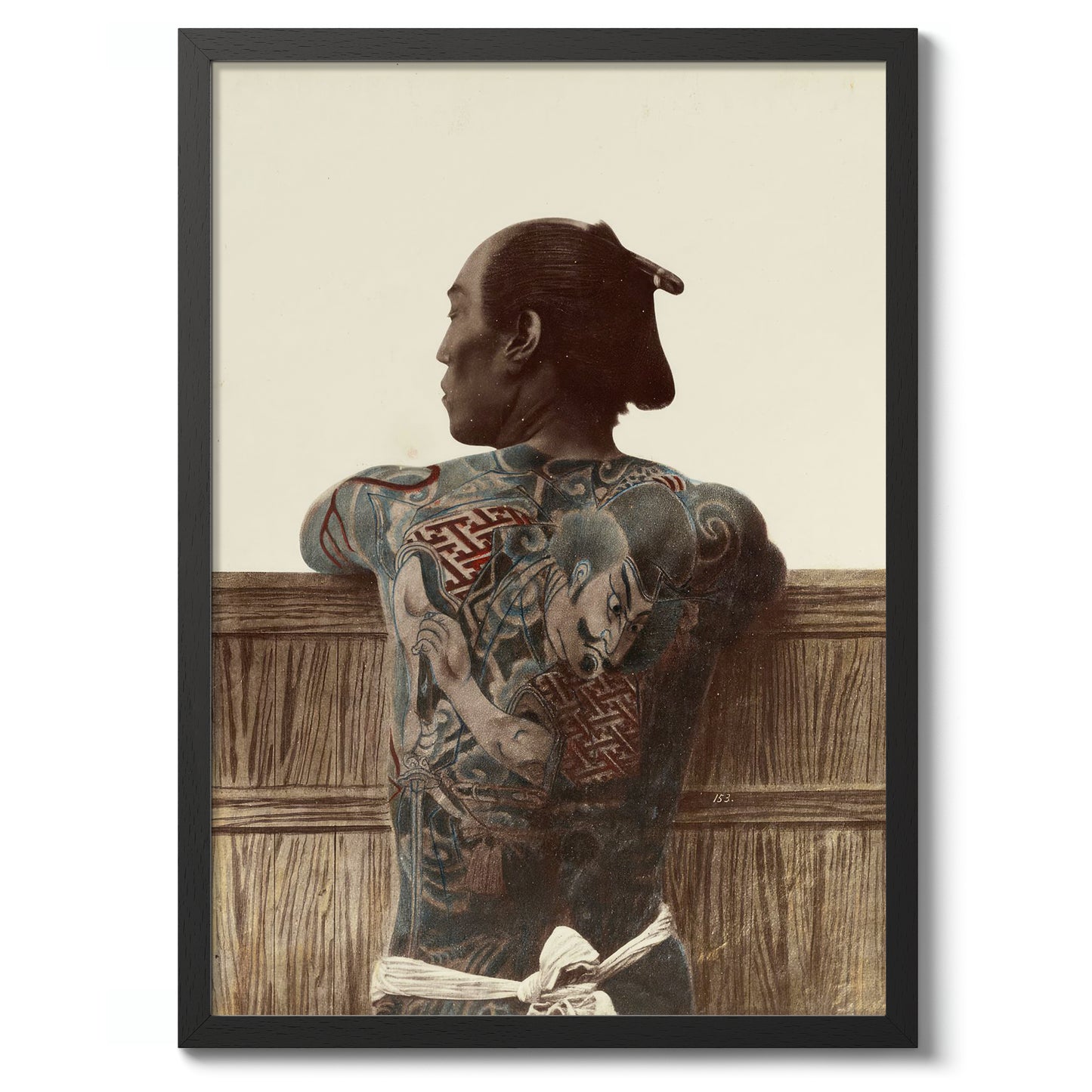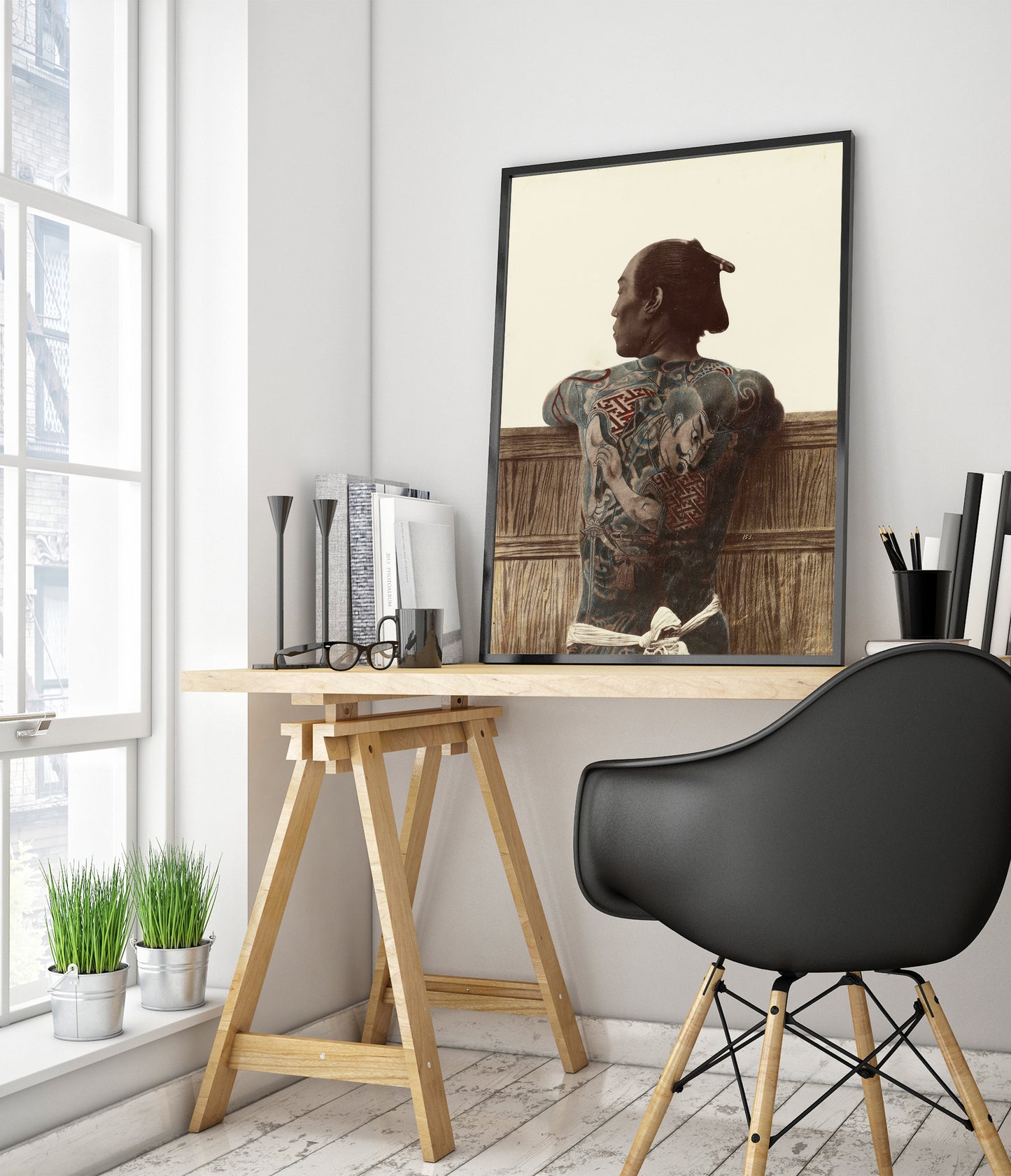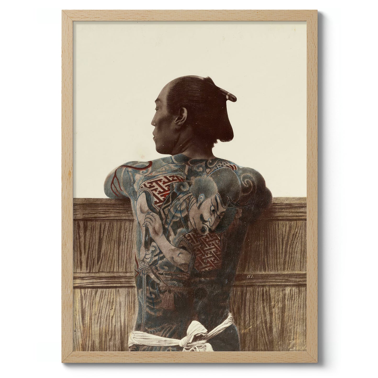 This photographic poster captures a Japanese man with an intricate Yakuza back tattoo, showcasing traditional Japanese artistry and design. The tattoo features vibrant, detailed imagery, highlighting cultural themes typical of Yakuza body art. The subtle tones and textures of the wooden background juxtapose the boldness of the tattoo, creating a striking visual balance. Perfect for fans of Japanese culture and tattoo artistry.