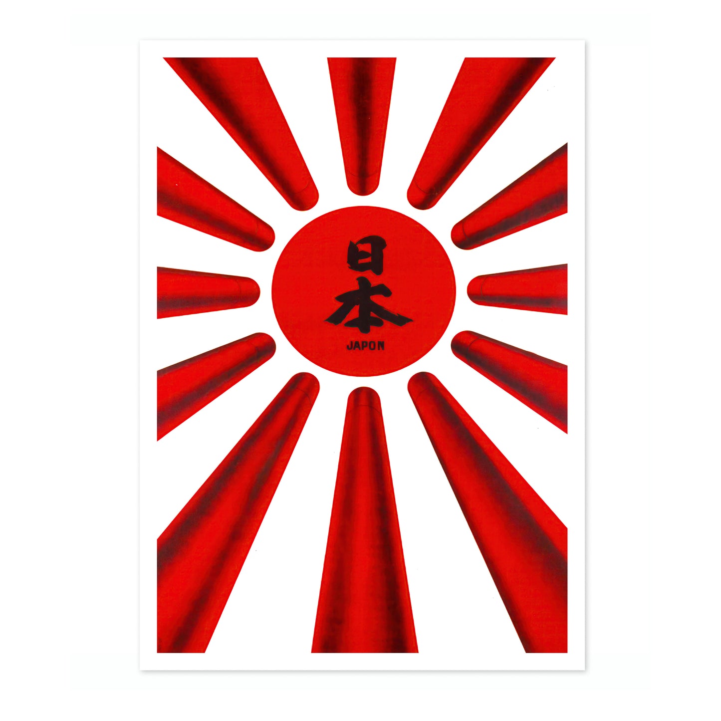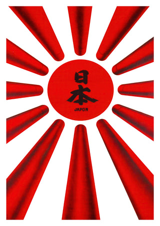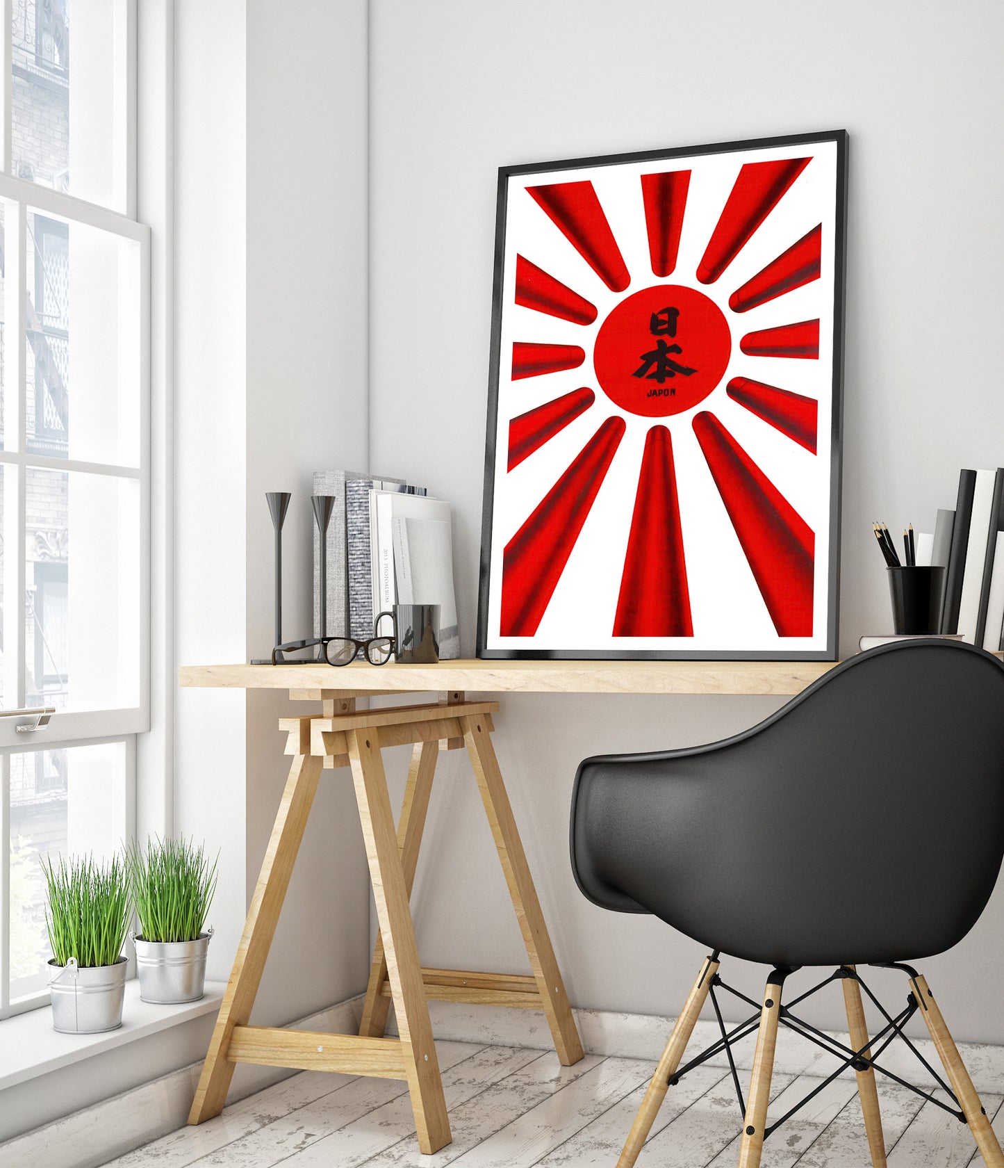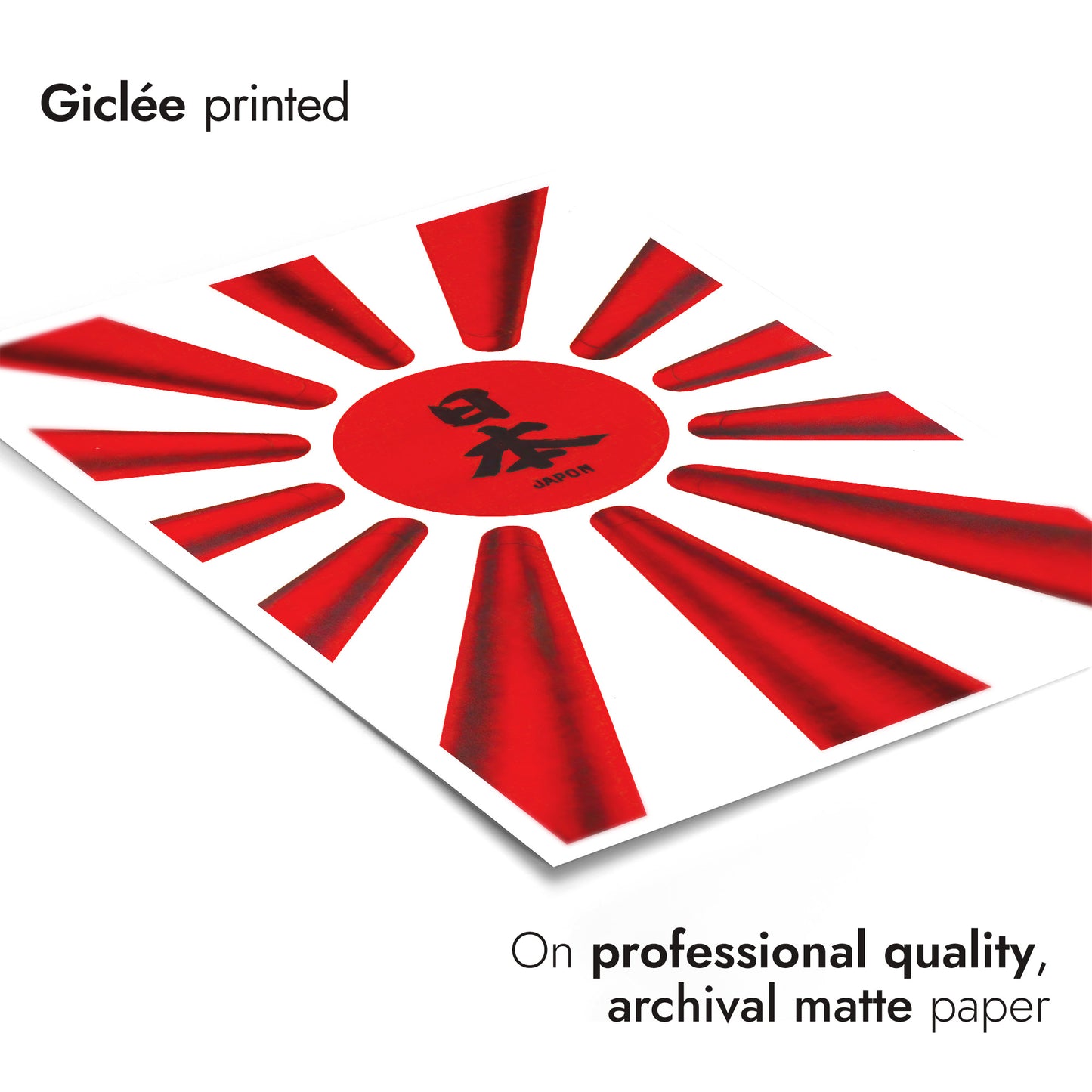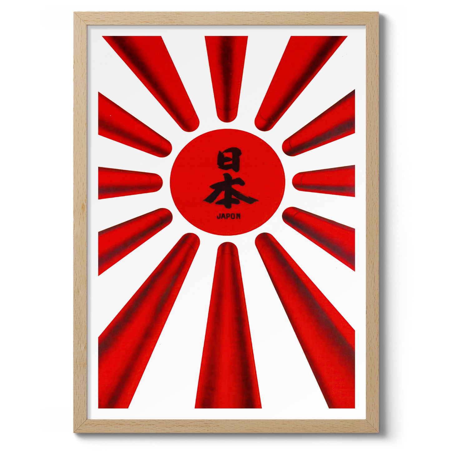 "Japon" Vintage Propaganda Poster features a bold red sunburst design on a white background, symbolizing Japan's rich heritage. The center spotlights Japanese characters with the word "Japon" prominently displayed. This graphic illustration captures the essence of Japanese national pride and history, making it an impactful addition to any space. Ideal for those interested in vintage and cultural art themes.