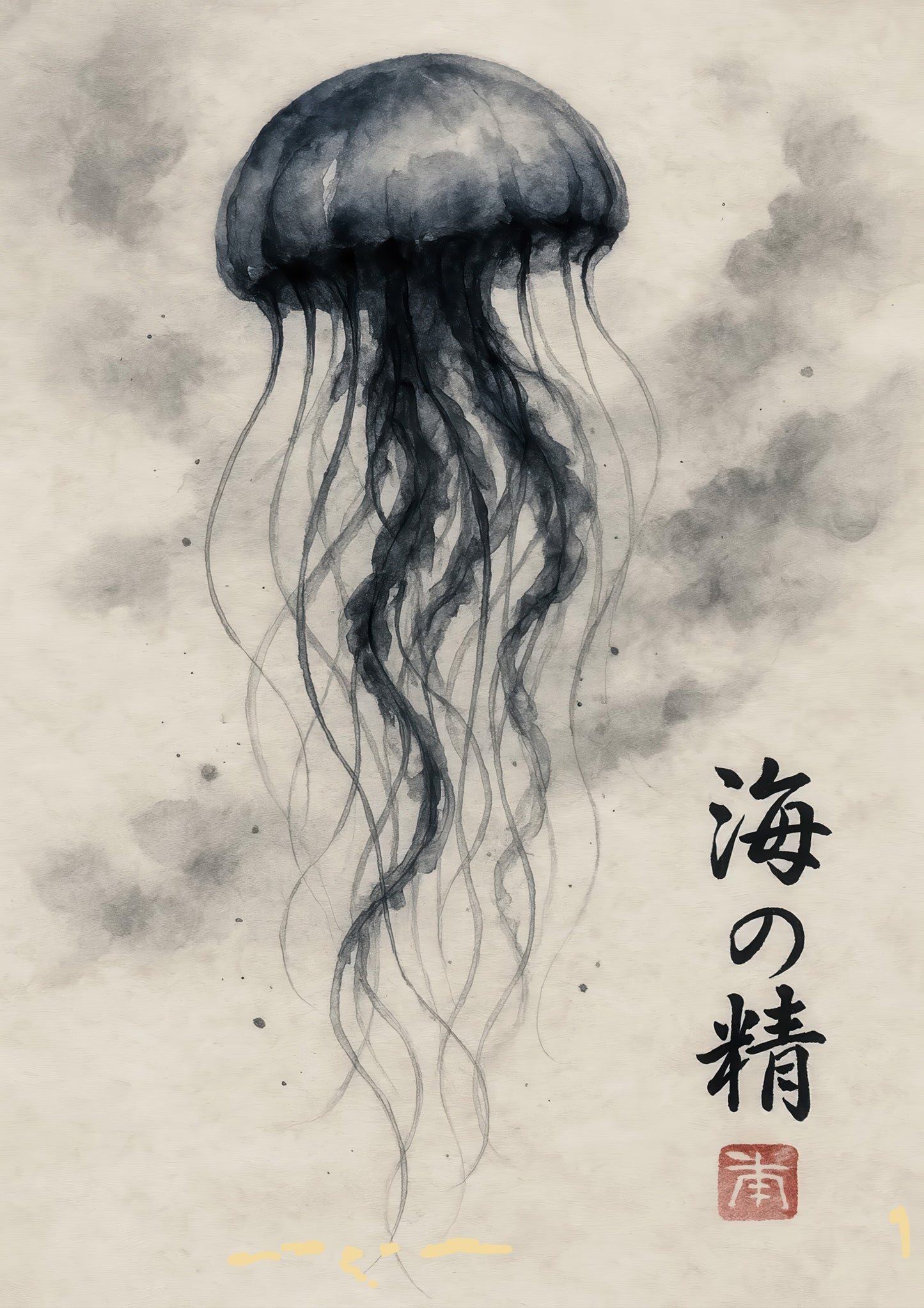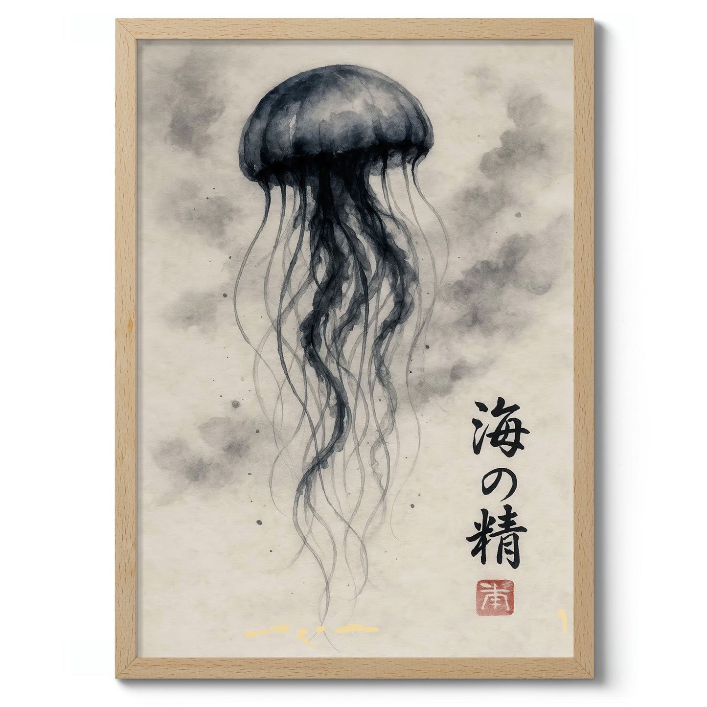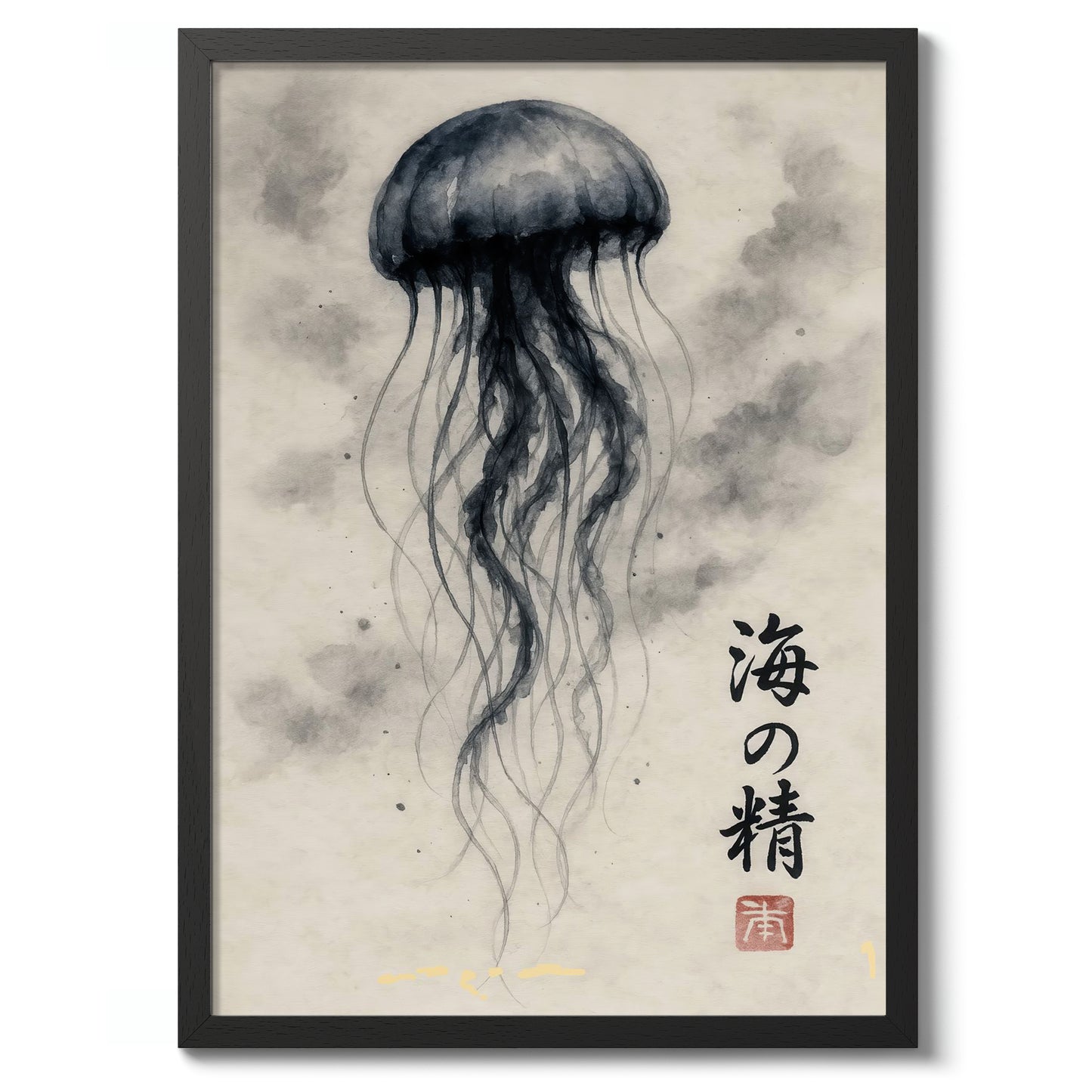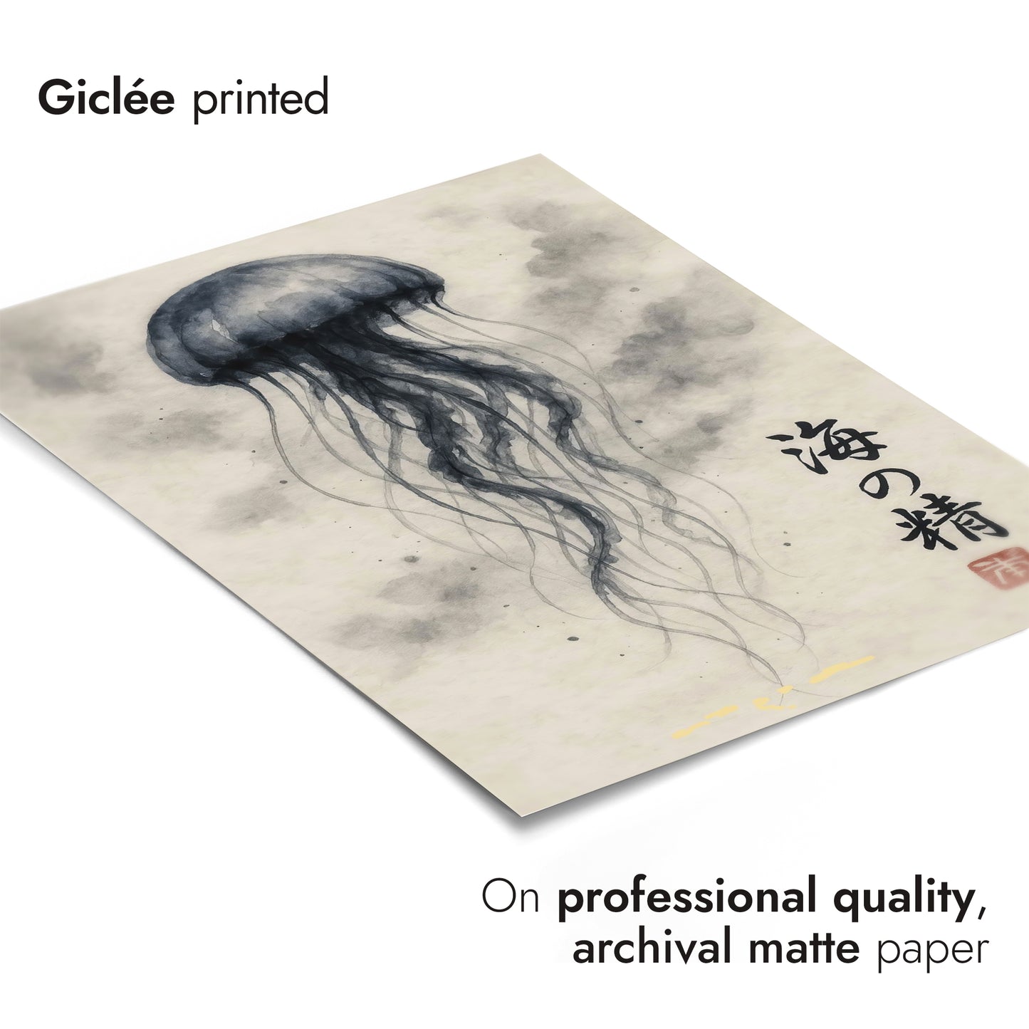 This Japanese-style poster features a captivating black and white watercolor depiction of a jellyfish, elegantly floating against a softly textured background. Delicate tentacles cascade down, capturing the ethereal essence of marine life. Accompanied by traditional Japanese calligraphy, this print seamlessly blends natural beauty with cultural artistry, making it an ideal addition to any ocean-inspired or minimalist décor.