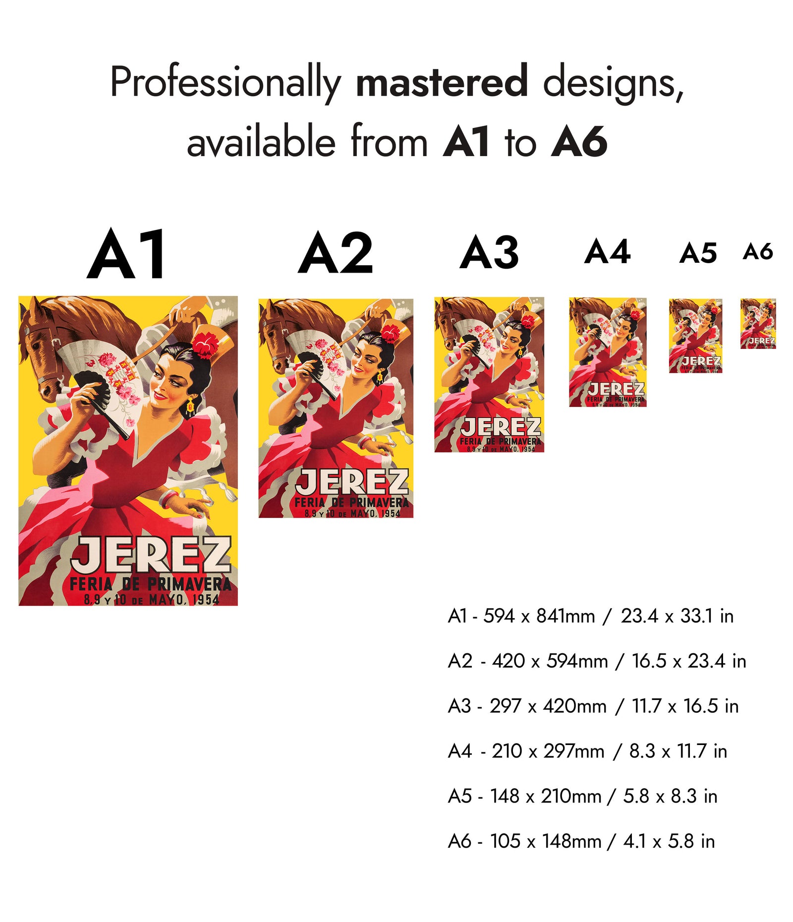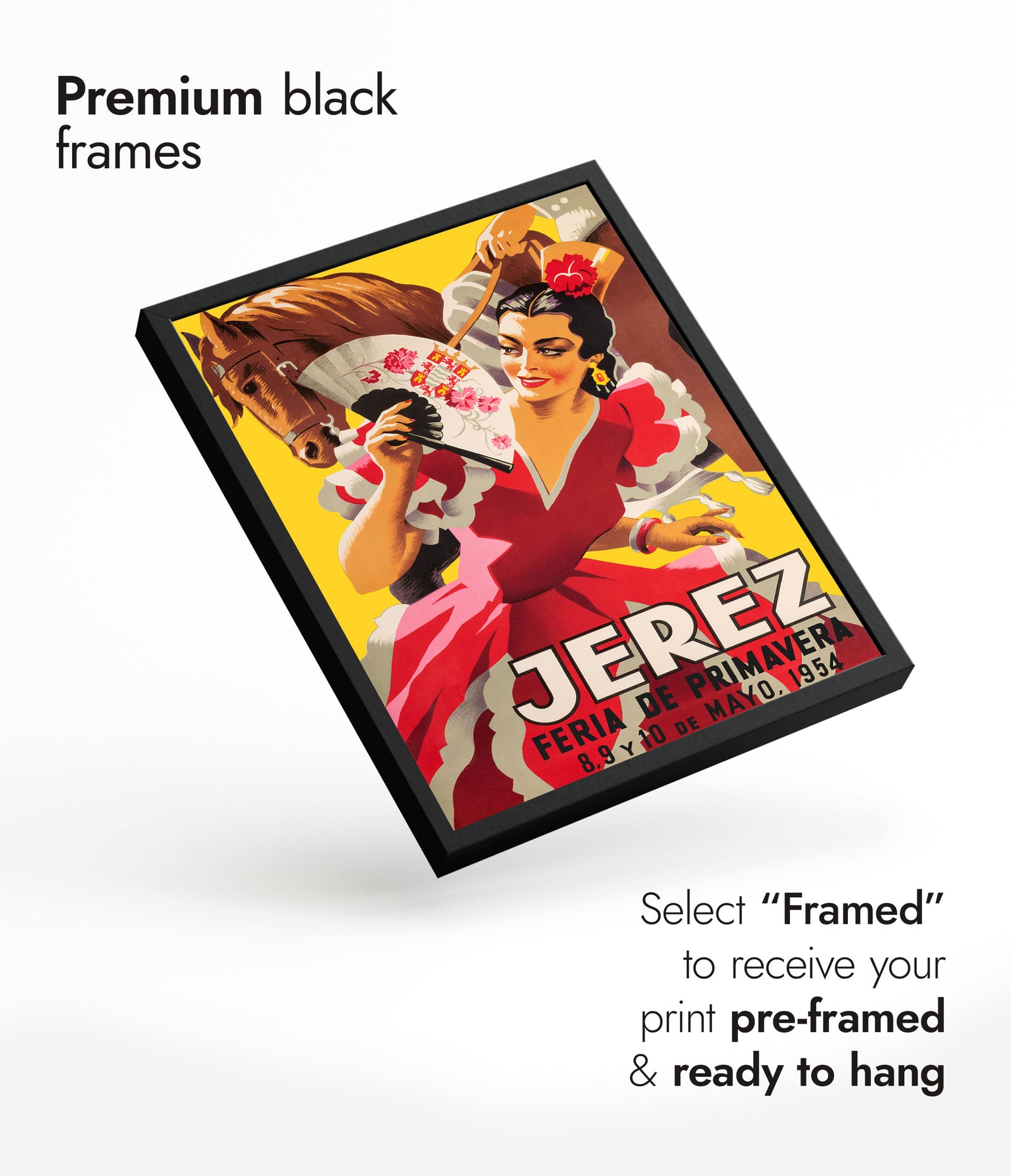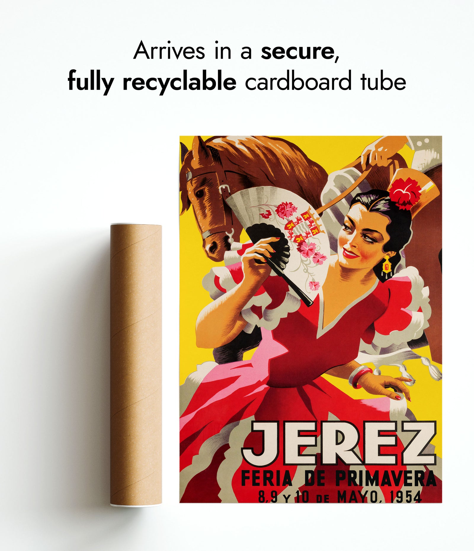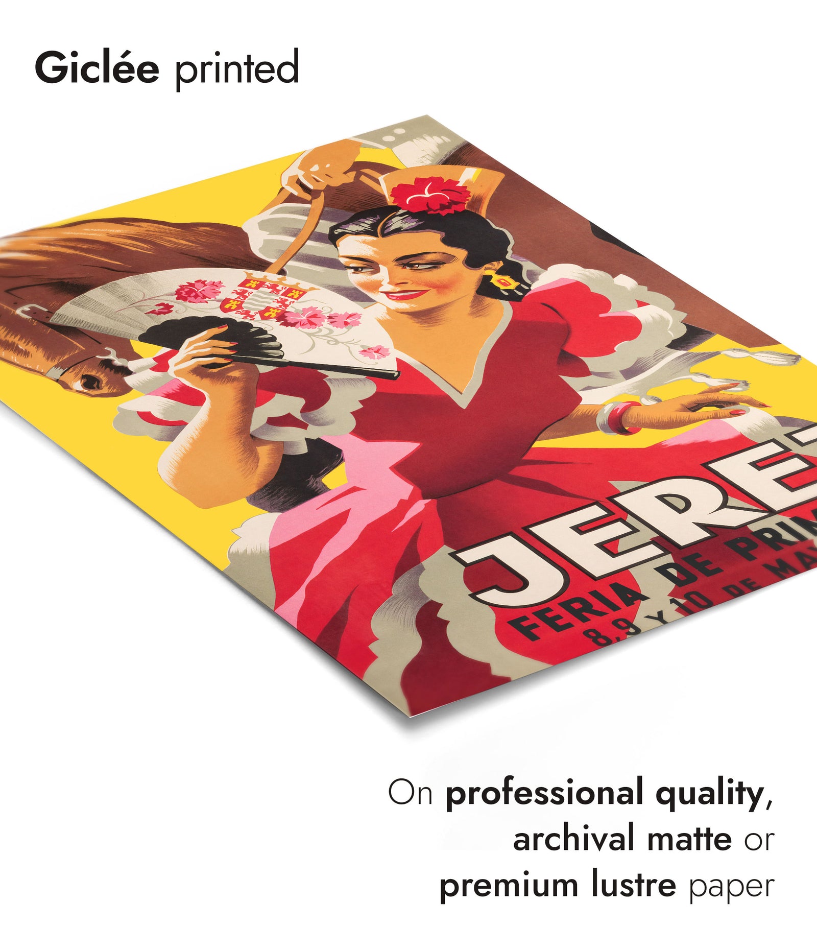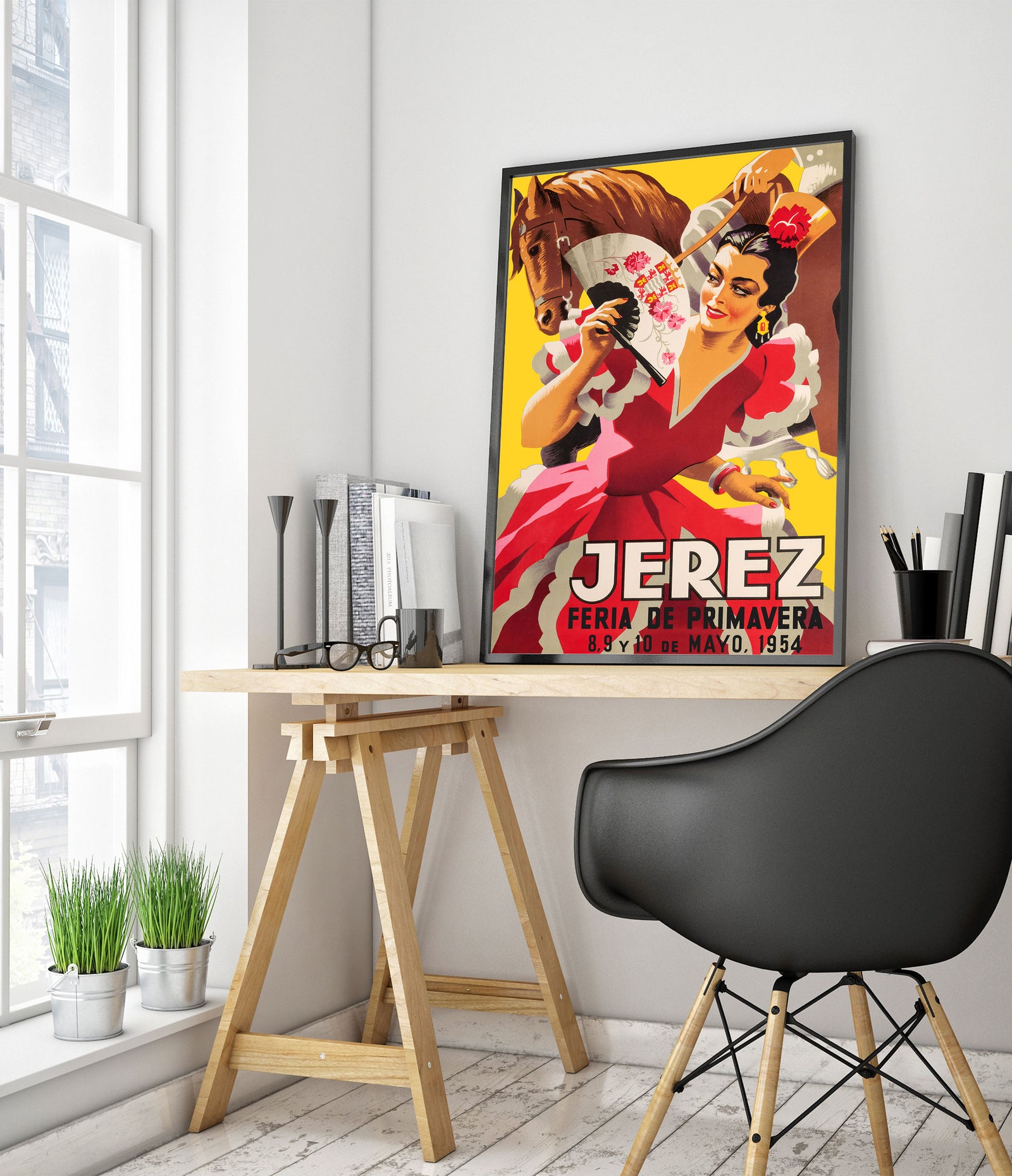 This vintage-inspired poster captures the vibrant essence of the Feria de Primavera in Jerez, Spain, dated May 8-10, 1954. A woman in a red flamenco dress, holding a detailed fan, dances with a backdrop of a horse, symbolizing the festival's spirited atmosphere. The bold yellow background and dynamic illustration make this piece a lively addition to any space celebrating Mediterranean culture.