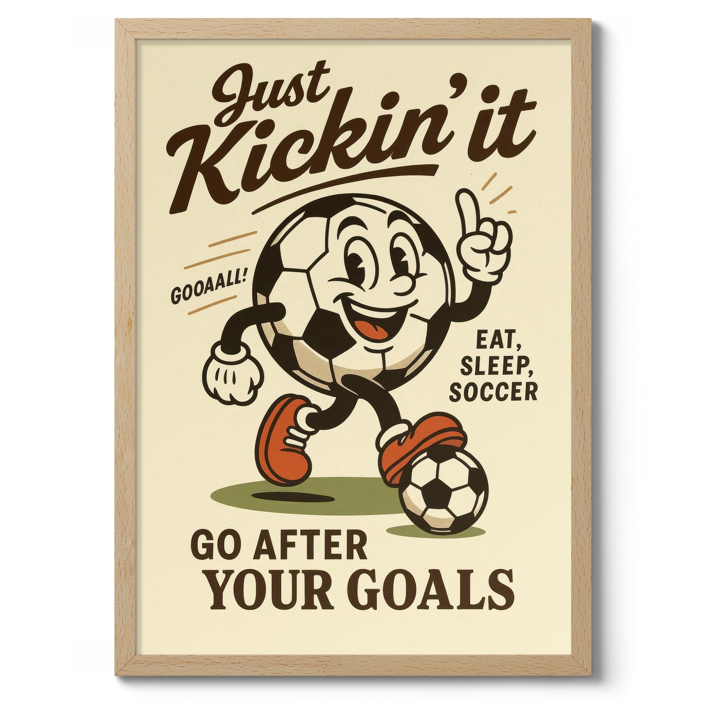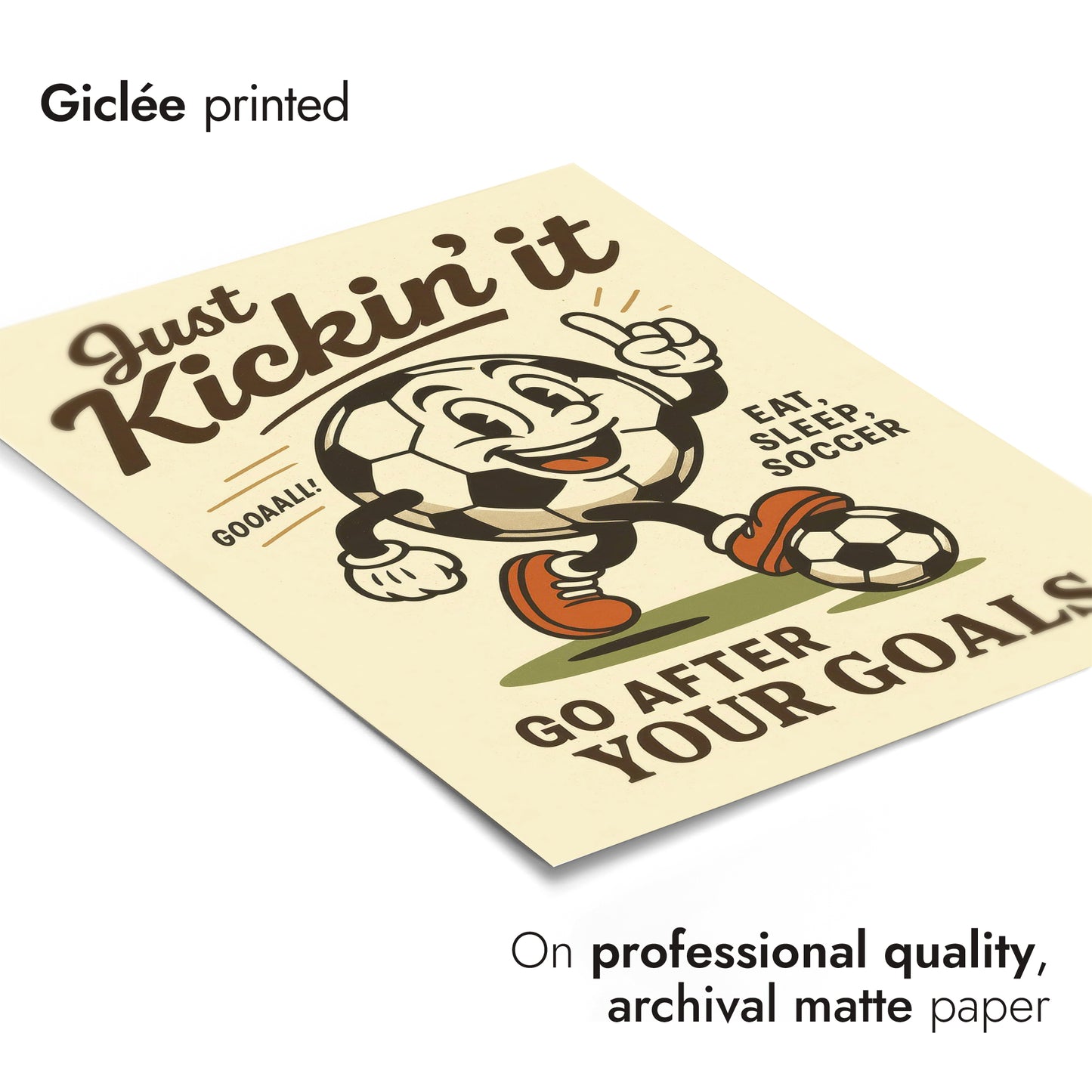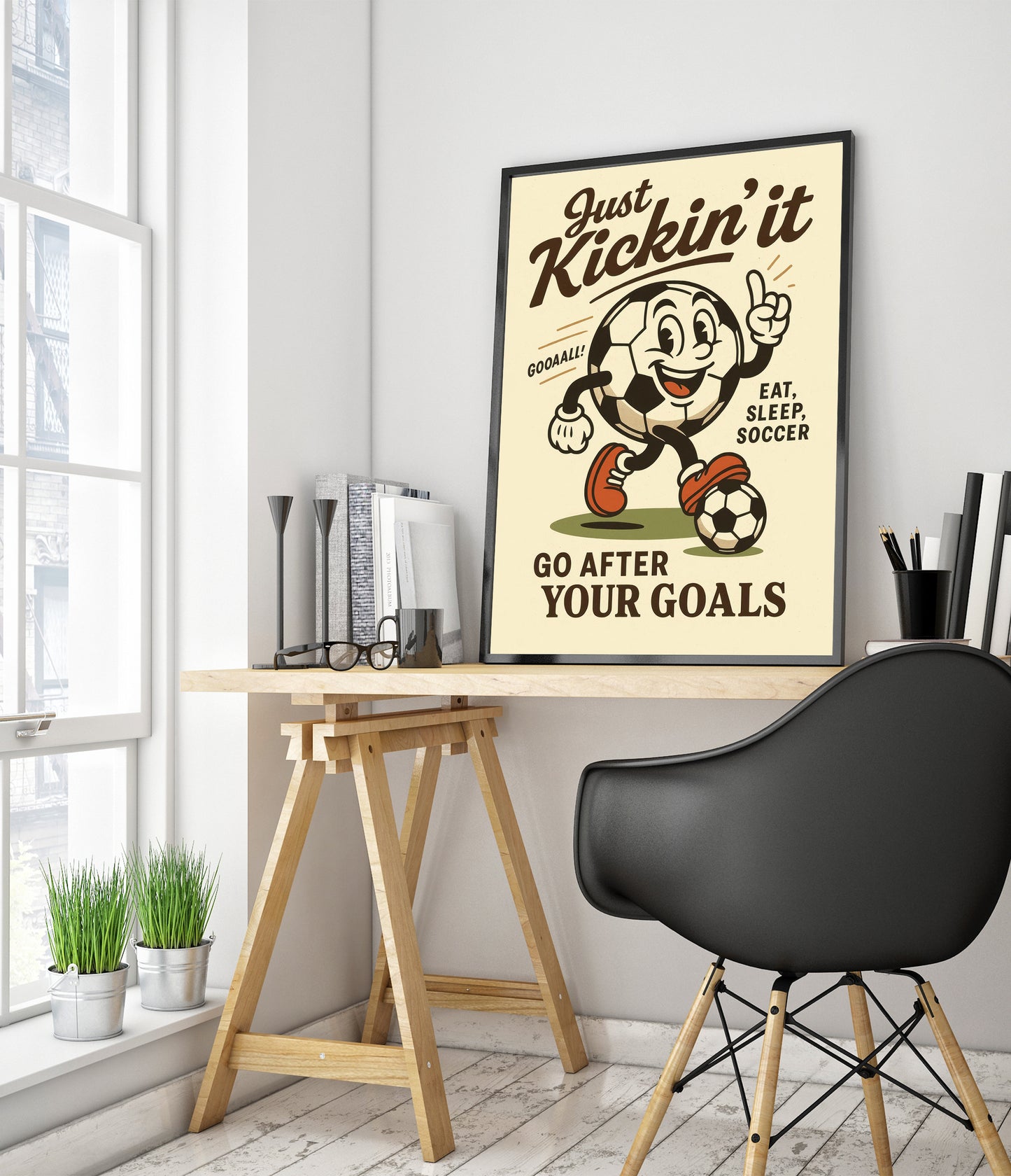 This vintage-style poster features a cheerful soccer ball mascot enthusiastically kicking a football, encapsulated by motivational text like "Just Kickin' it" and "Go After Your Goals." The retro typographic design complemented by a playful cartoon illustration on a beige background celebrates sports and inspiration, perfect for soccer enthusiasts seeking decorative art.