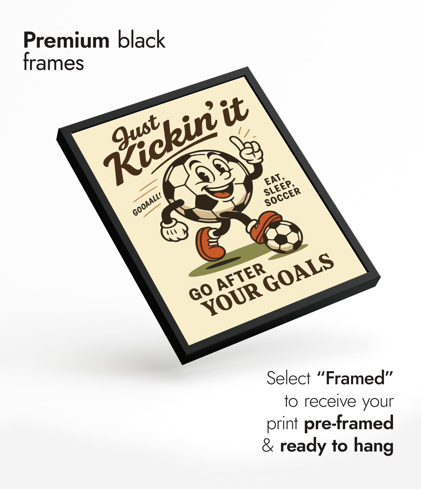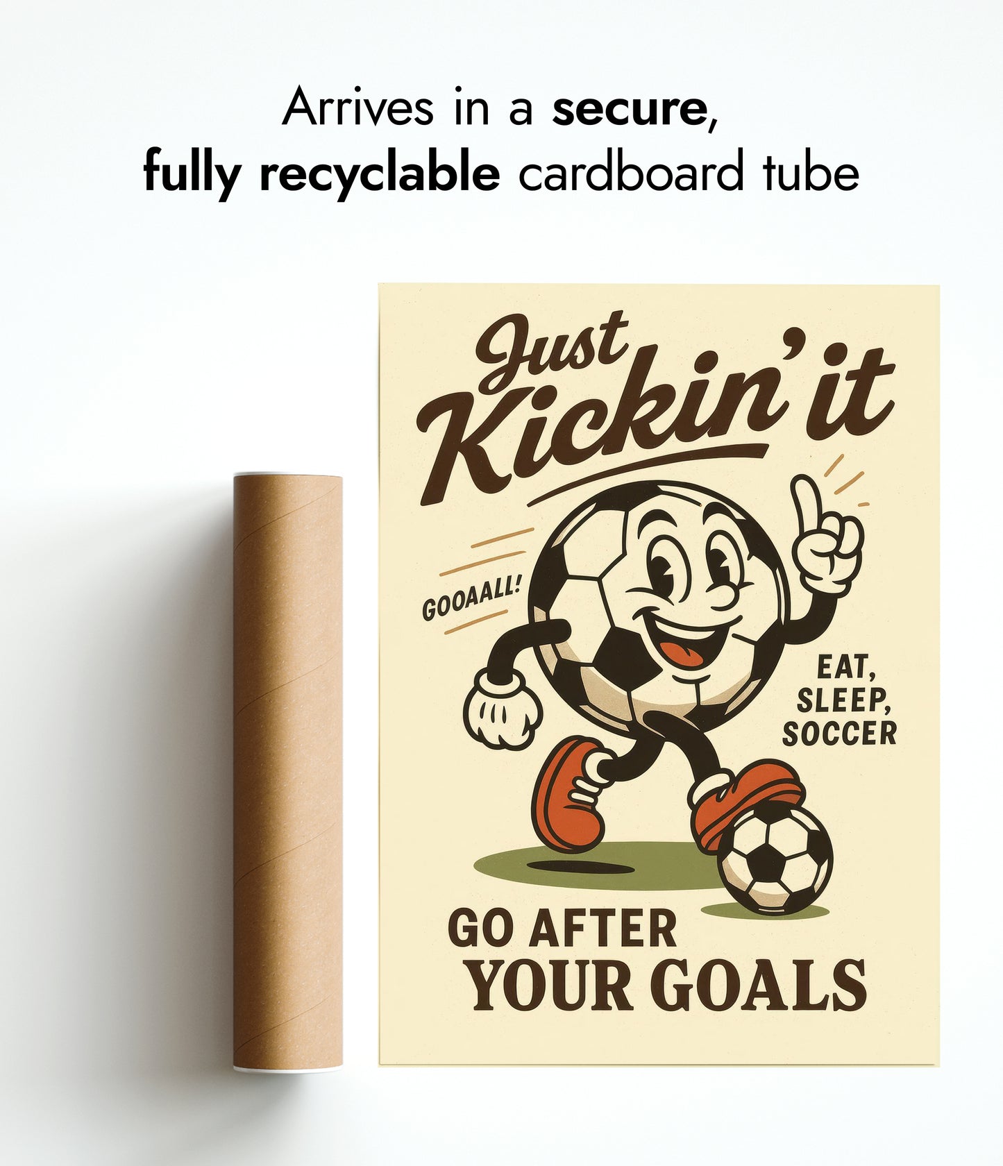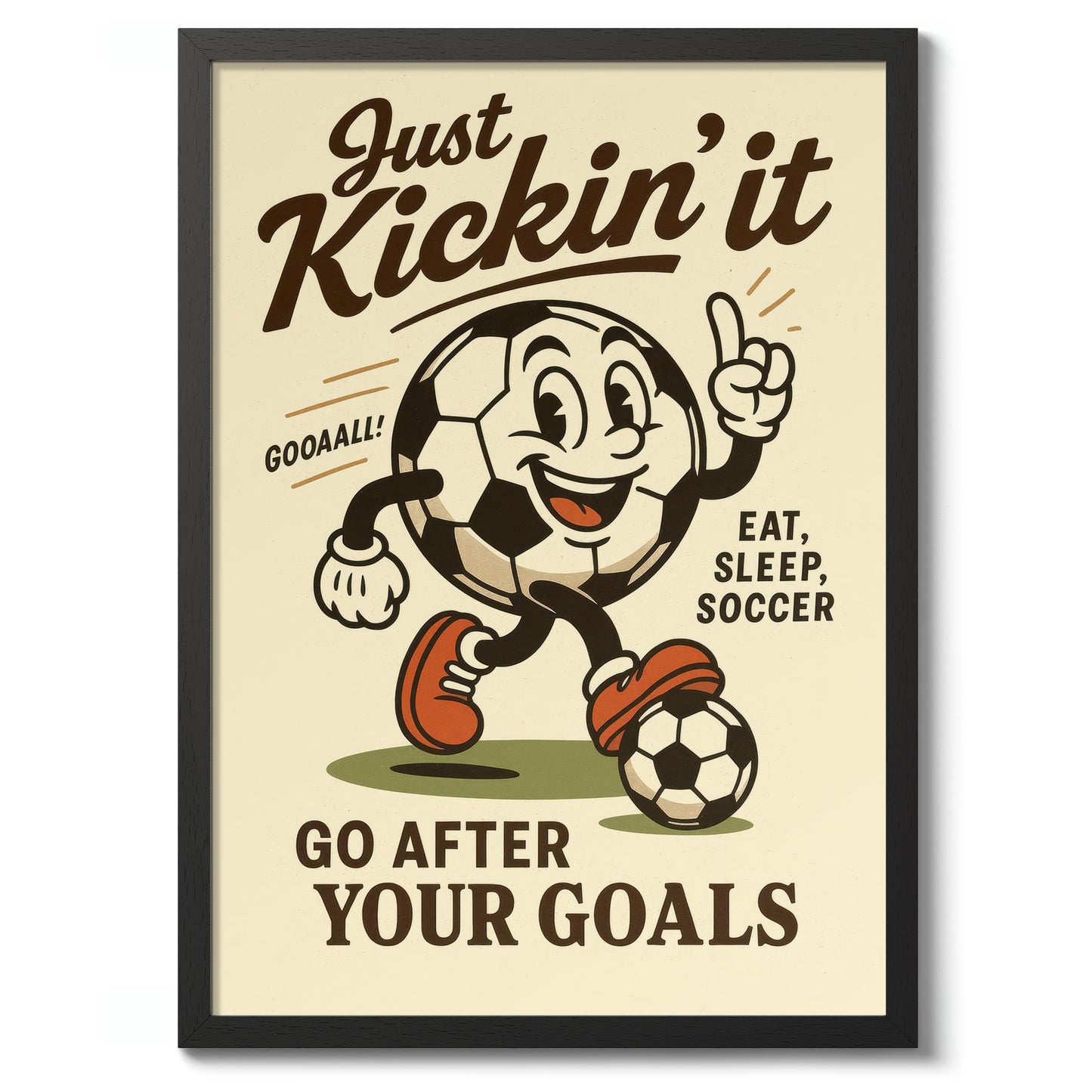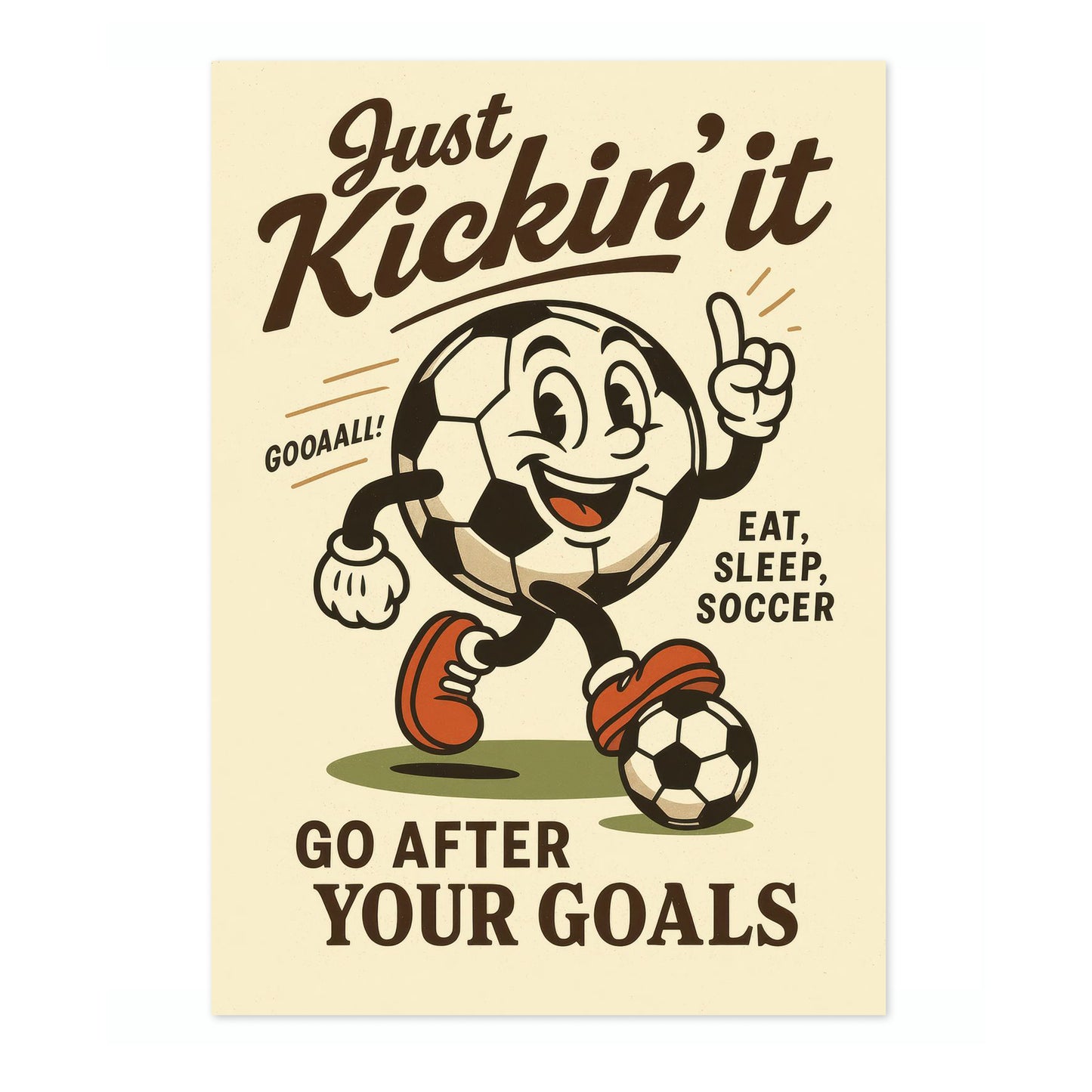 This vintage-style poster features a cheerful soccer ball mascot enthusiastically kicking a football, encapsulated by motivational text like "Just Kickin' it" and "Go After Your Goals." The retro typographic design complemented by a playful cartoon illustration on a beige background celebrates sports and inspiration, perfect for soccer enthusiasts seeking decorative art.