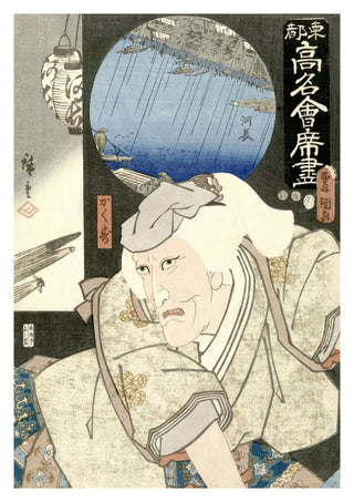 This Japanese woodblock poster titled "Kakuju in Kawacho" by Utagawa Kunisada captures a Kabuki actor in an expressive, traditional costume. The intricate details and flowing lines epitomize the Ukiyo-E style, showcasing theatrical elements with a dramatic portrayal. The backdrop features a serene blue setting, enhancing the depth and historical essence of the artwork. Perfect for fans of classical Japanese theatre and illustration.