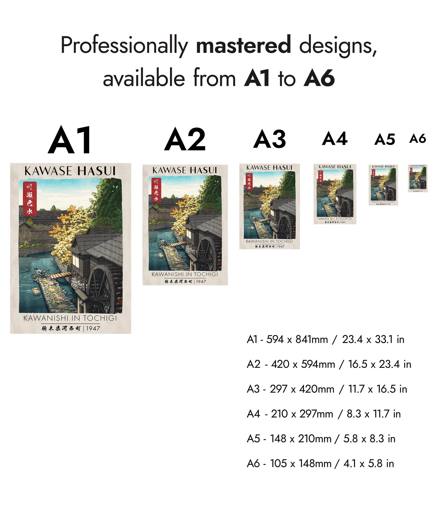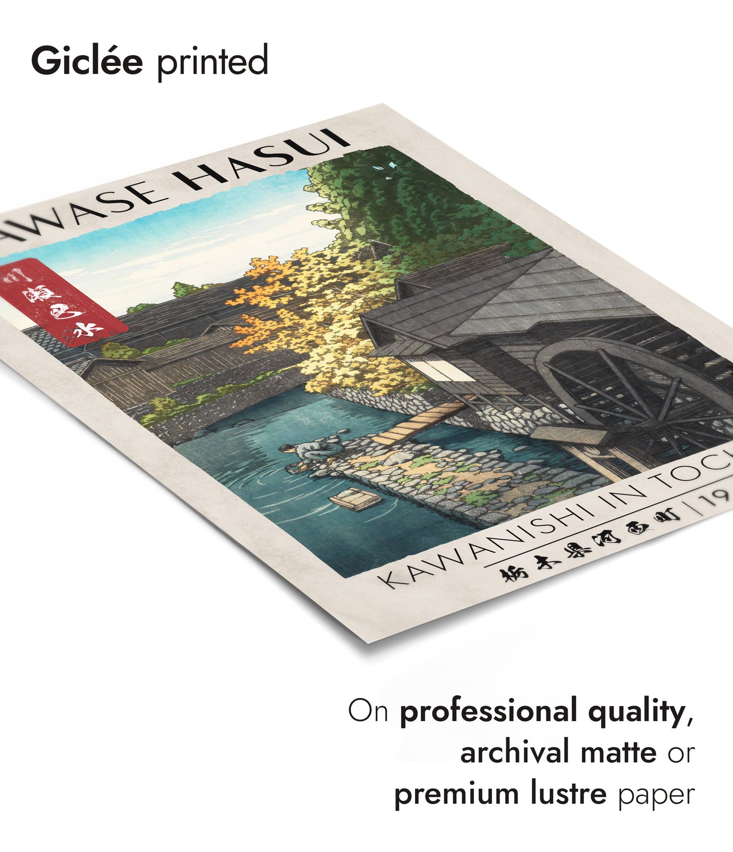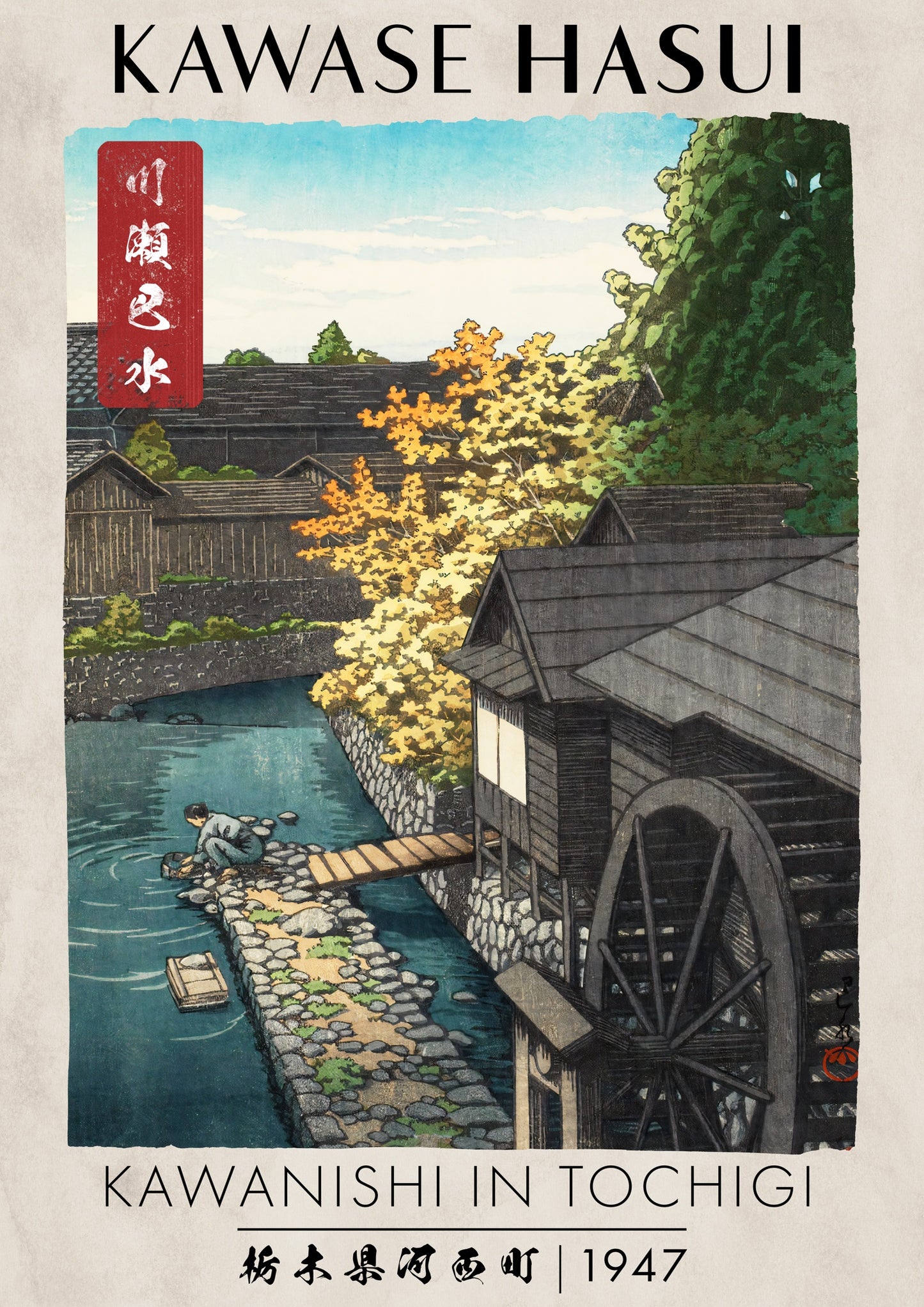 Experience the serene beauty of "Kawanishi in Tochigi" by Kawase Hasui with this stunning portrait poster. This Japanese woodblock print captures a tranquil riverside scene, featuring traditional architecture, a stone bridge, and lush nature in vibrant colours. Ideal for adding a touch of Japanese elegance and tranquility to any space. Perfect for enthusiasts of ukiyo-e and landscape art.