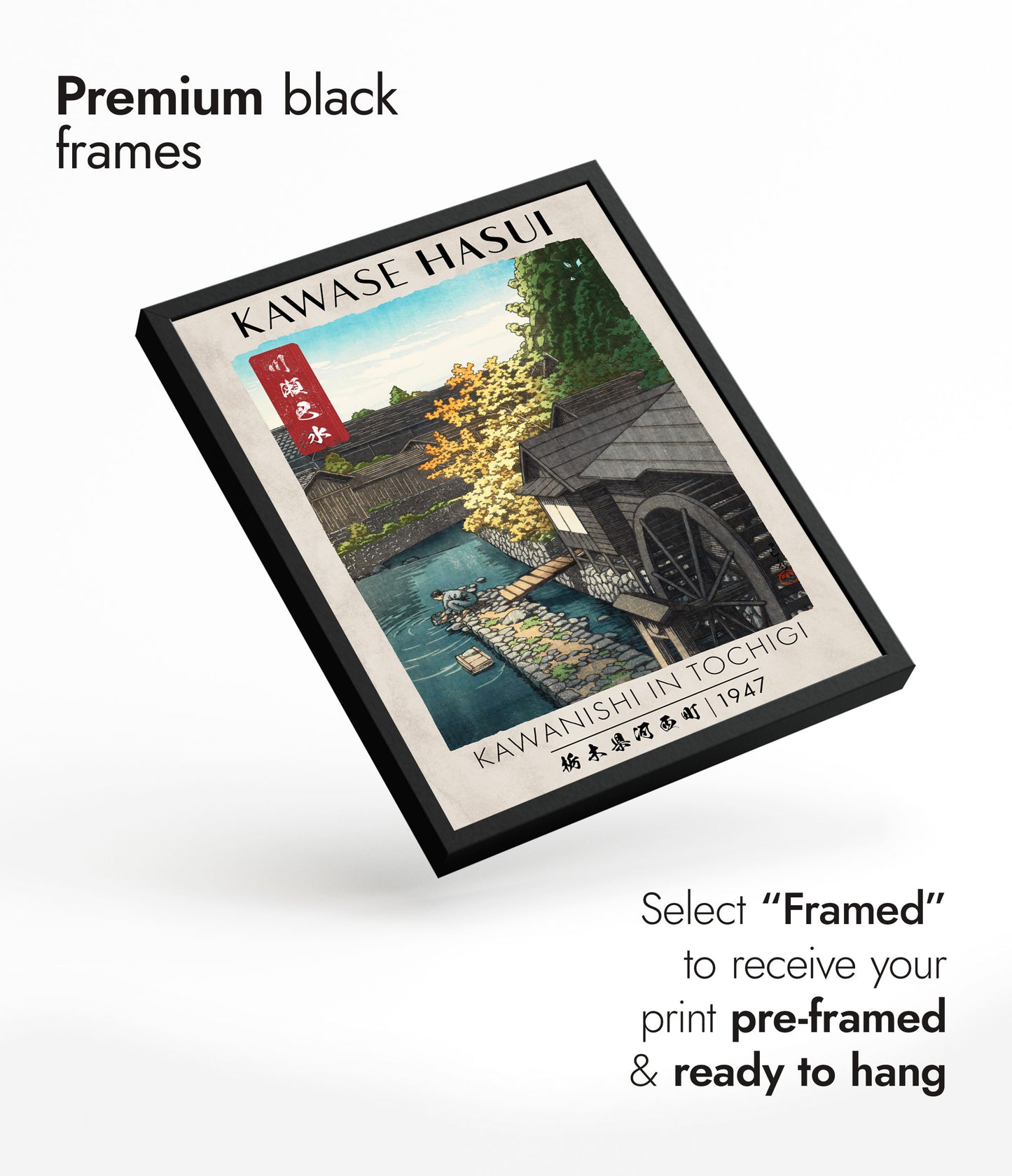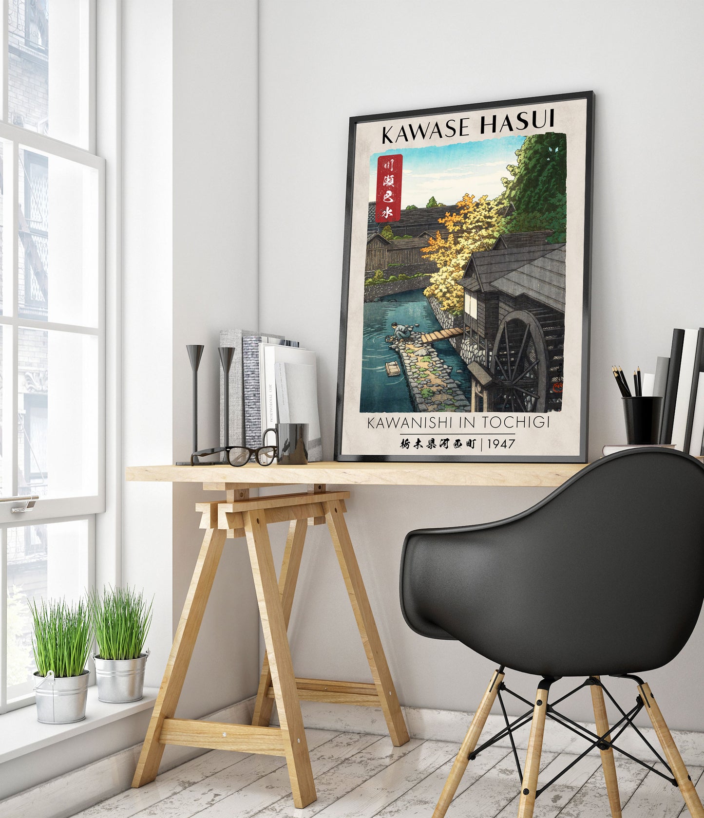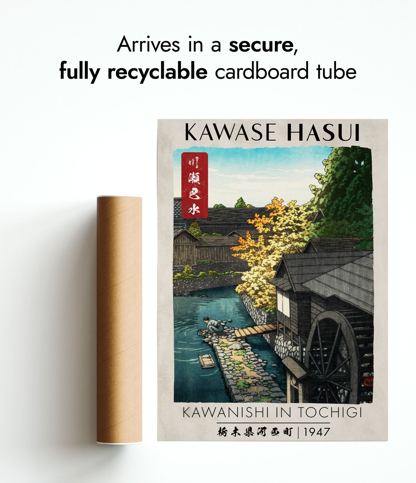 Experience the serene beauty of "Kawanishi in Tochigi" by Kawase Hasui with this stunning portrait poster. This Japanese woodblock print captures a tranquil riverside scene, featuring traditional architecture, a stone bridge, and lush nature in vibrant colours. Ideal for adding a touch of Japanese elegance and tranquility to any space. Perfect for enthusiasts of ukiyo-e and landscape art.
