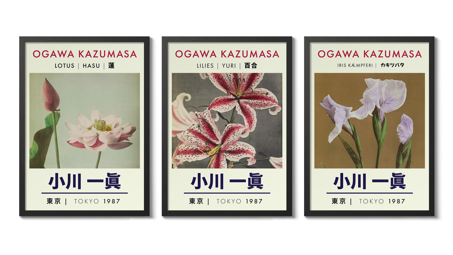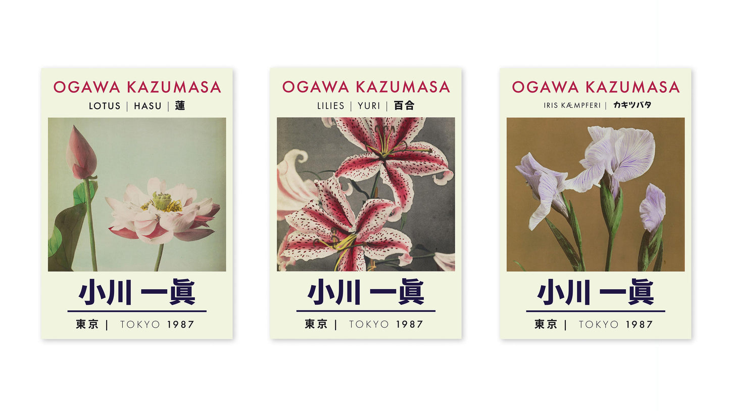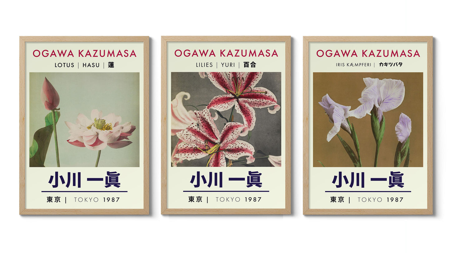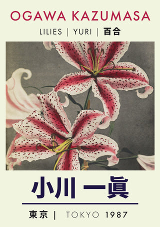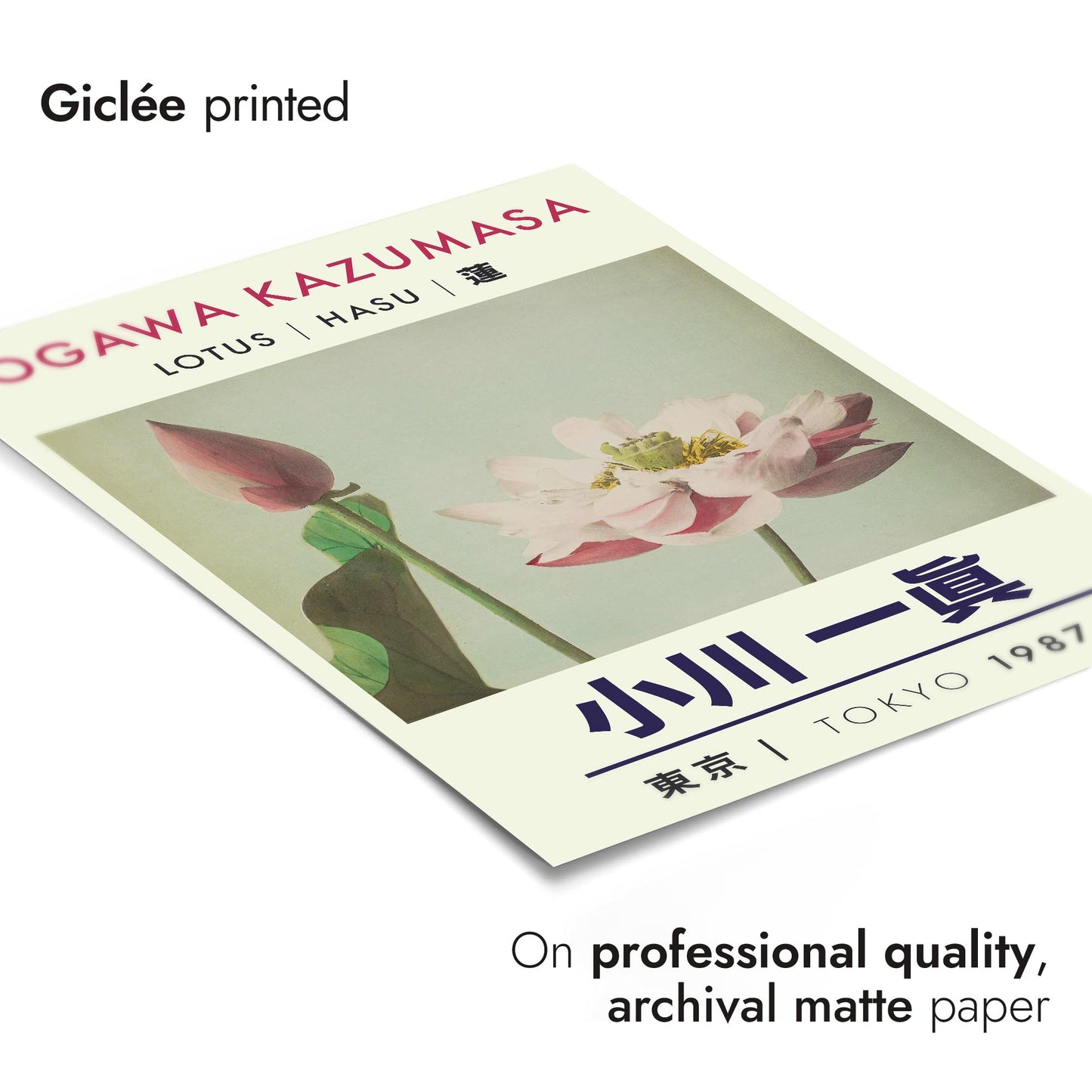 This poster set, featuring Ogawa Kazumasa's captivating floral images, beautifully showcases his intricate photographic still life work from the Japanese exhibition in Tokyo, 1987. The collection includes elegant depictions of lotus, lilies, and iris flowers, capturing their delicate forms and vibrant colors against a muted beige backdrop. Ideal for adding a touch of vintage Japanese art to any space.