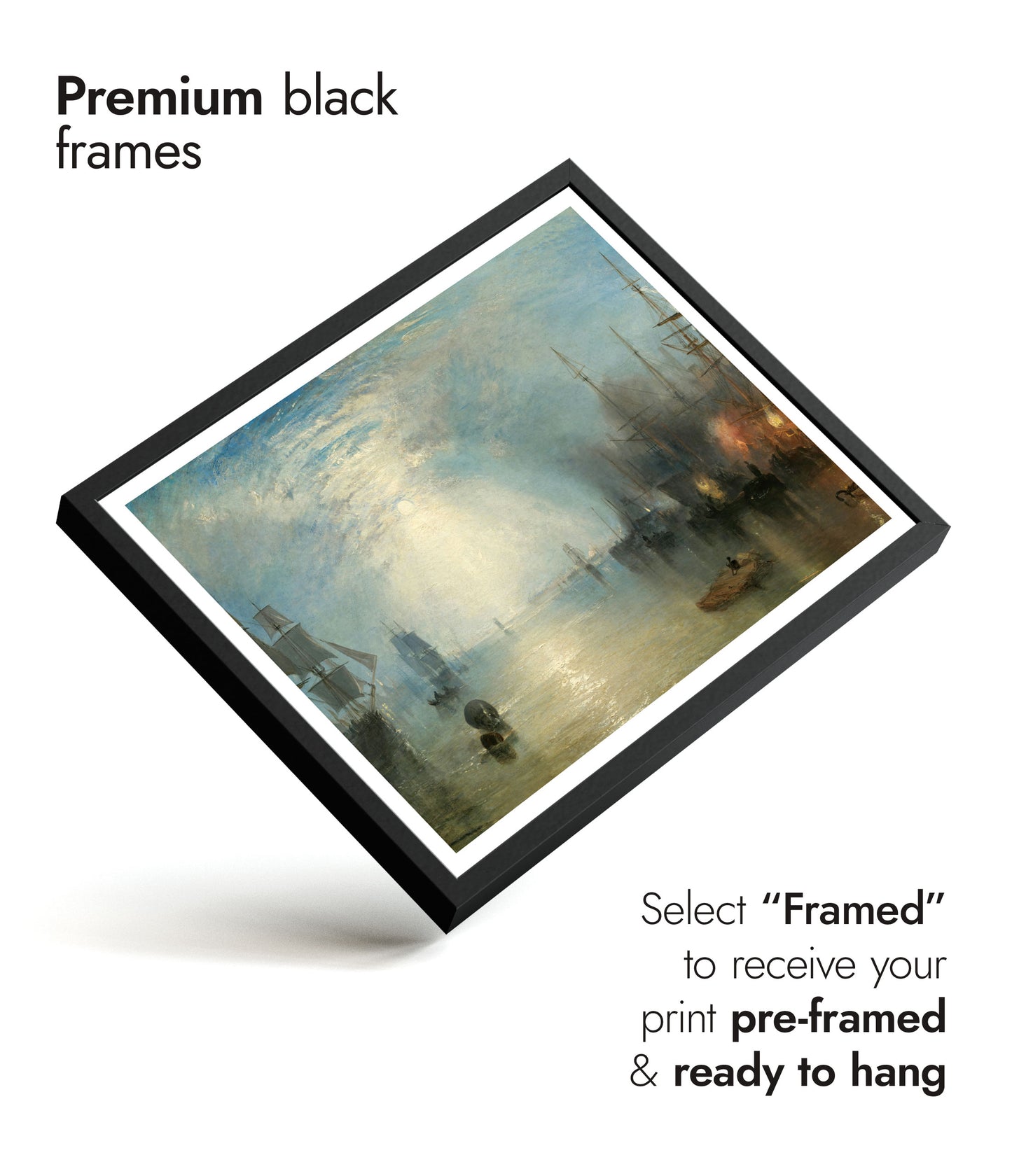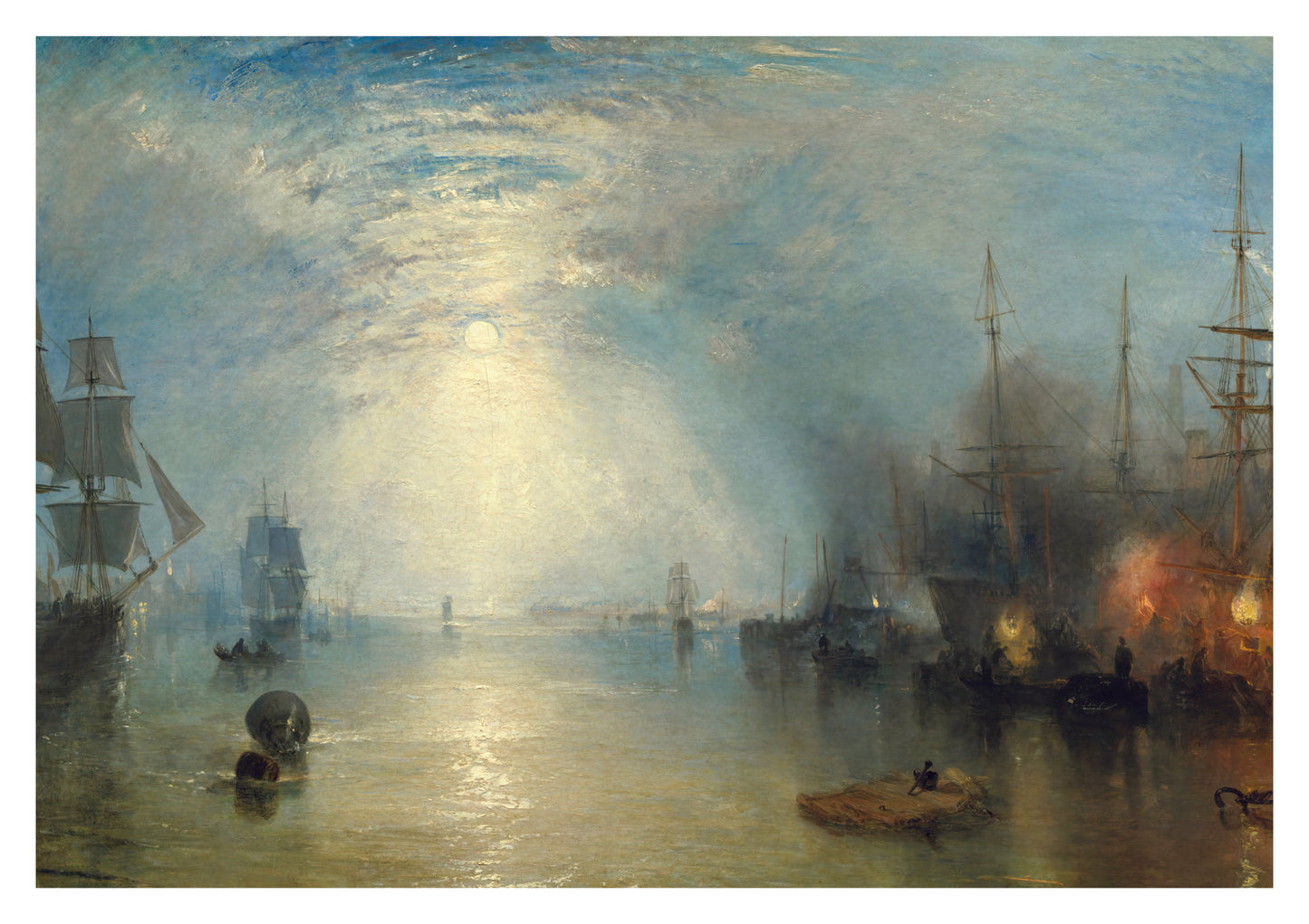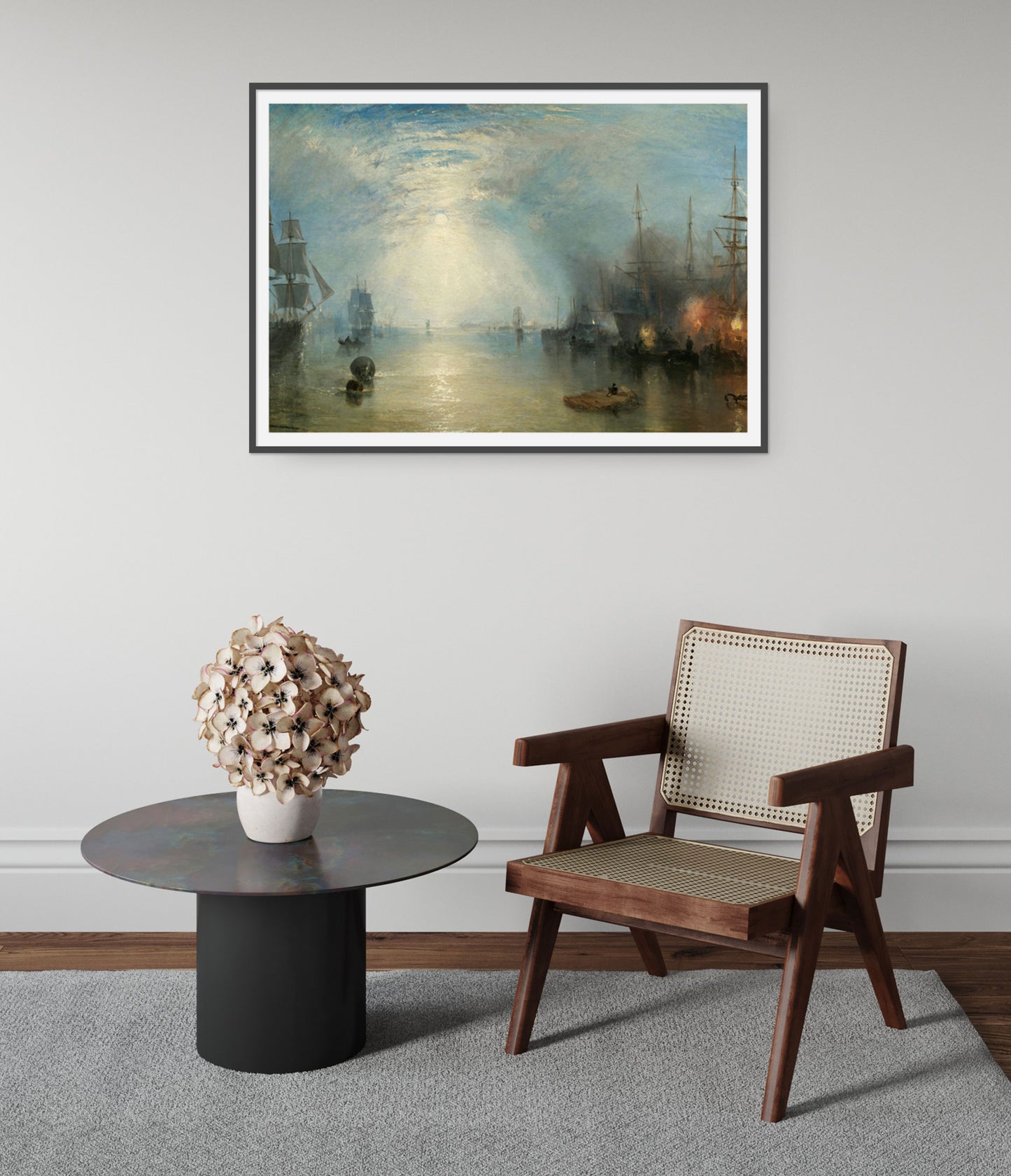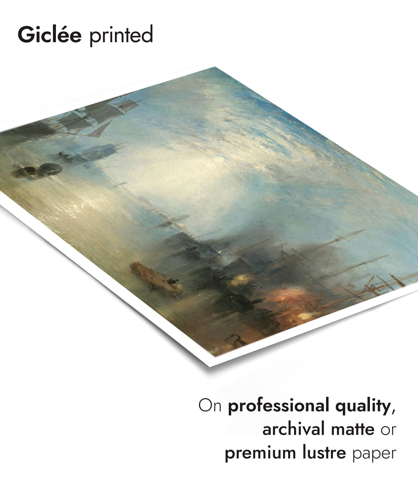 The "Keelmen Heaving in Coals by Moonlight" poster by J. M. W. Turner captures a nocturnal scene of workers loading coal onto ships under a luminous moon. The Romanticism landscape features serene sea waters, hazy clouds, and glowing fires illuminating the boats. Ideal for those who appreciate maritime themes and historical artistry.