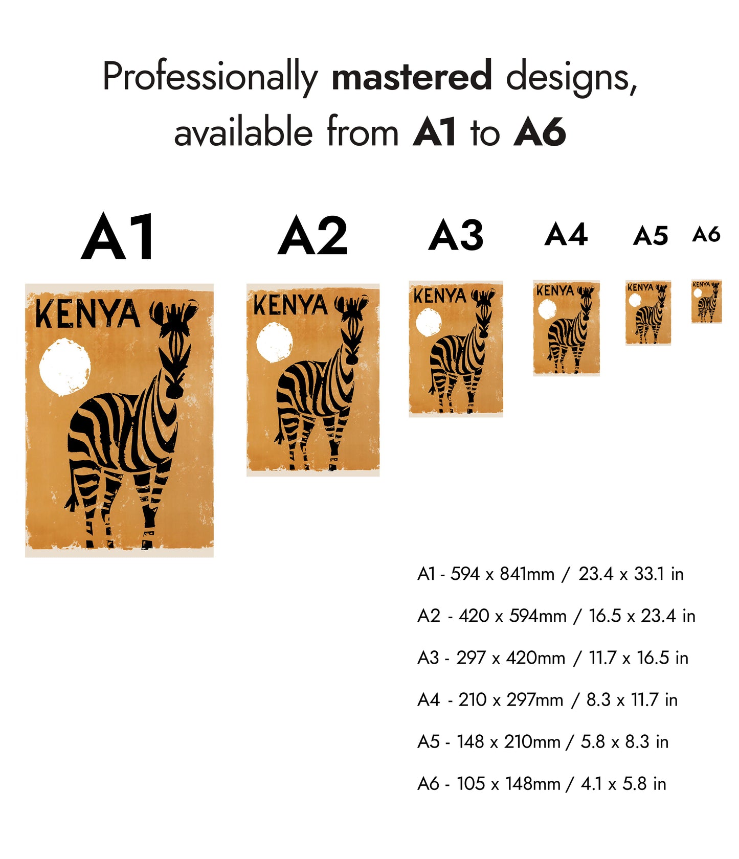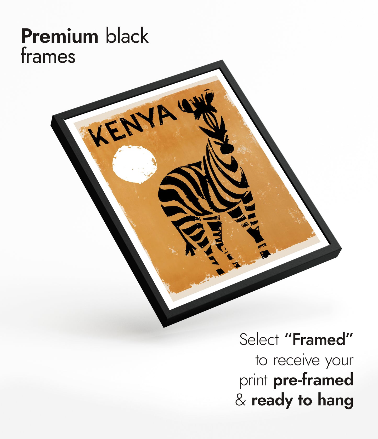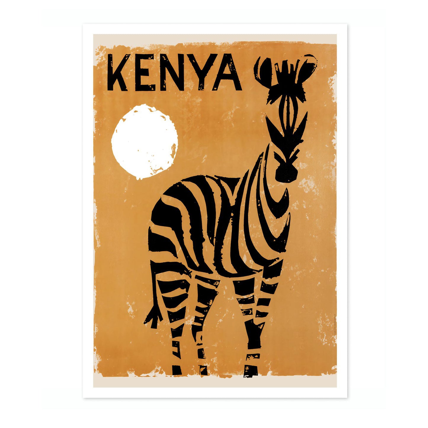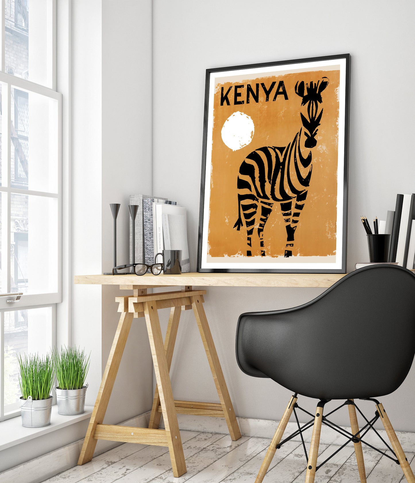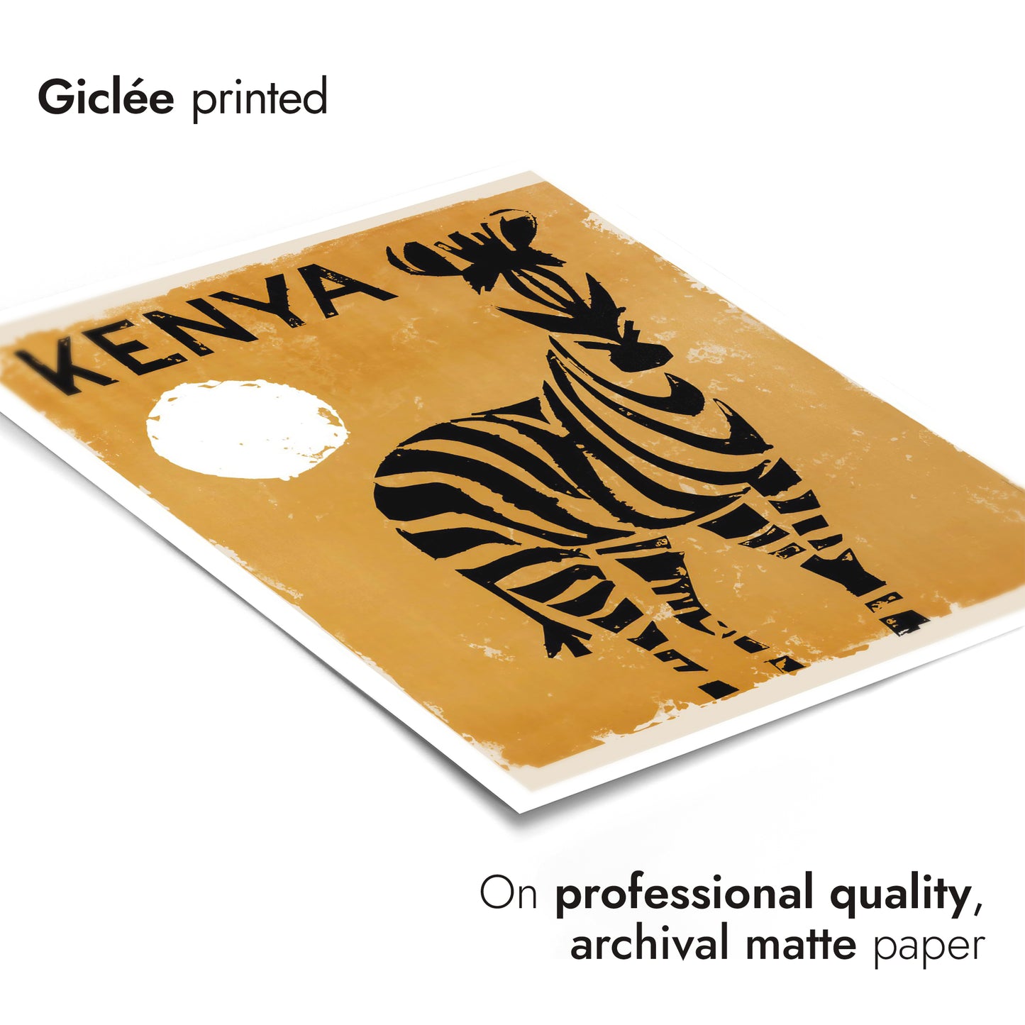 This vintage-style Kenyan travel poster features a stylized black zebra against a warm beige backdrop, encapsulating the vibrant spirit of Africa. The bold, rustic typography and sun motif enhance its nostalgic appeal. Ideal for those seeking unique animal-themed wall art with a travel twist, this poster brings a touch of African adventure to any space.