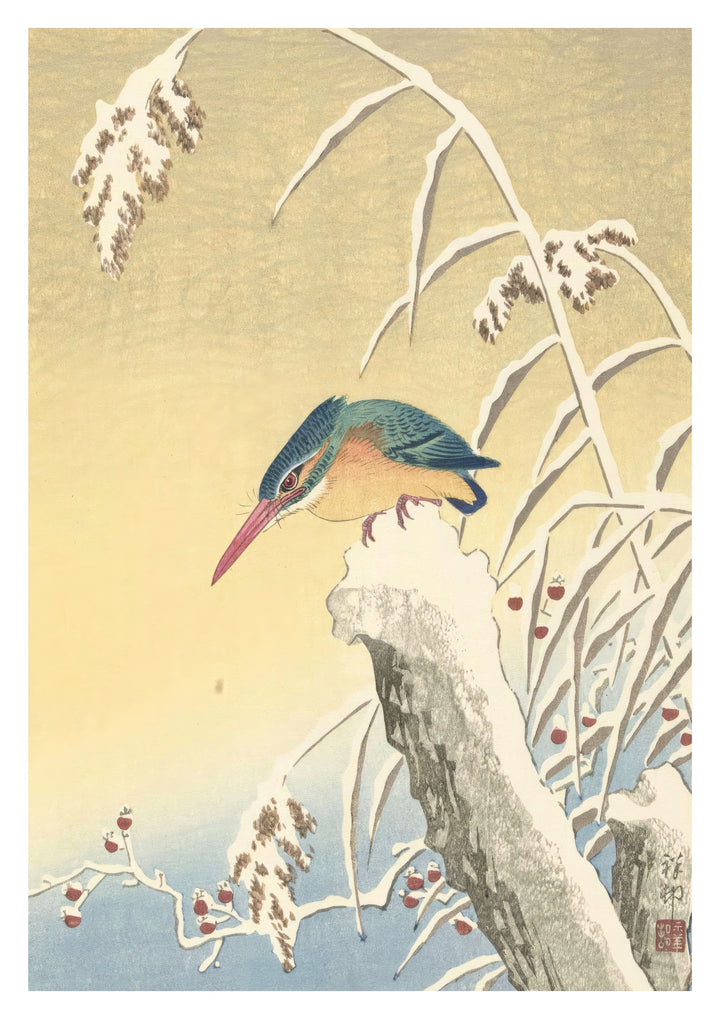This Japanese woodblock poster by Ohara Koson, titled "Kingfisher in the Snow," captures a vibrant kingfisher perched on a snow-covered branch against a serene background. The intricate details of the bird's feathers contrast beautifully with the delicate winter elements, such as frosted grass and berries. Perfect for those who appreciate traditional Ukiyo-e illustrations and nature-themed art.