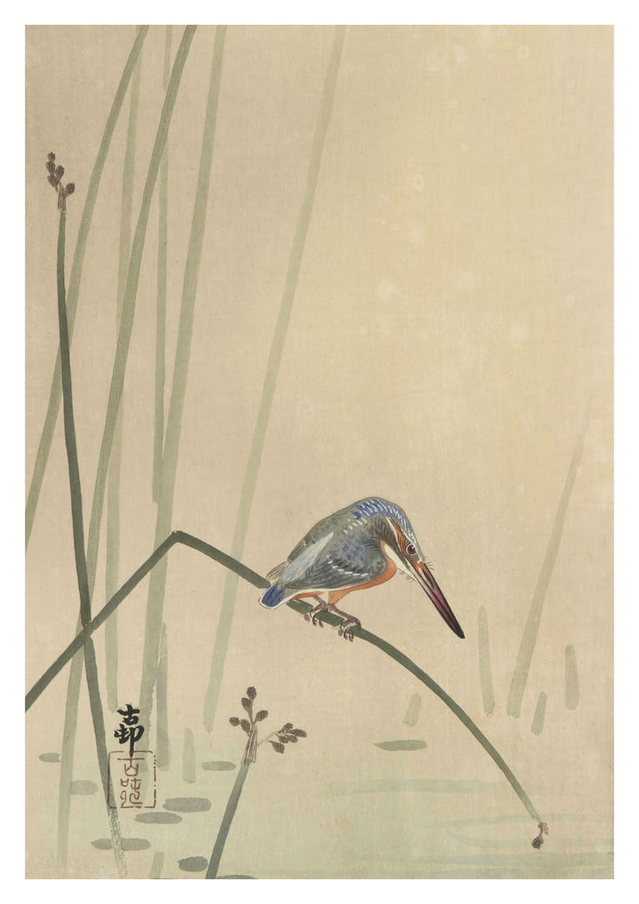 Ohara Koson's "Kingfisher Perched on Water Stem" poster beautifully captures a serene avian moment. This traditional Japanese woodblock illustration features a kingfisher delicately perched on a grass reed over a tranquil pond. The minimalist composition and subtle earth tones highlight the bird's intricate details and the calm ambiance of its natural habitat, making this poster an exquisite addition to any space.