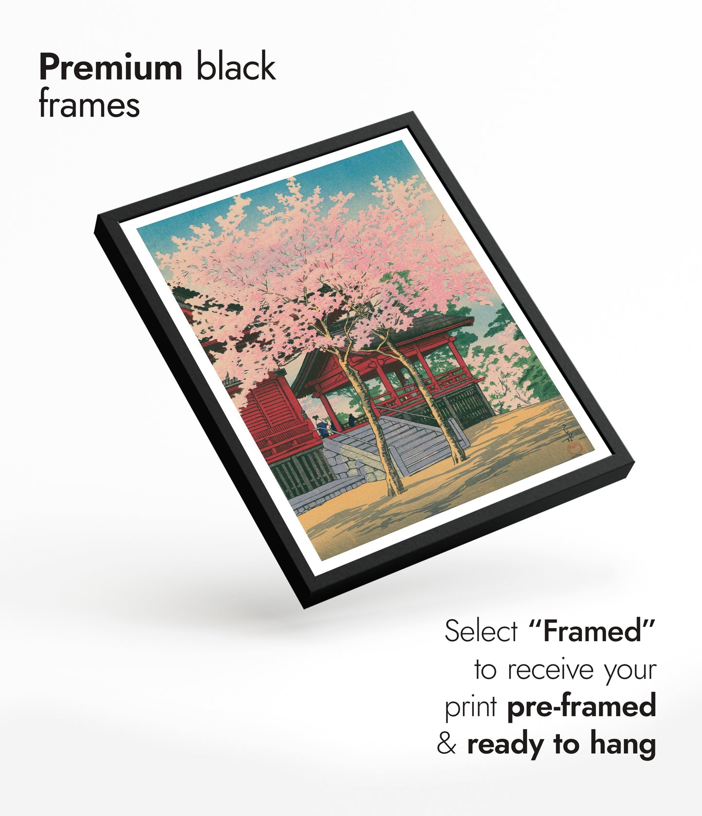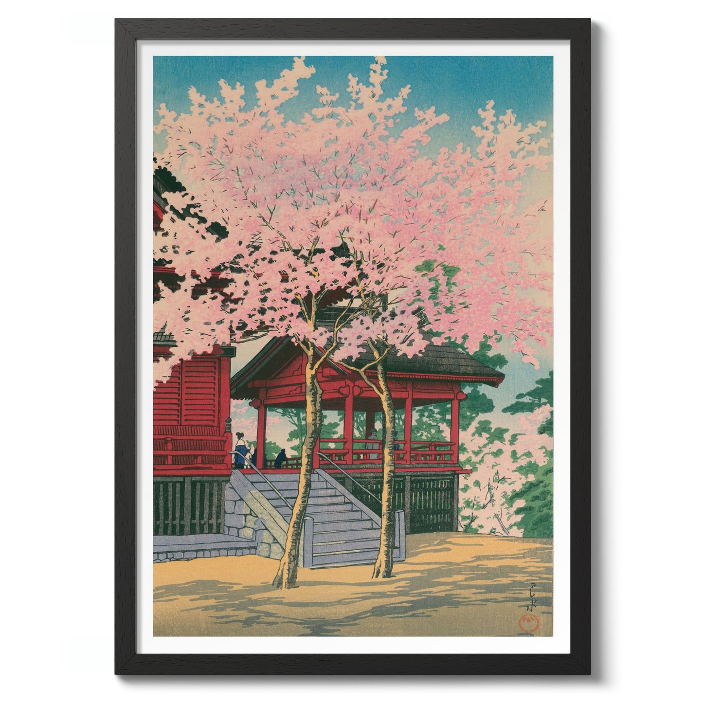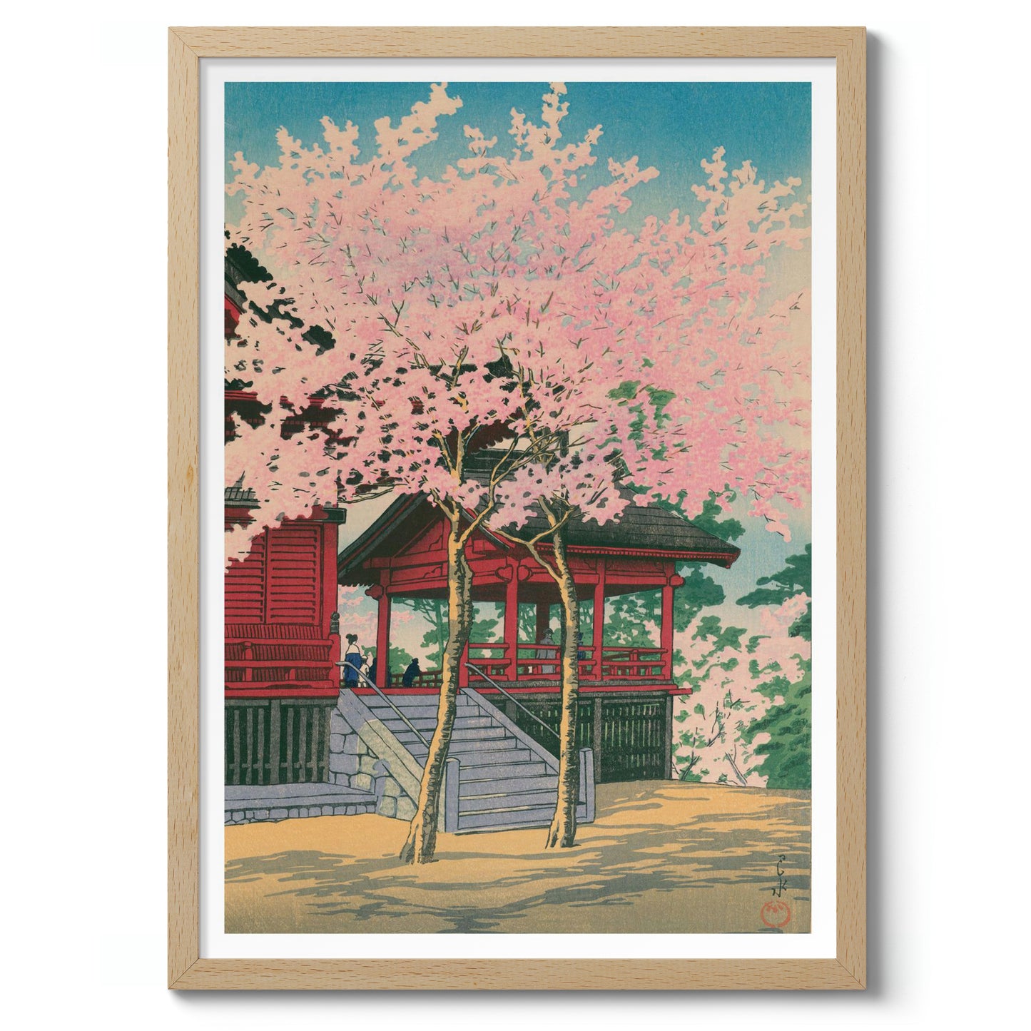 This "Kiyomizu Hall Ueno" poster by Kawase Hasui beautifully captures the essence of traditional Japanese woodblock art. Featuring a serene temple setting adorned with vibrant pink cherry blossoms and set against a clear summer sky, this artwork highlights the tranquil charm of Japan. The intricate details of the temple and stairs add depth, embodying timeless Japanese aesthetics.