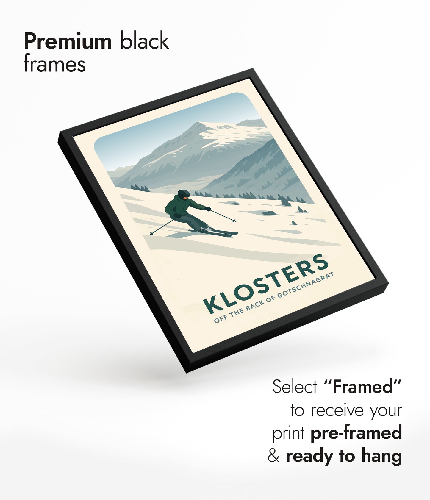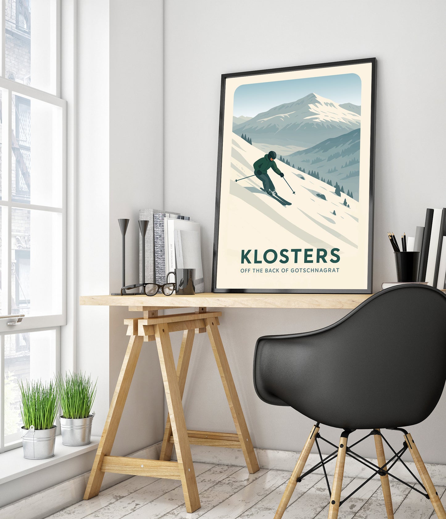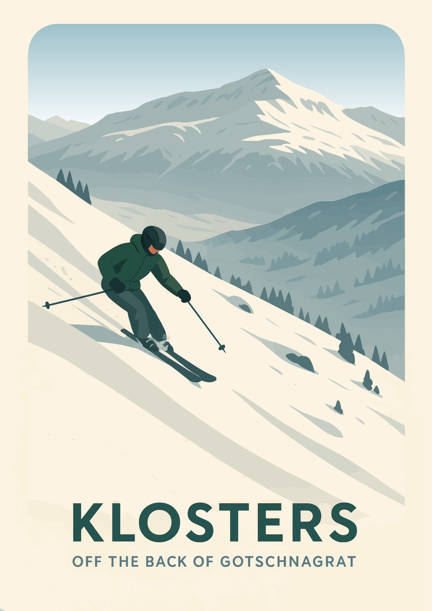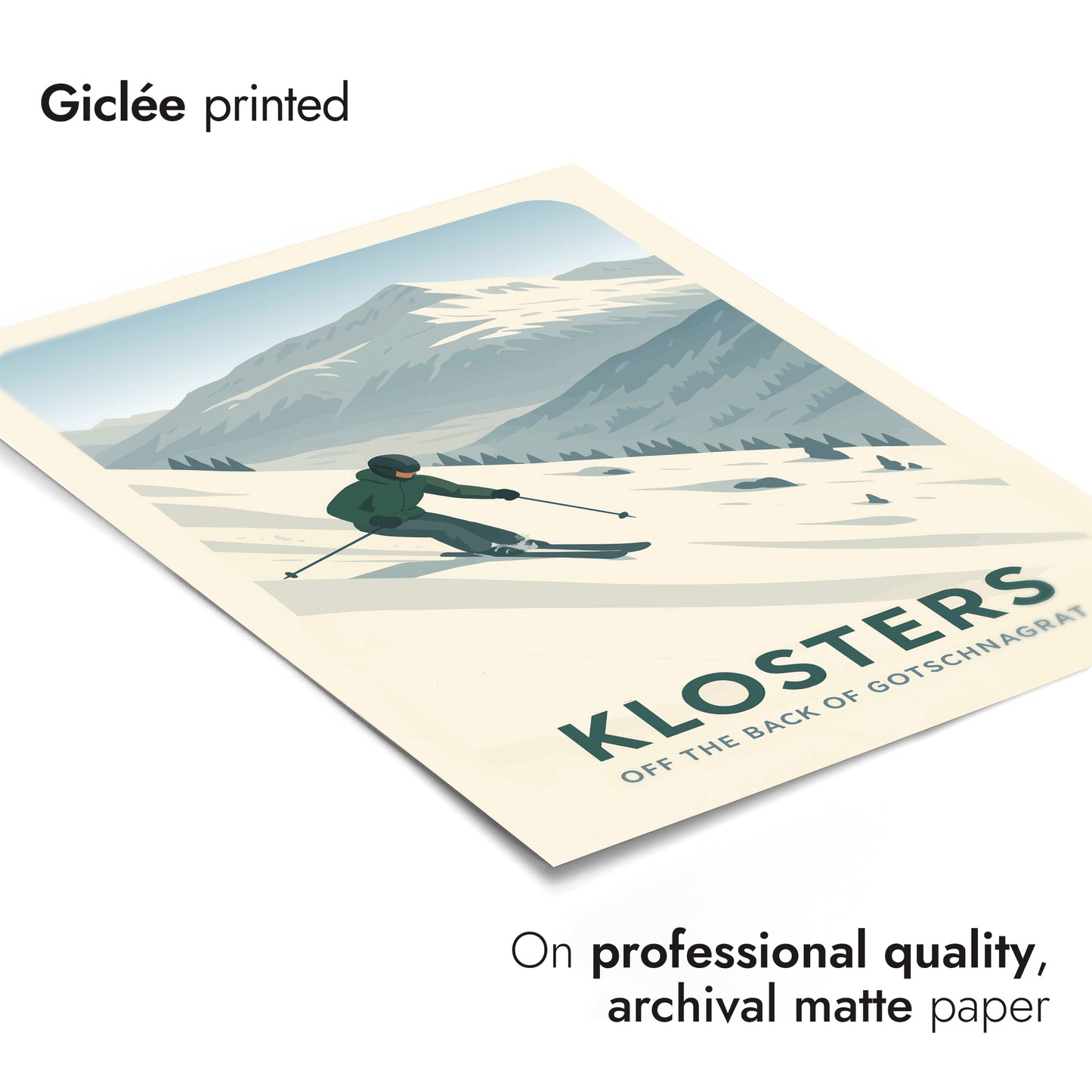 This striking Klosters ski poster presents an adventurous skier descending the snowy slopes of Gotschnagrat, framed by the alpine grandeur of the Swiss mountains. The graphic-style art emphasizes crisp, clean lines and muted colors, capturing the thrill of winter sports against an inspiring mountainous backdrop. Perfect for ski enthusiasts and mountain lovers seeking a touch of Swiss alpine charm.