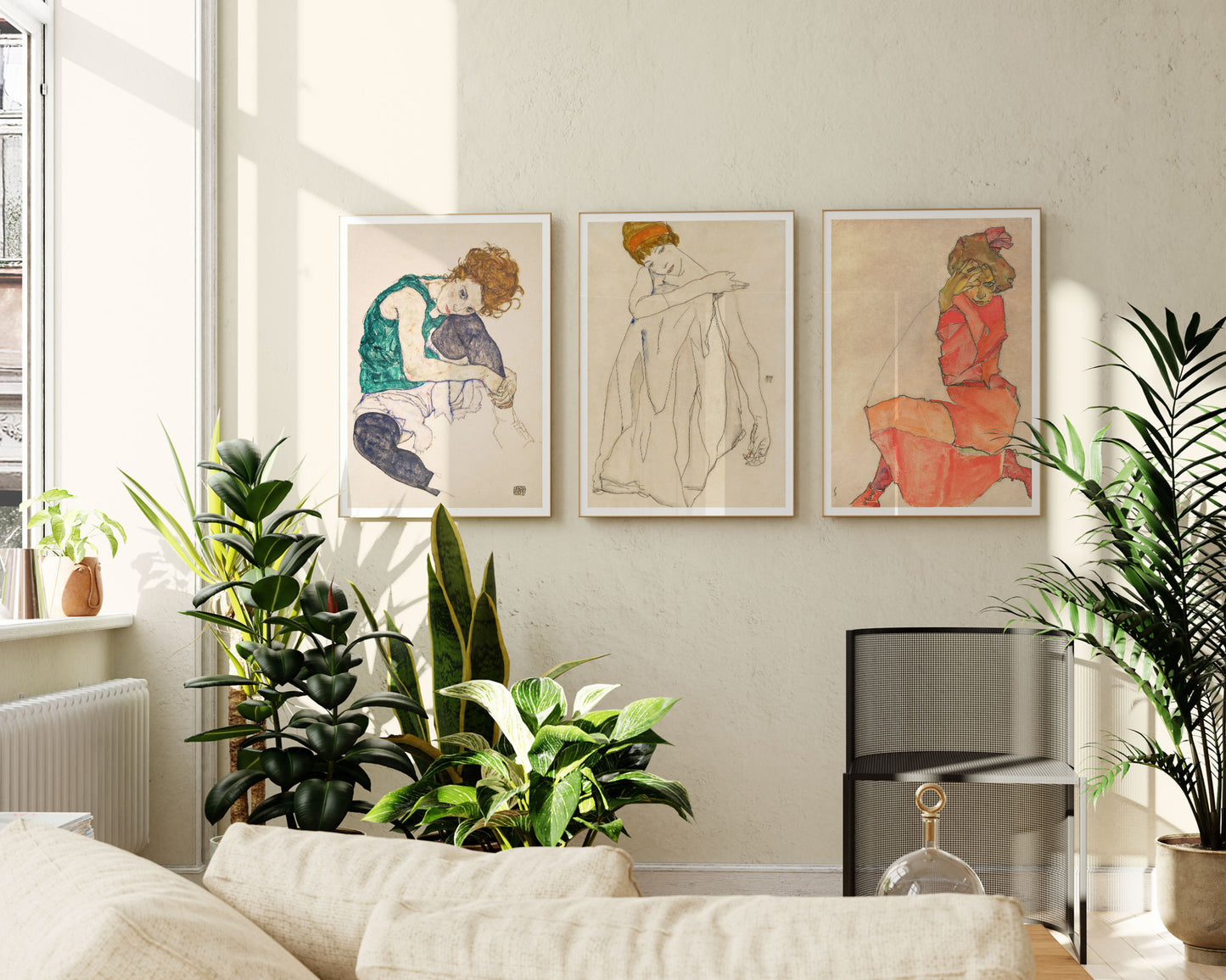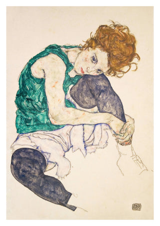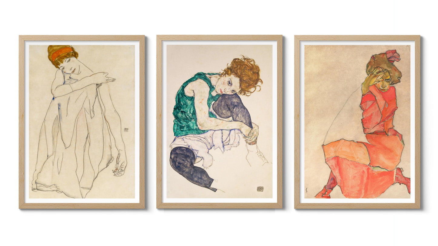 This set of three "Kneeling Women" posters by Egon Schiele showcases the artist's distinctive Expressionist style. Each piece vividly captures the intricate poses and raw emotion of his subjects. The use of delicate lines and rich colours brings a sense of intimacy and depth to these portraits, making them striking additions to any art lover's collection.