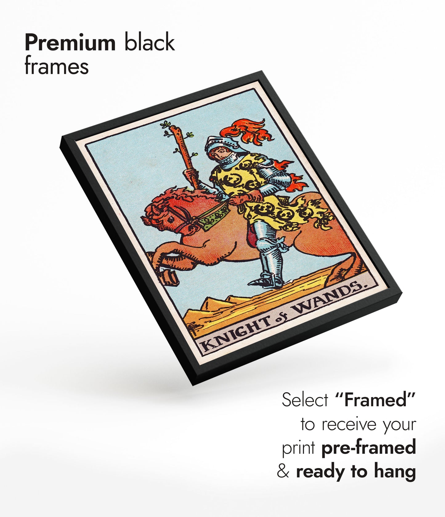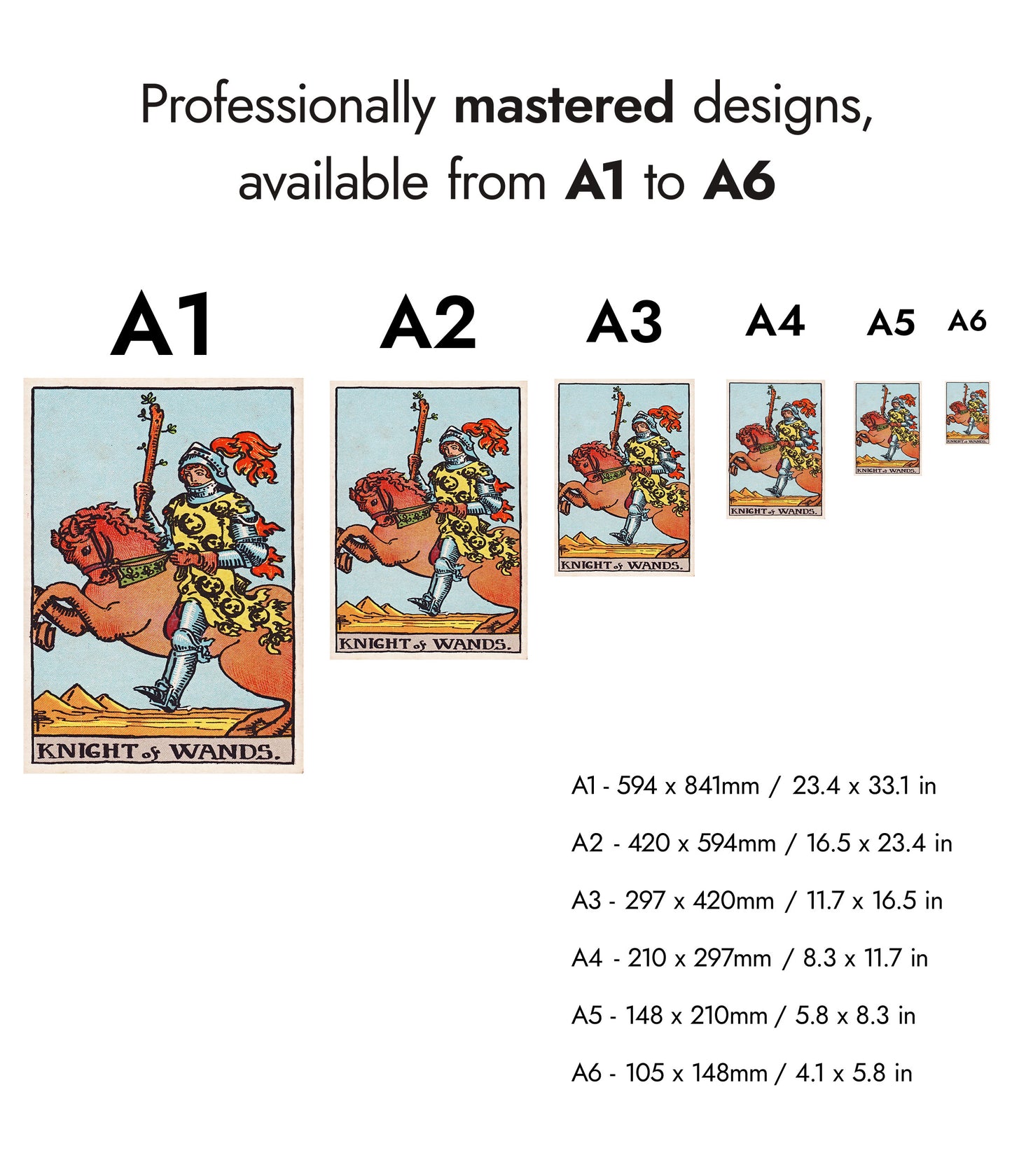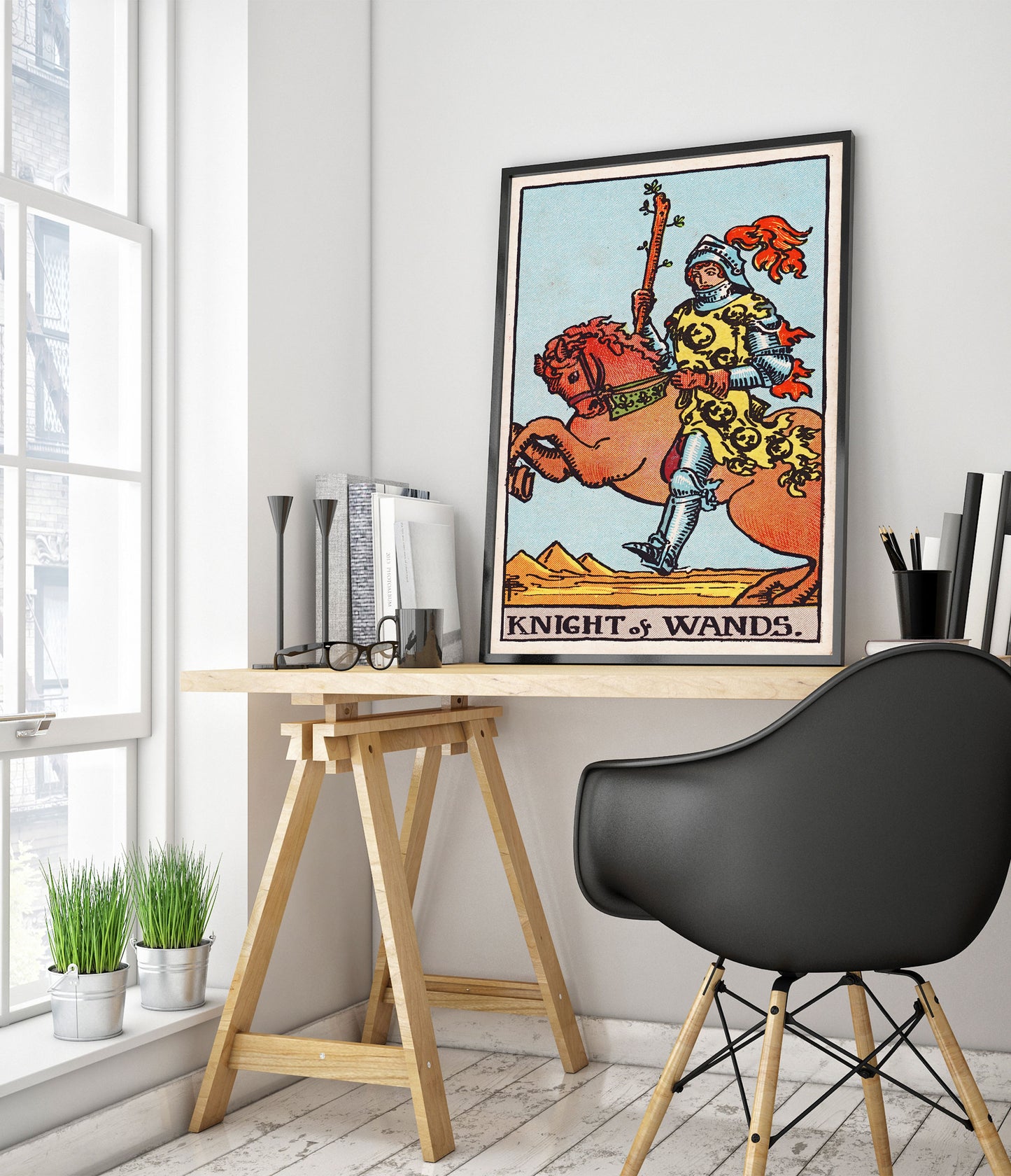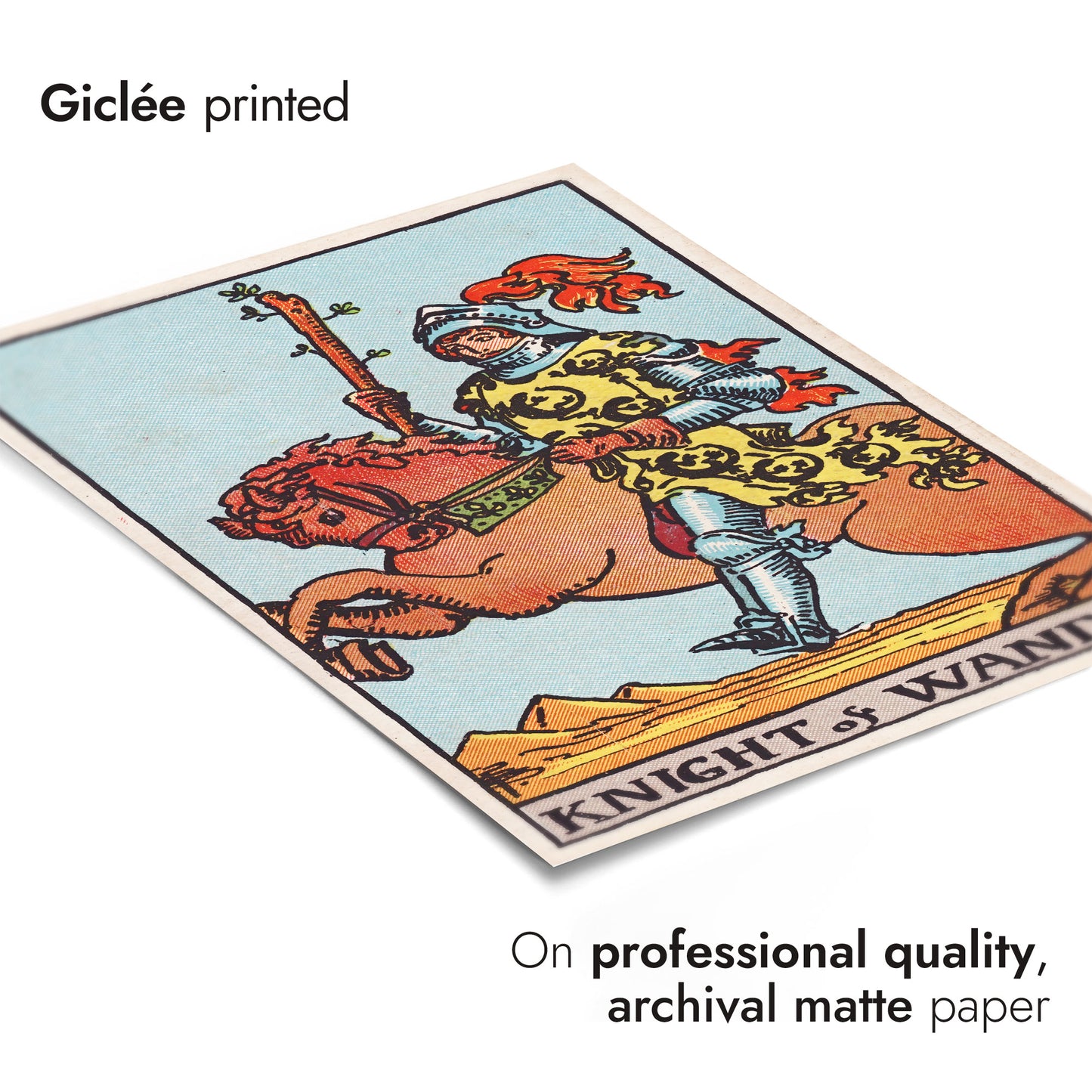This Knight of Wands art print captures the dynamic energy of the Tarot card. Featuring a gallant knight in intricate armor riding a spirited horse, this vintage illustration exudes a mystical and adventurous aura. The backdrop of pale blue sky and golden sands adds to its timeless appeal. Ideal for those intrigued by fantasy and mystical themes. Perfect as a tarot-themed poster.
