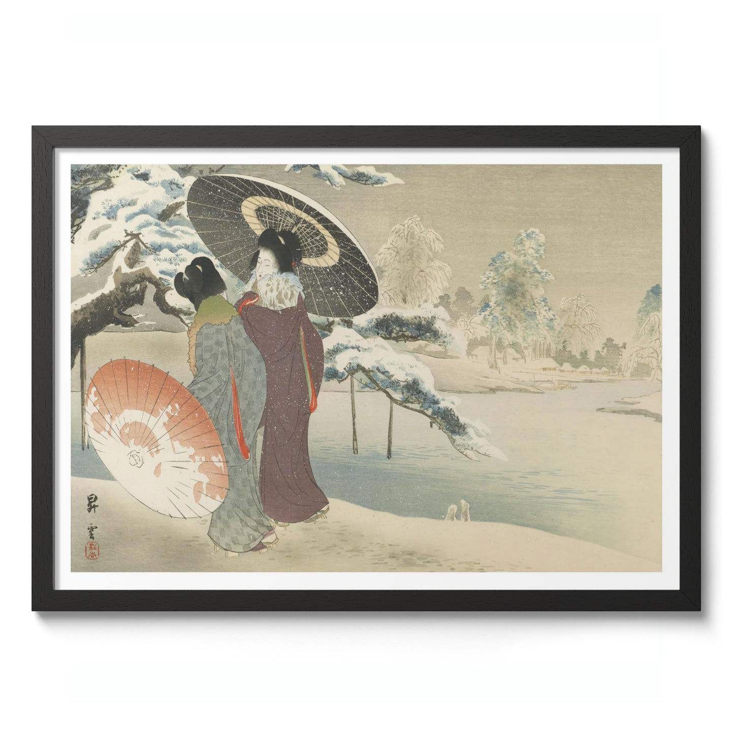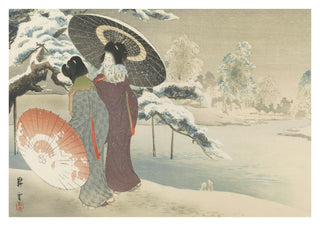 This "Ko'ume No Sato" poster by Yamamoto Shoun, created in 1906, captures an idyllic winter scene with two women in traditional kimonos strolling by a snow-covered lake. The artwork, in a traditional Japanese woodblock style, features parasols and muted beige and orange tones, infusing a serene balance between nature and cultural elegance, reflective of Shin-Hanga and Ukiyo-e influences.
