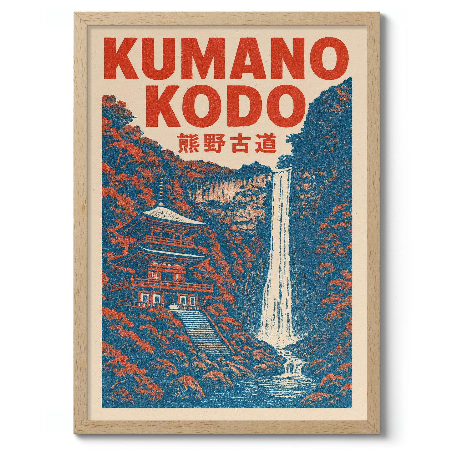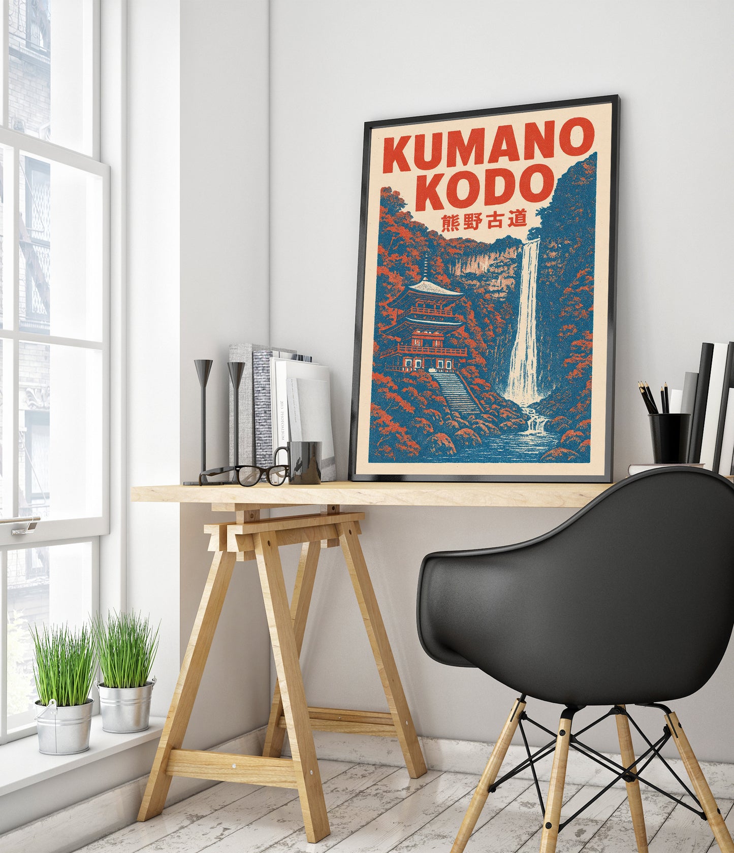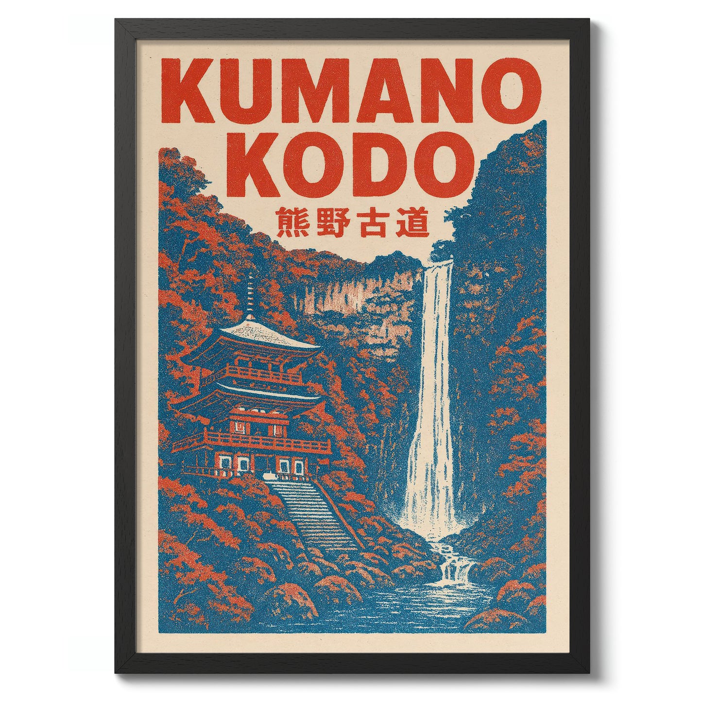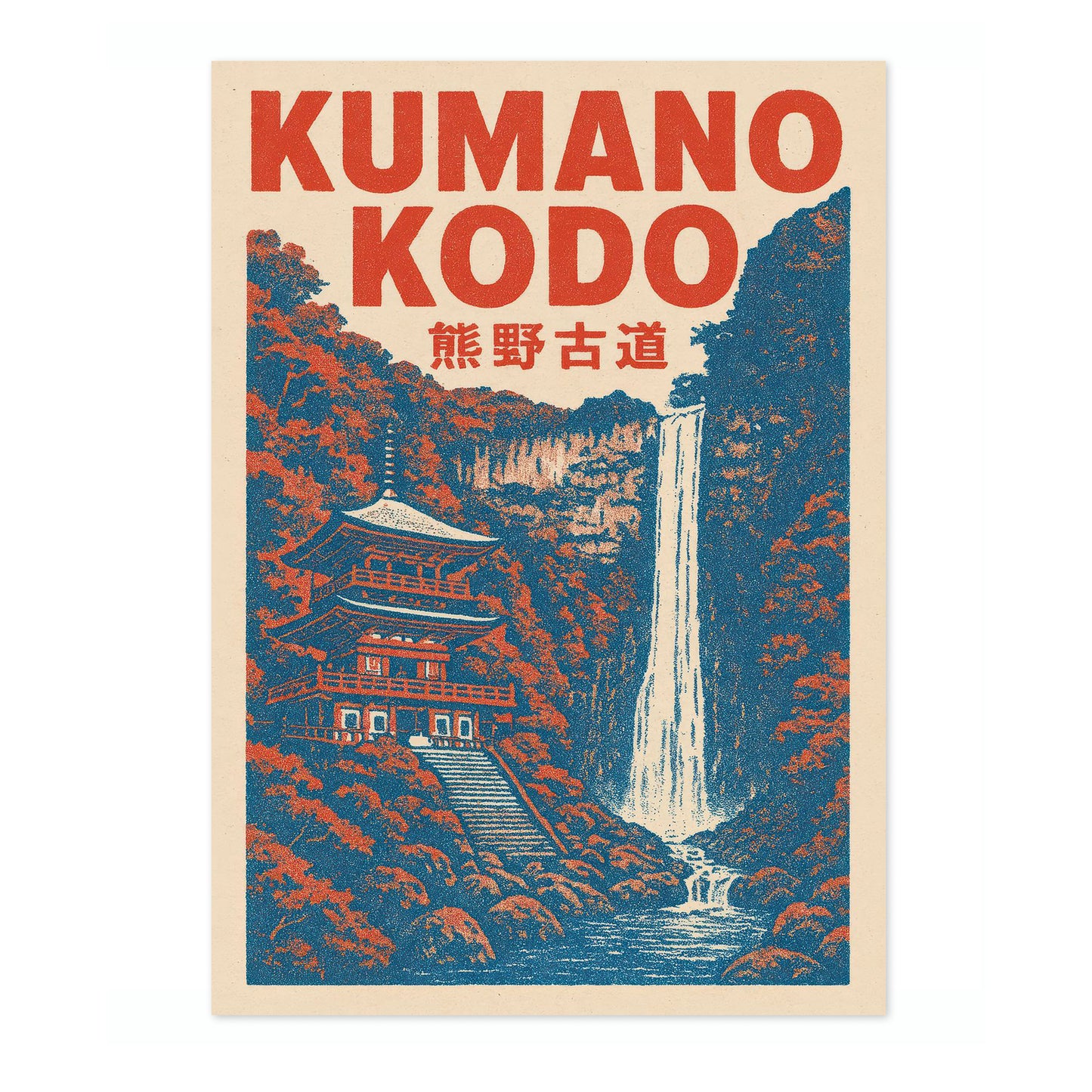 This vintage-style poster features the serene beauty of Kumano Kodo, showcasing a stunning Japanese temple amidst lush greenery and a cascading waterfall. Rendered in rich blue and red tones, this graphic artwork captures the essence of the ancient pilgrimage path. Perfect for those who appreciate cultural heritage and travel-inspired art. Ideal as a poster for home or office décor.