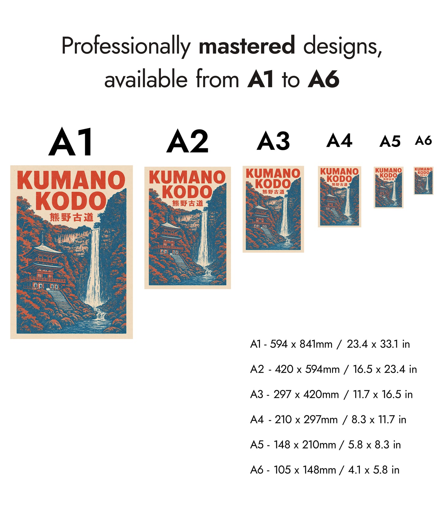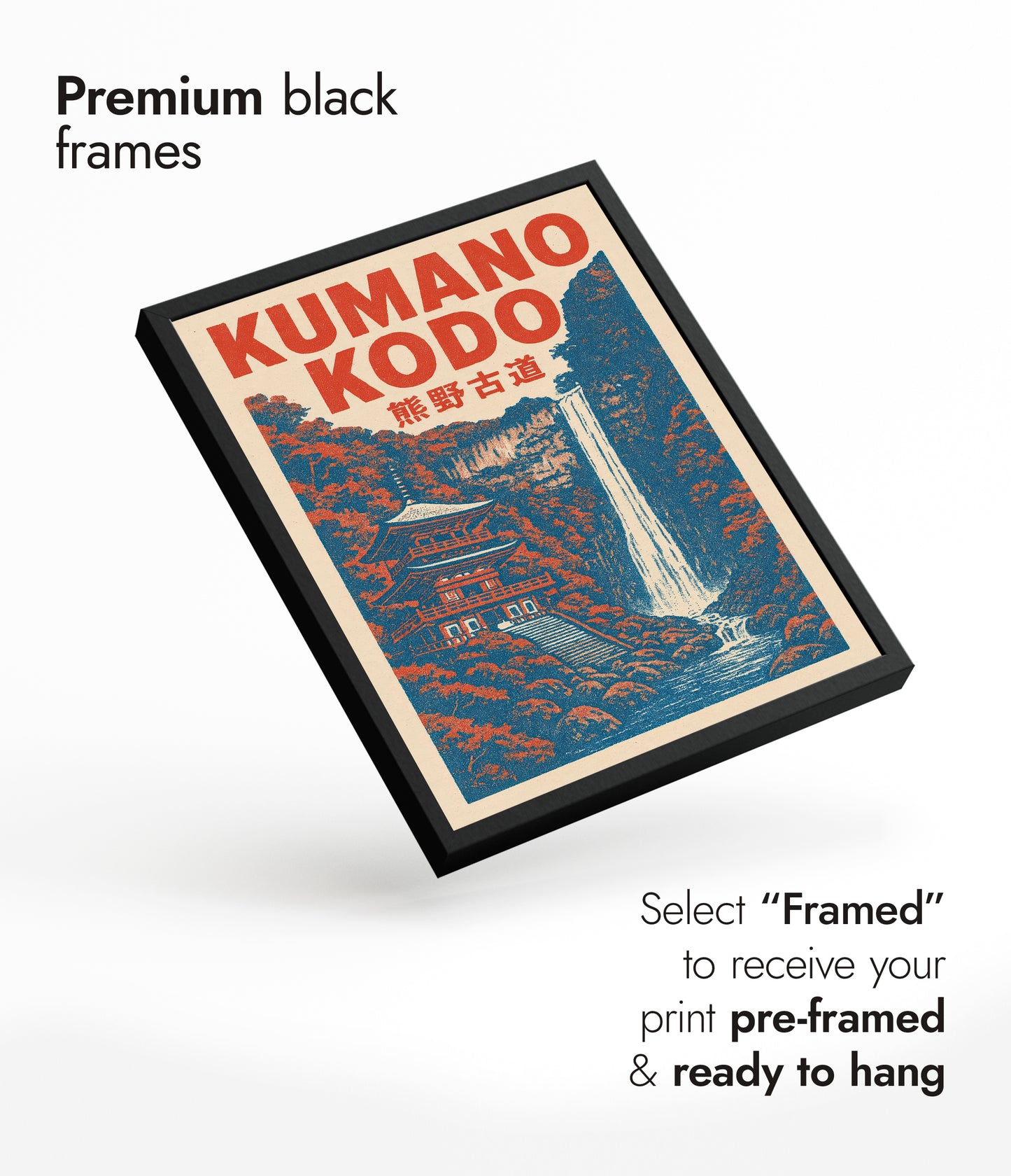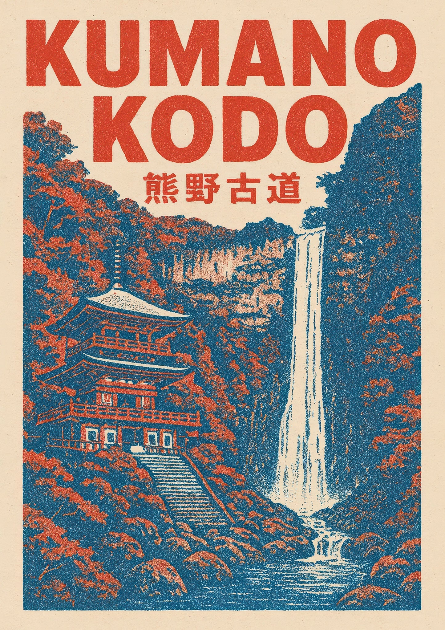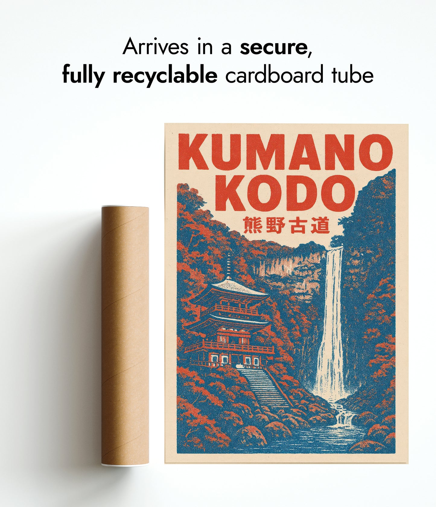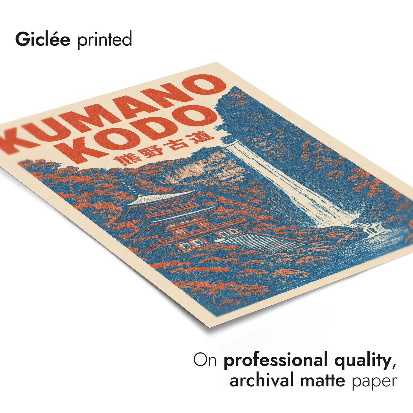 This vintage-style poster features the serene beauty of Kumano Kodo, showcasing a stunning Japanese temple amidst lush greenery and a cascading waterfall. Rendered in rich blue and red tones, this graphic artwork captures the essence of the ancient pilgrimage path. Perfect for those who appreciate cultural heritage and travel-inspired art. Ideal as a poster for home or office décor.