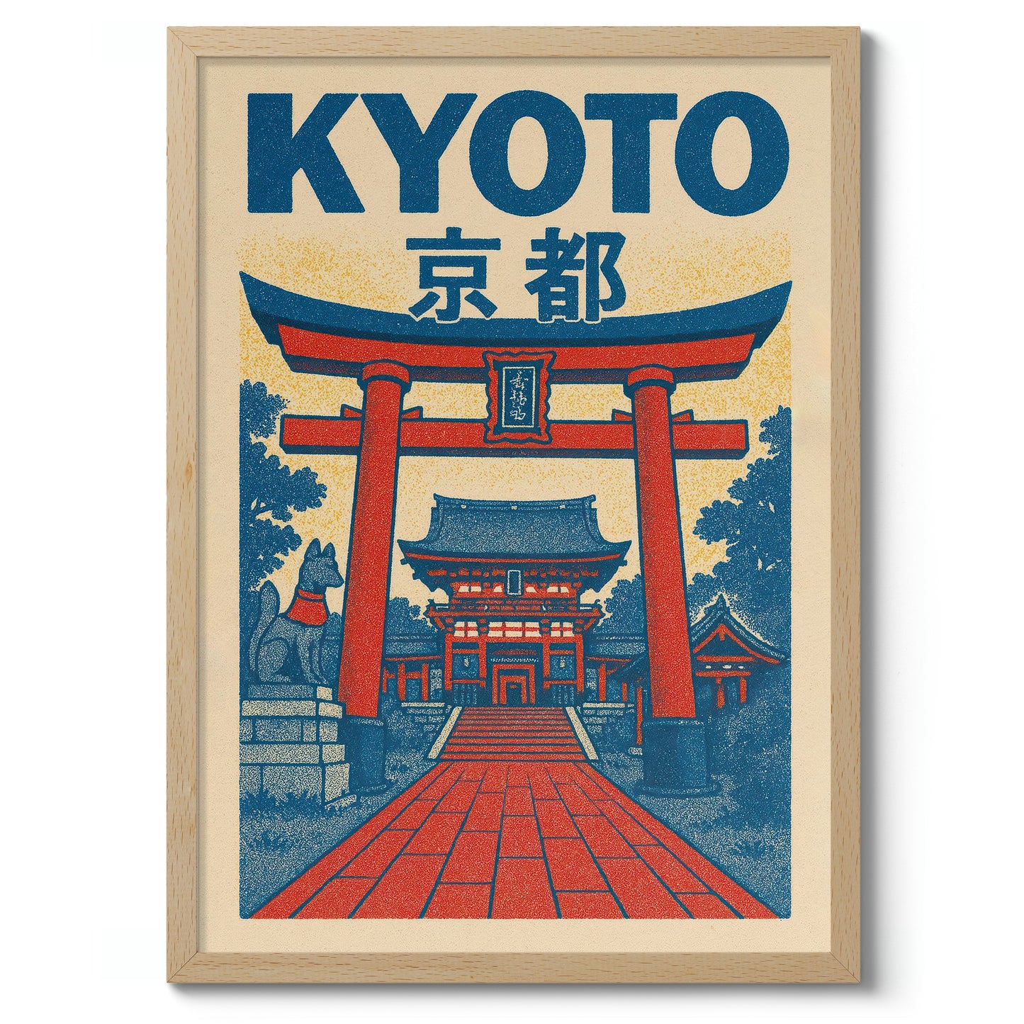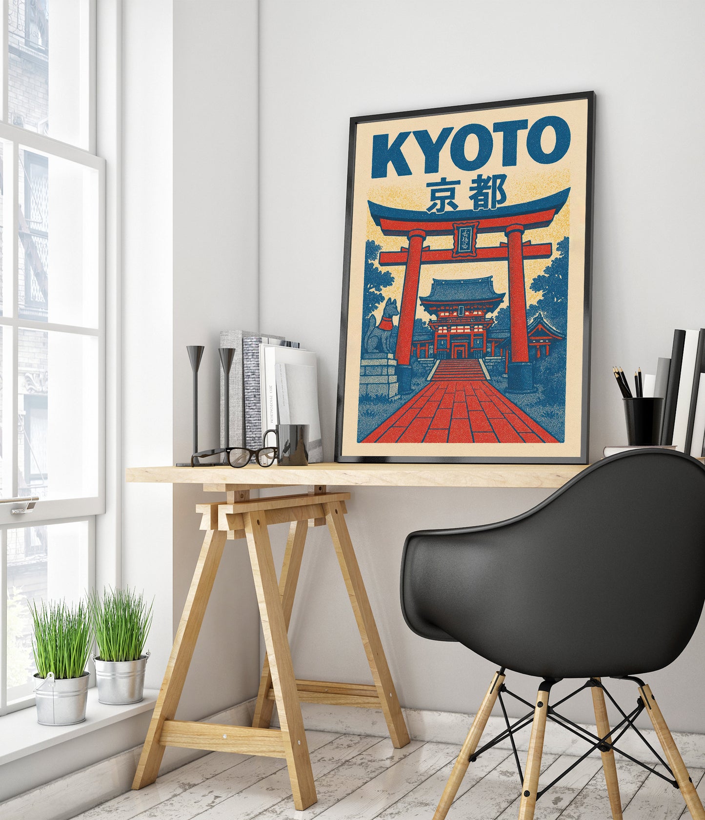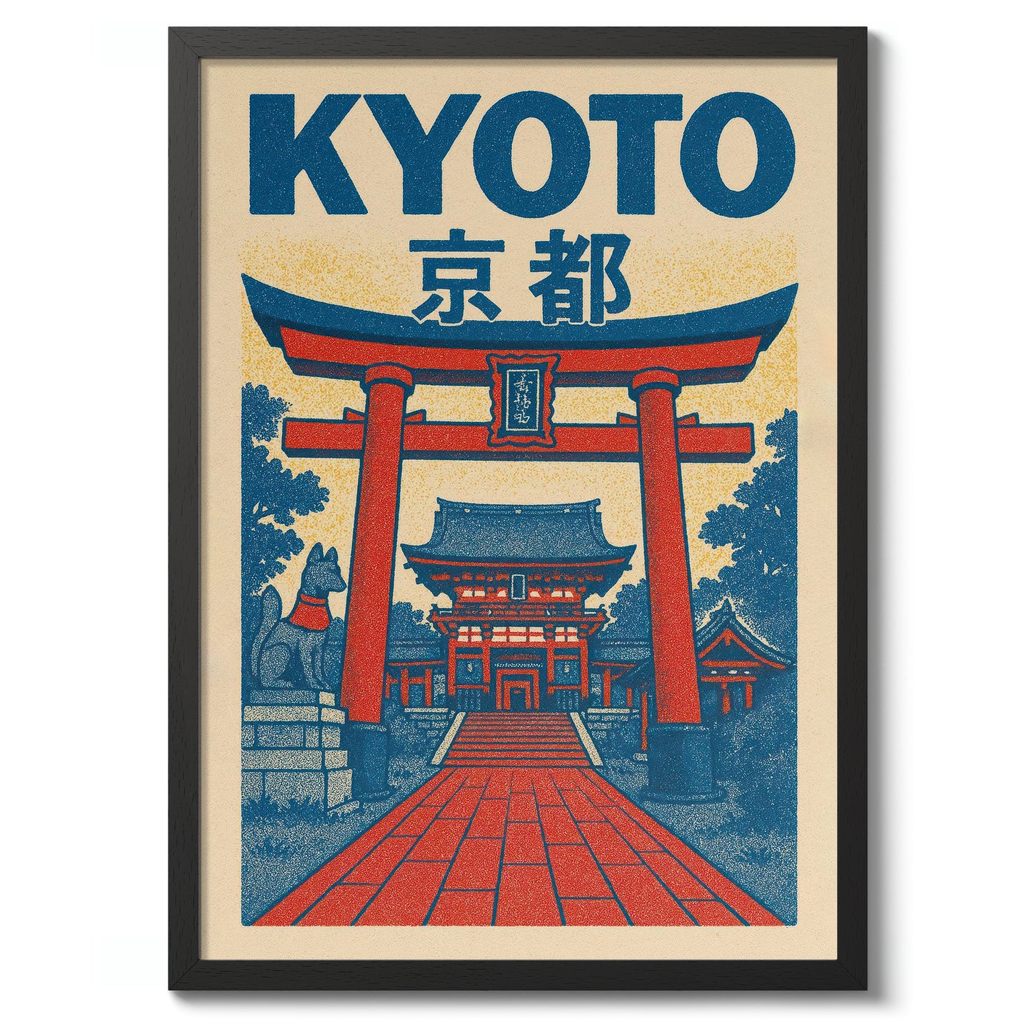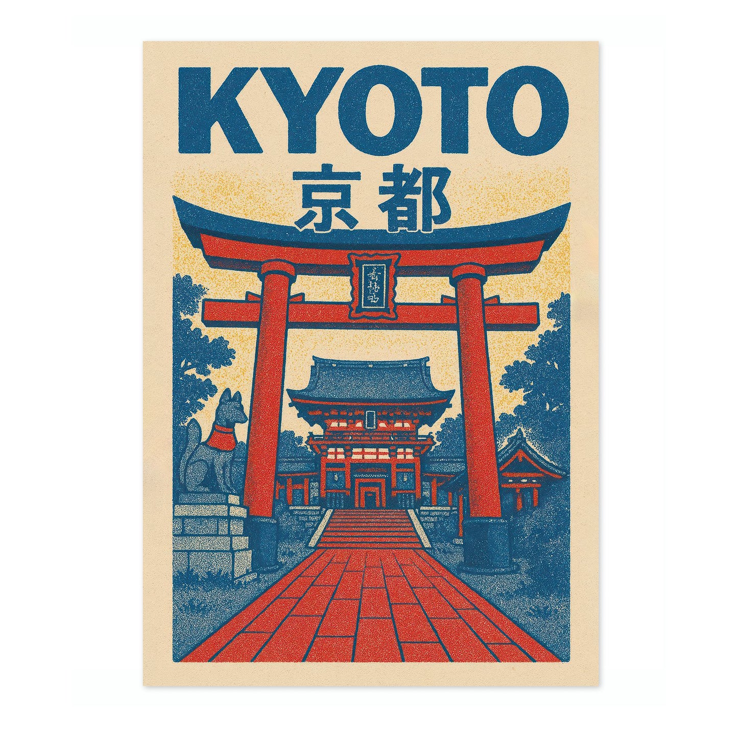 This vintage-style poster captures the essence of Kyoto with its iconic red Torii gate and traditional Japanese temple. The artwork features bold blue and red hues, emphasizing the architectural elegance and cultural heritage of Japan's historic city. A serene forest backdrop complements the scene, enhancing its travel-inspired allure. Ideal for lovers of Asian culture and graphic design.