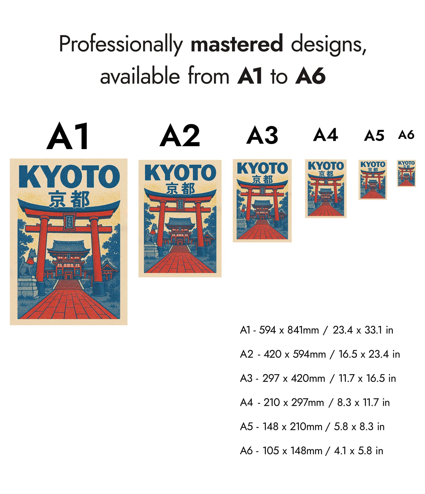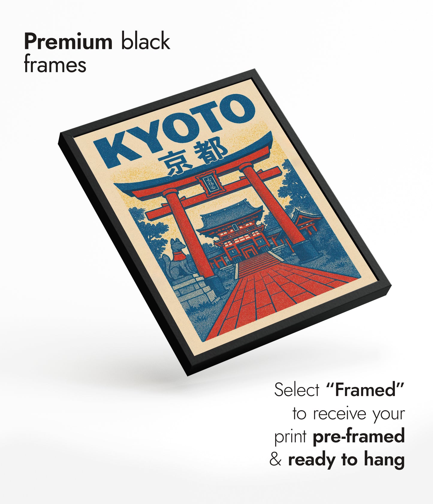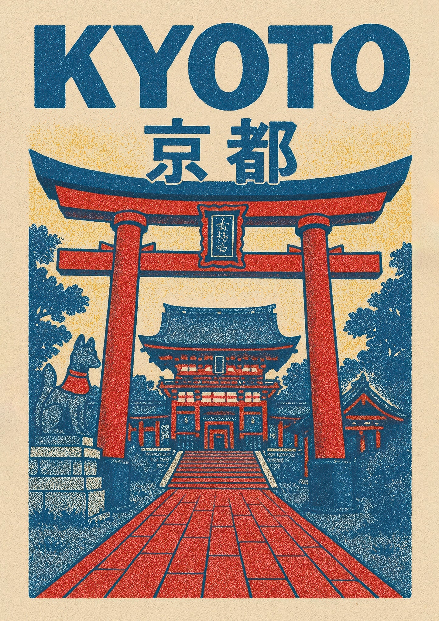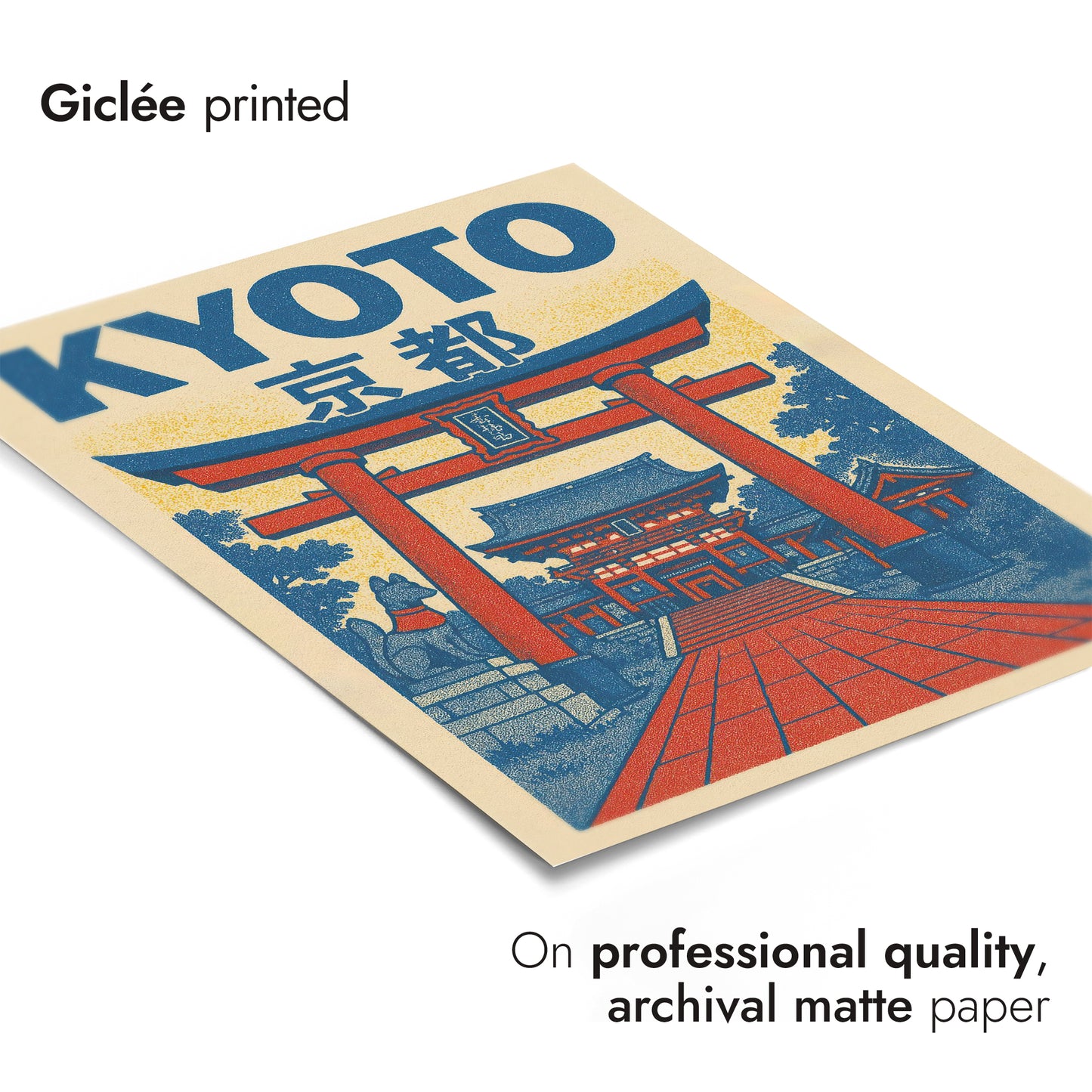 This vintage-style poster captures the essence of Kyoto with its iconic red Torii gate and traditional Japanese temple. The artwork features bold blue and red hues, emphasizing the architectural elegance and cultural heritage of Japan's historic city. A serene forest backdrop complements the scene, enhancing its travel-inspired allure. Ideal for lovers of Asian culture and graphic design.