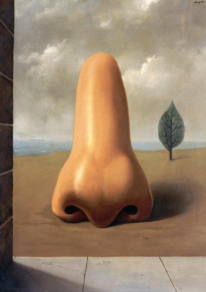René Magritte's poster "La Bonne Aventure" features a surrealist depiction of a giant nose set against a desolate landscape with a solitary tree and cloud-filled sky. The juxtaposition of the nose and natural elements creates a dreamlike scene characteristic of Magritte's style. This intriguing still life piece captures the essence of surrealism, blending ordinary objects in unexpected ways.