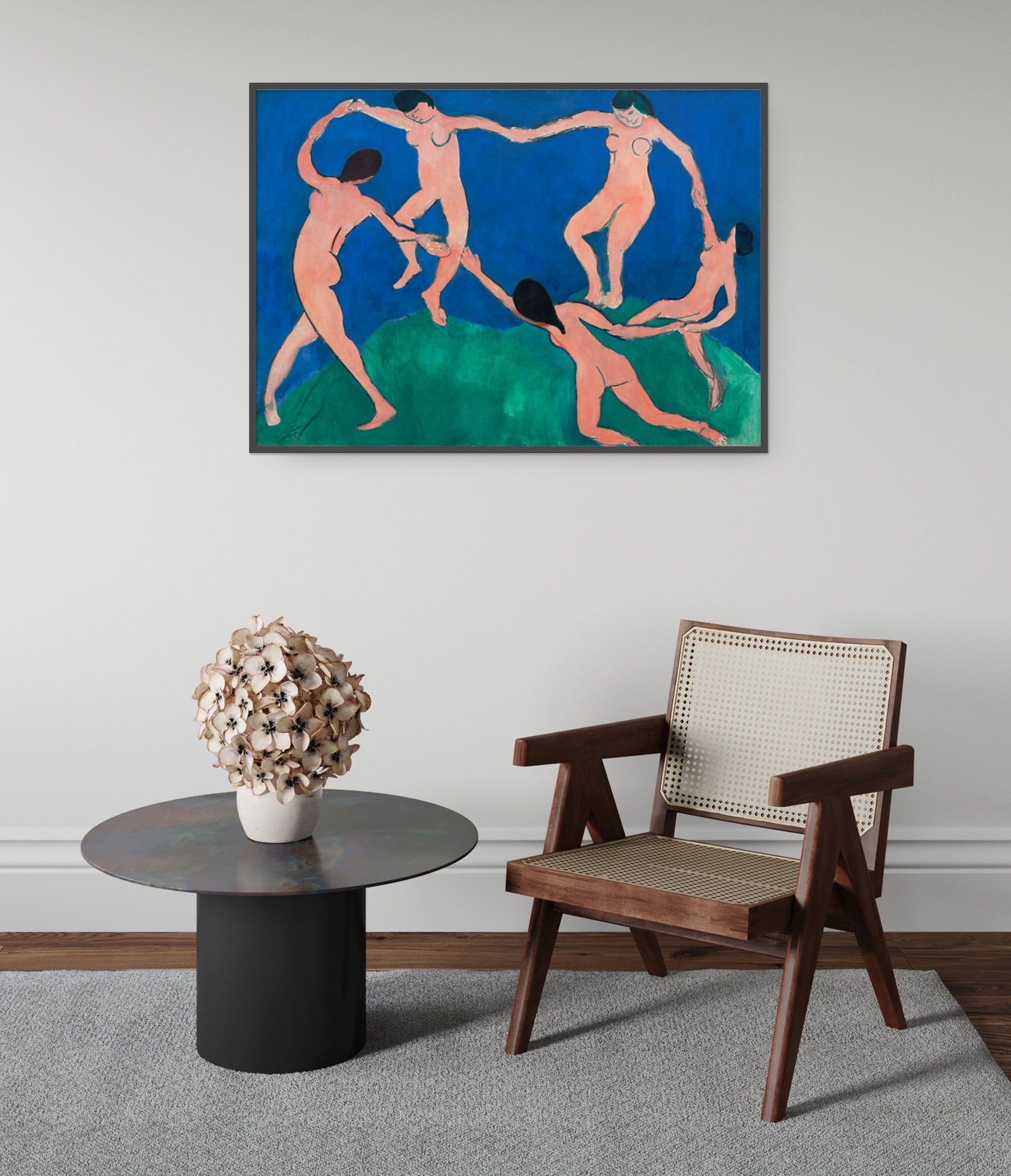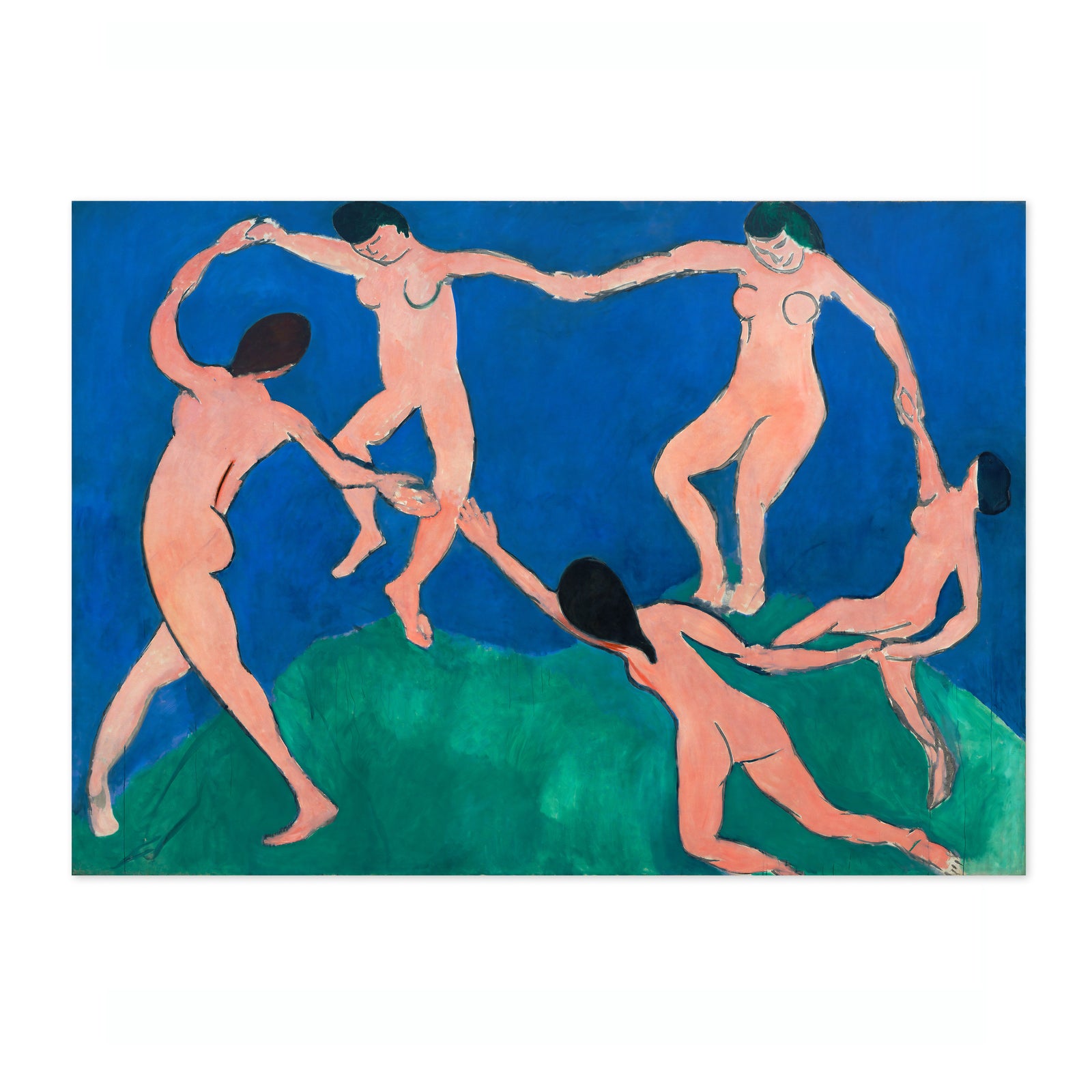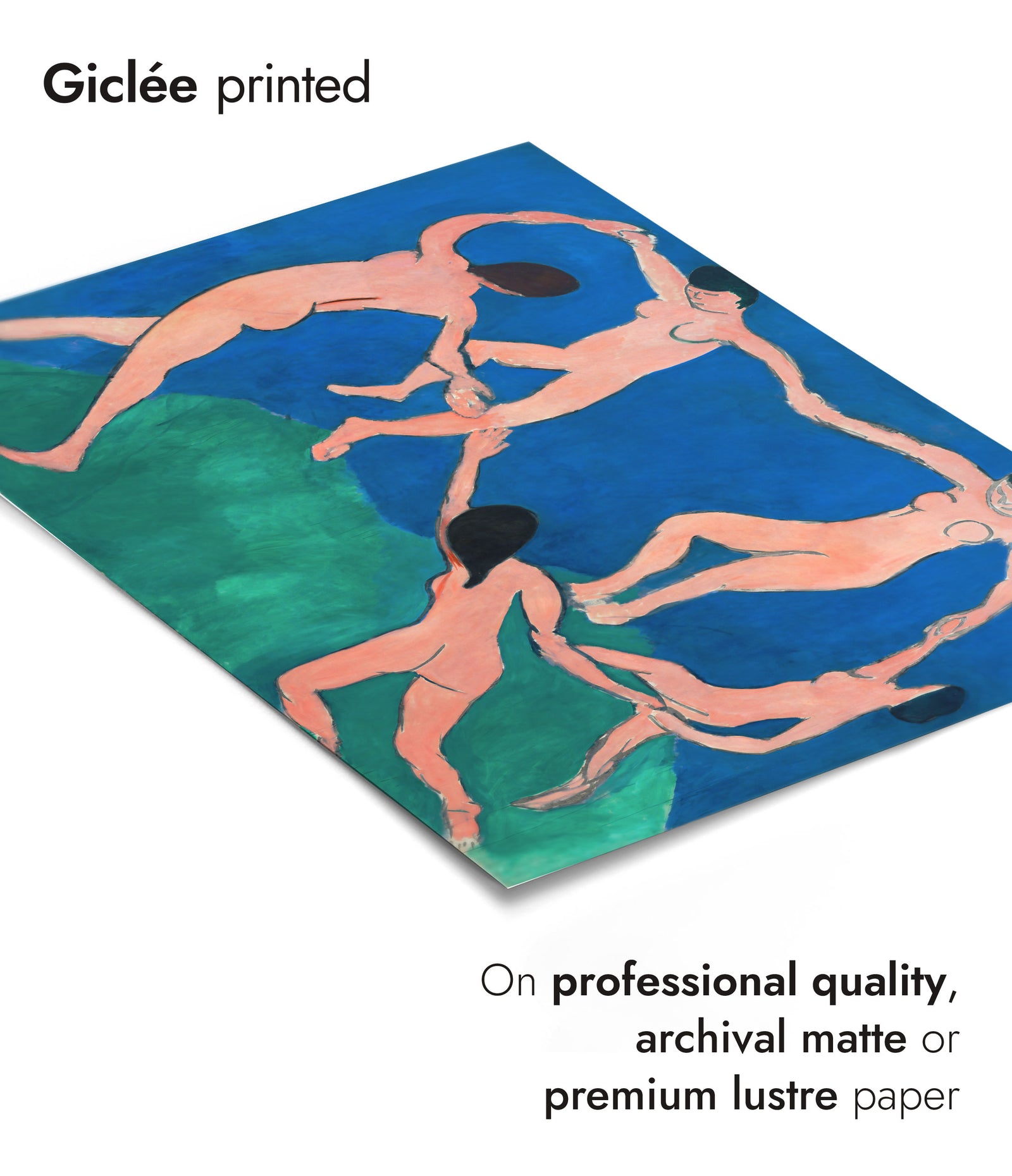 This "La Danse" poster by Henri Matisse captures the vibrant essence of Fauvism. Featuring five nude figures dancing in a circle against a deep blue and green backdrop, this artwork embodies movement and energy. The bold, expressive use of colour highlights Matisse's signature style, making it a striking addition to any space.