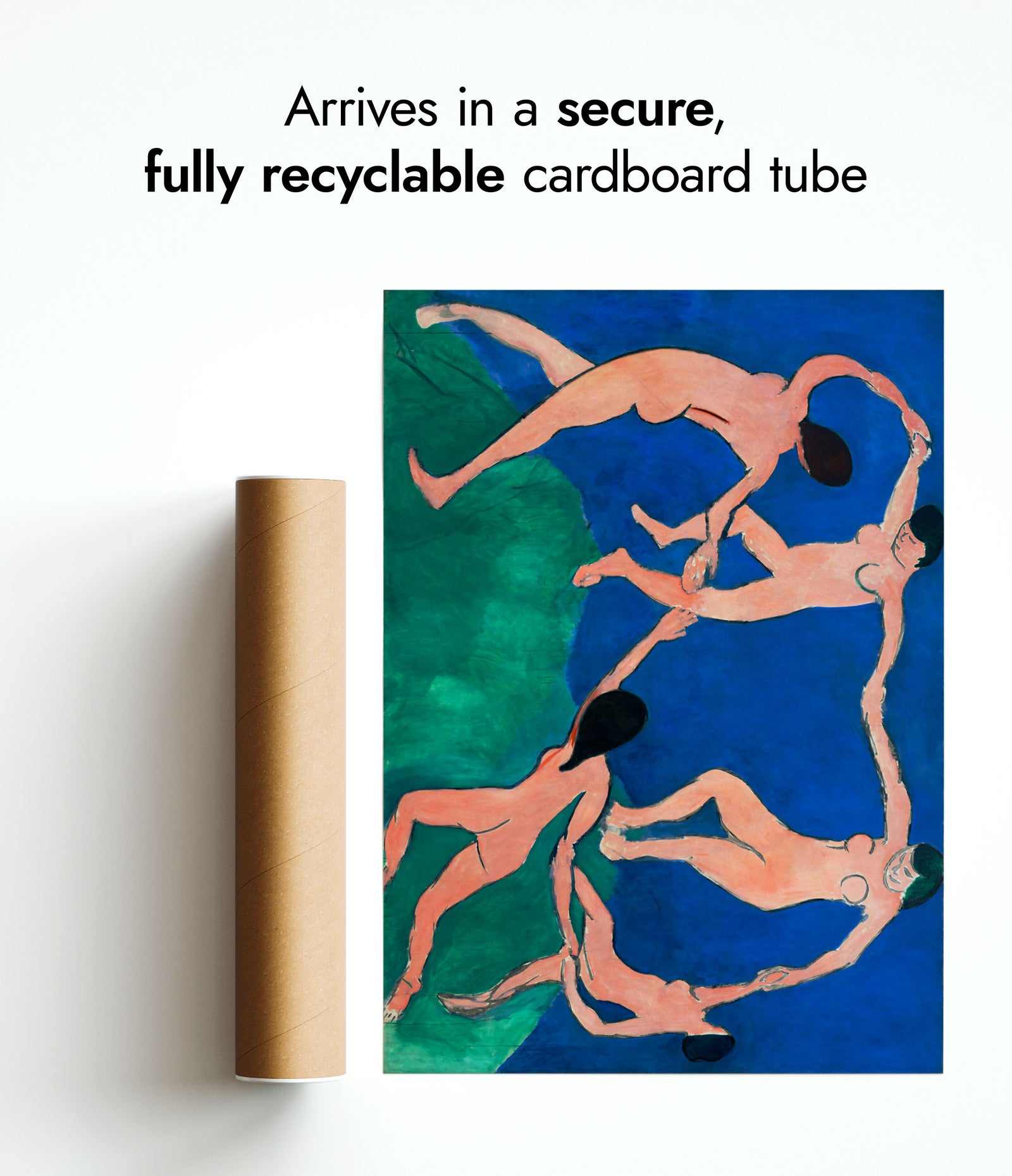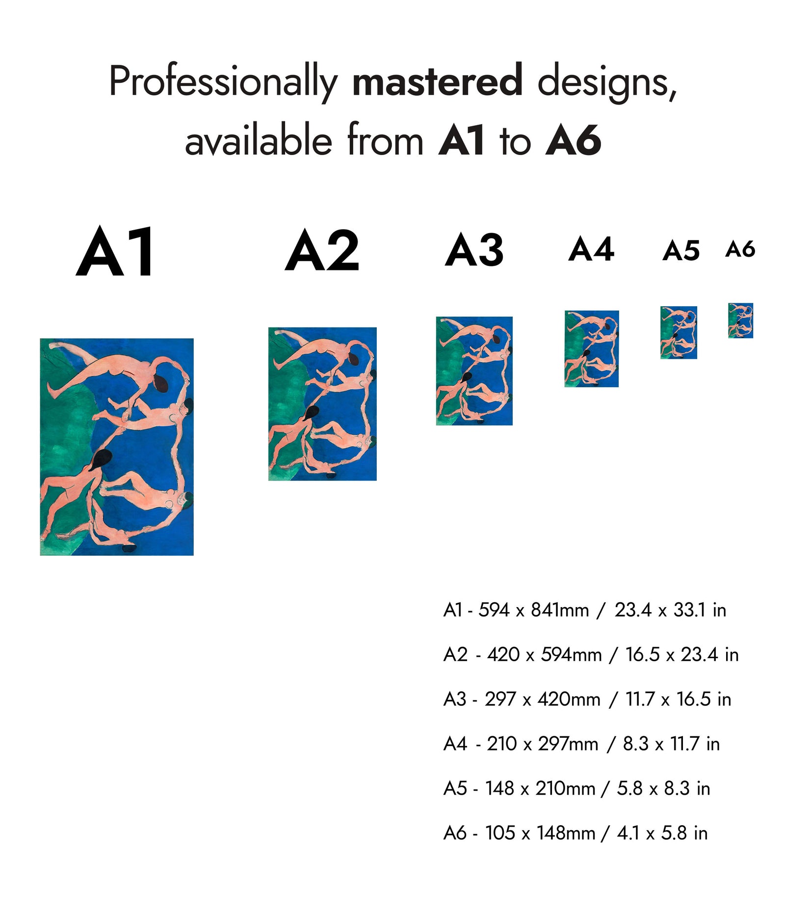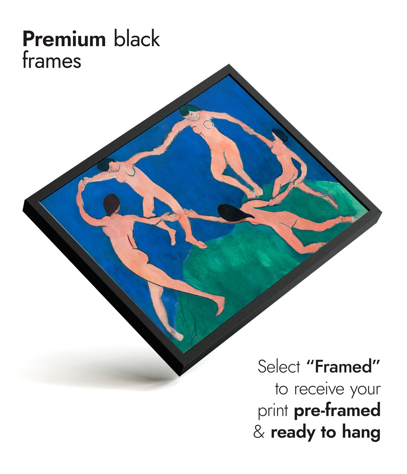 This "La Danse" poster by Henri Matisse captures the vibrant essence of Fauvism. Featuring five nude figures dancing in a circle against a deep blue and green backdrop, this artwork embodies movement and energy. The bold, expressive use of colour highlights Matisse's signature style, making it a striking addition to any space.