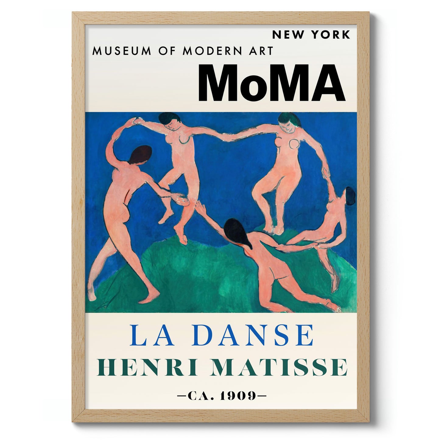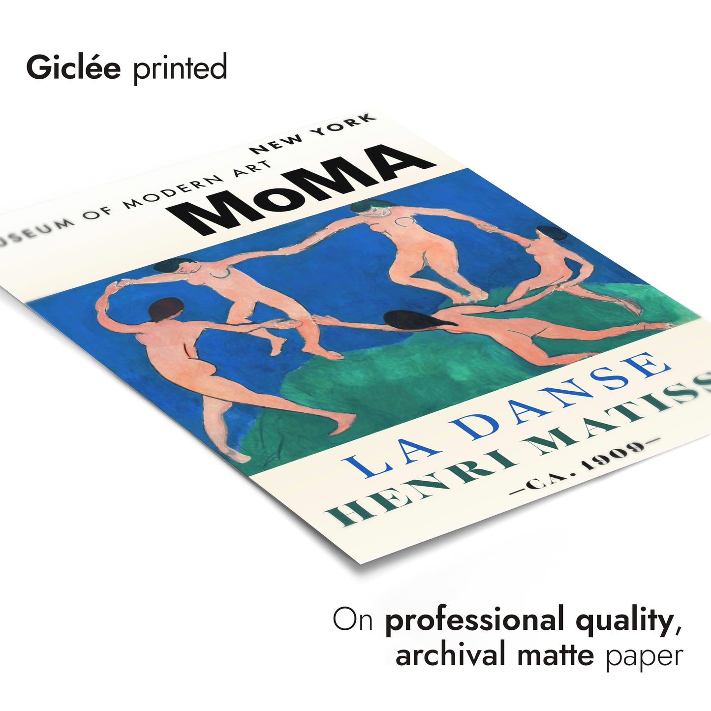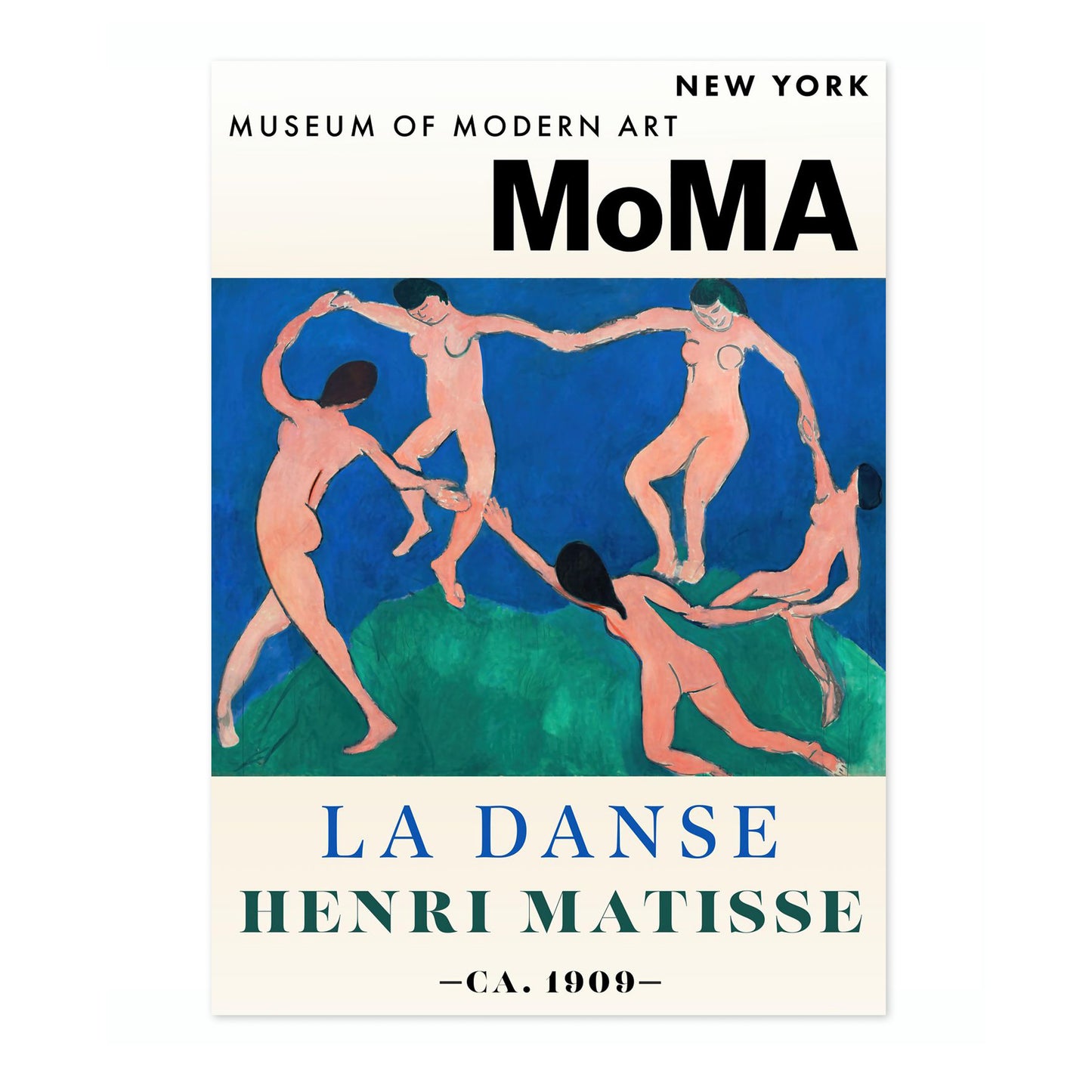 This poster of Henri Matisse's "La Danse" features dynamic figures in motion, their fluid forms echoing a joyful dance. Set against a deep blue and green backdrop, the painting captures the essence of Fauvism with its vibrant colors and expressive style. Perfect for art enthusiasts, this print embodies the energetic abstraction that defines Matisse’s iconic work.