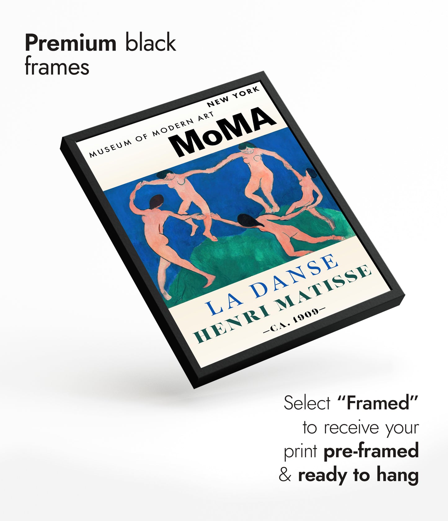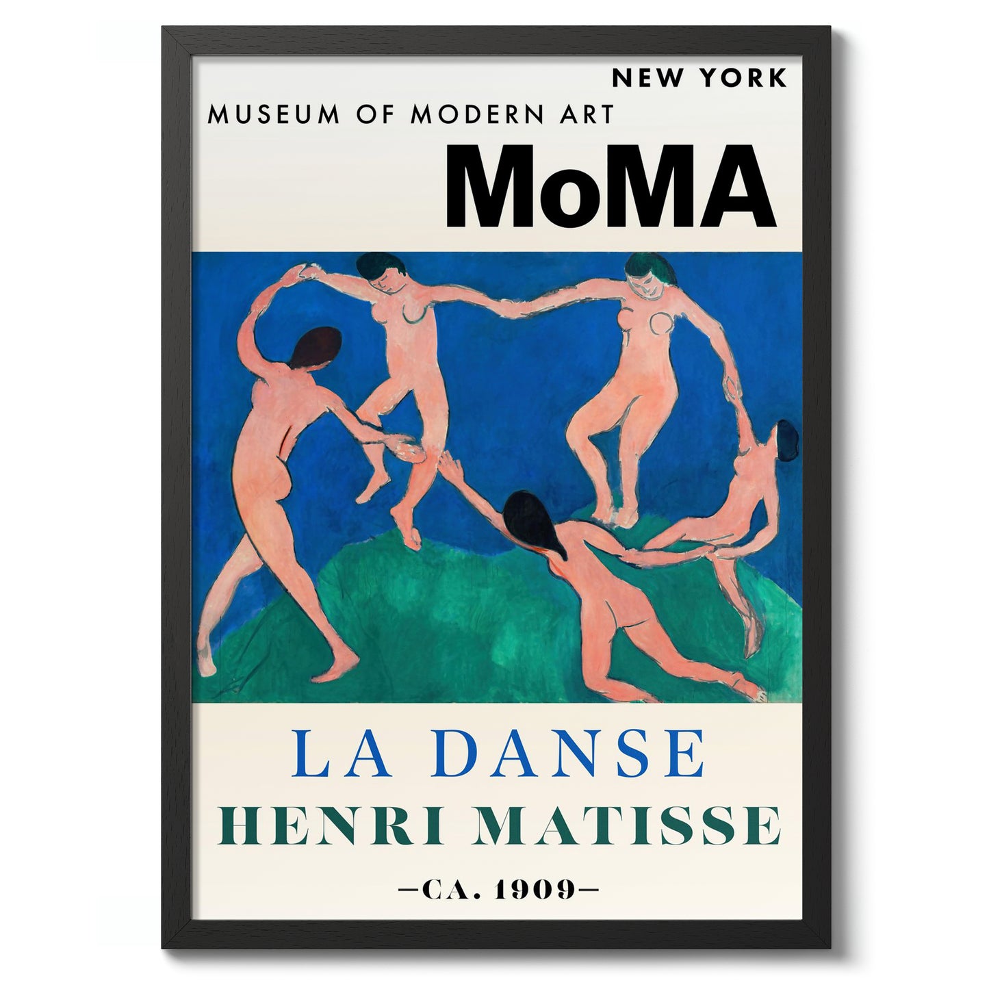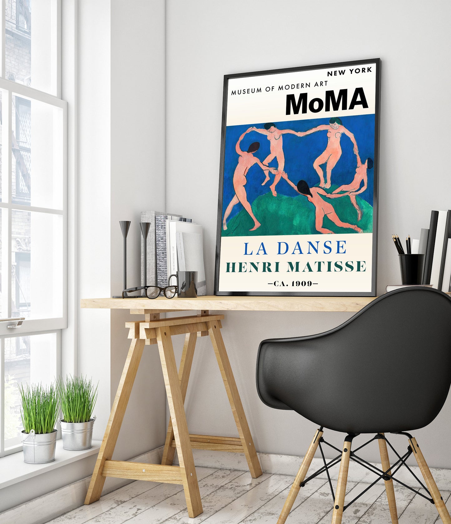This poster of Henri Matisse's "La Danse" features dynamic figures in motion, their fluid forms echoing a joyful dance. Set against a deep blue and green backdrop, the painting captures the essence of Fauvism with its vibrant colors and expressive style. Perfect for art enthusiasts, this print embodies the energetic abstraction that defines Matisse’s iconic work.